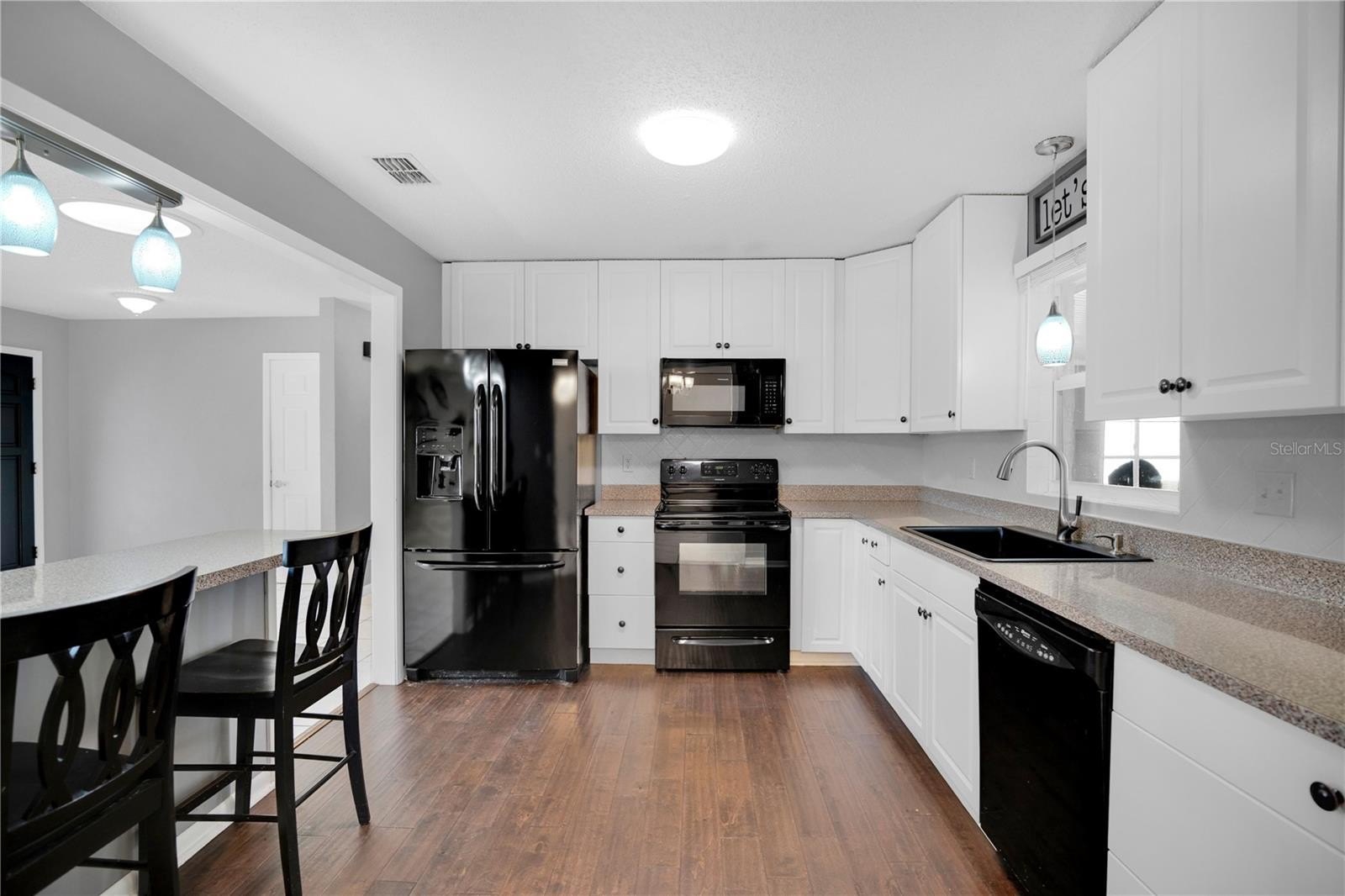 The main living areas connect seamlessly to the kitchen and dining spaces, creating an efficient and comfortable layout. The kitchen includes an eat-in bar, offering additional seating and a casual dining option that enhances both functionality and flow. A large laundry room located within the nicely sized garage adds everyday convenience along with valuable storage and workspace options.