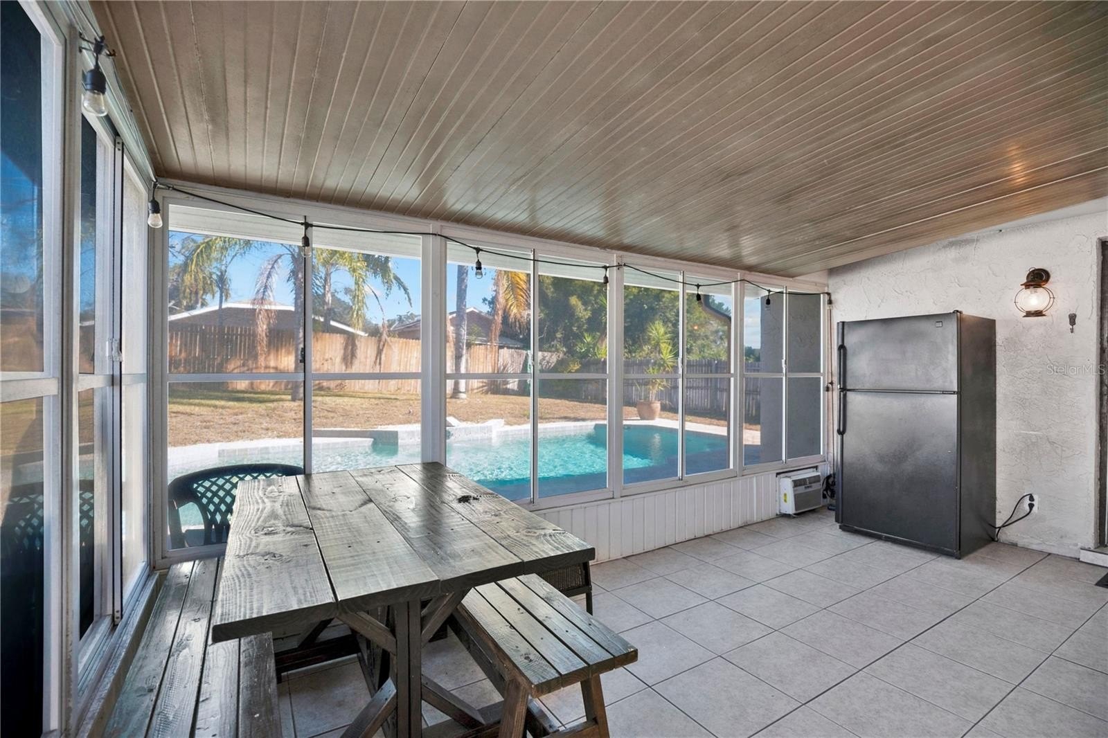 Outdoor living is a standout feature of the property. The private in-ground pool is surrounded by a spacious concrete deck, providing ample room for seating, lounging, and entertaining. A screened-in patio overlooks the pool, offering a comfortable covered area to relax while still enjoying the outdoor setting. The large, fully usable backyard is enhanced by tasteful landscaping that adds privacy and visual appeal, with plenty of space for a variety of outdoor uses, including recreation or gardening.