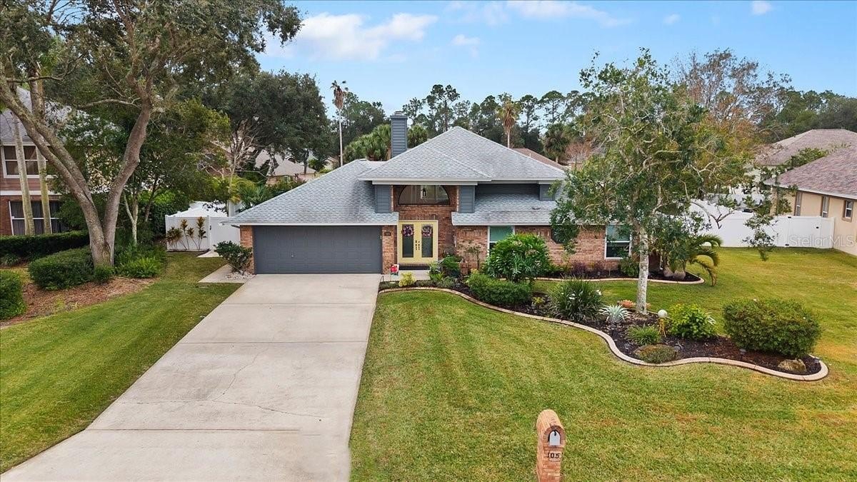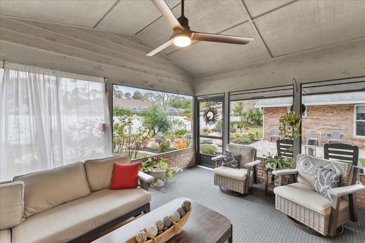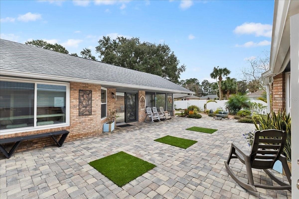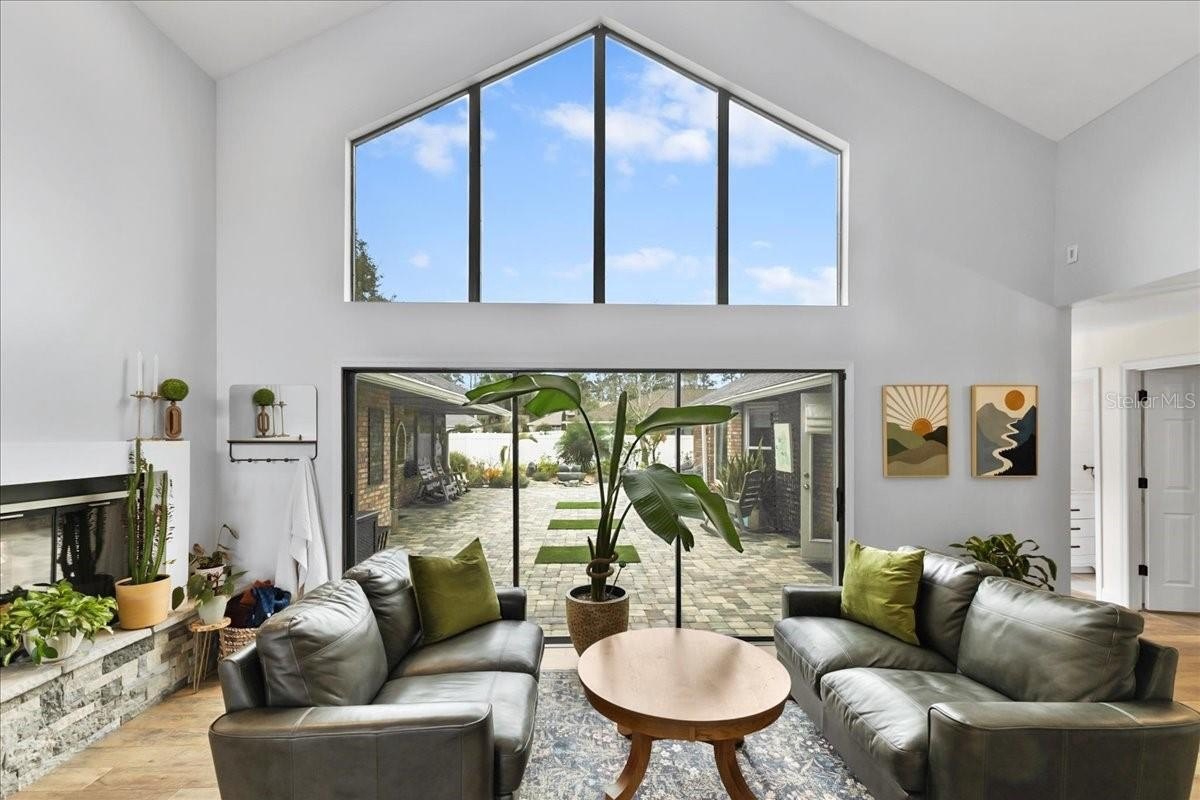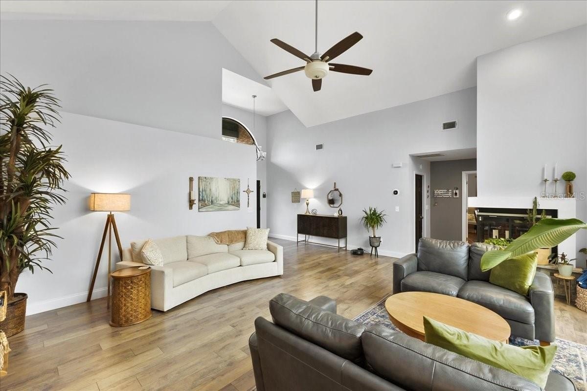 Move-in ready home in a sought-after gated community featuring soaring ceilings, abundant natural light, and a dual-sided wood-burning fireplace. Kitchen offers breakfast nook/bar, newer appliances (including KitchenAid dishwasher), and programmable Levolor blinds. Family room opens to an enclosed, rescreened lanai and covered patio. Extensive upgrades include vinyl replacement windows, two smart thermostats, upgraded electrical panel with generator transfer switch, added exterior/eave outlets, garage cabinetry with overhead storage, and floored attic storage. Outdoor improvements include paver courtyard, stone walkways, two paver patios, fountain, landscape lighting, curbed garden beds throughout, fresh exterior paint, and added gutters. Walking distance to the clubhouse and pool.