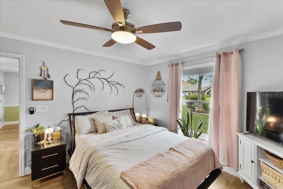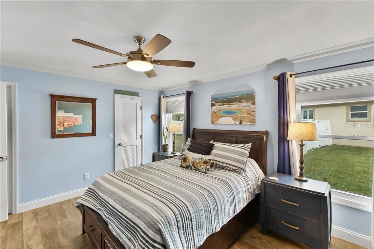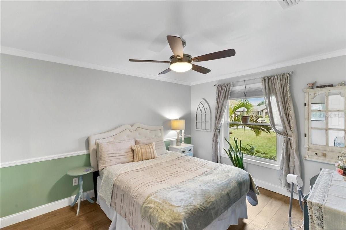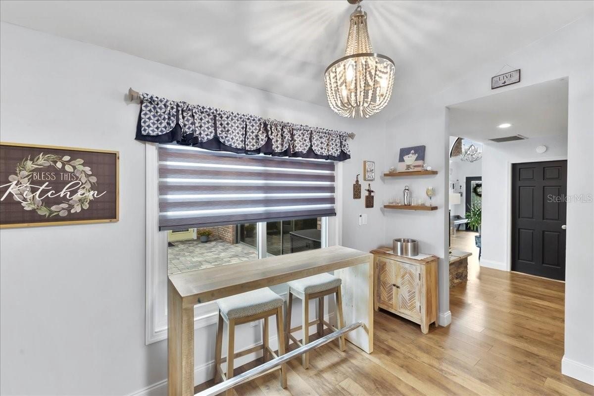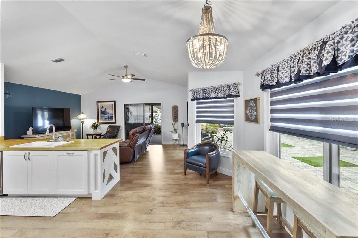 Move-in ready home in a sought-after gated community featuring soaring ceilings, abundant natural light, and a dual-sided wood-burning fireplace. Kitchen offers breakfast nook/bar, newer appliances (including KitchenAid dishwasher), and programmable Levolor blinds. Family room opens to an enclosed, rescreened lanai and covered patio. Extensive upgrades include vinyl replacement windows, two smart thermostats, upgraded electrical panel with generator transfer switch, added exterior/eave outlets, garage cabinetry with overhead storage, and floored attic storage. Outdoor improvements include paver courtyard, stone walkways, two paver patios, fountain, landscape lighting, curbed garden beds throughout, fresh exterior paint, and added gutters. Walking distance to the clubhouse and pool.