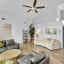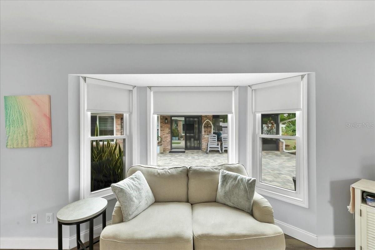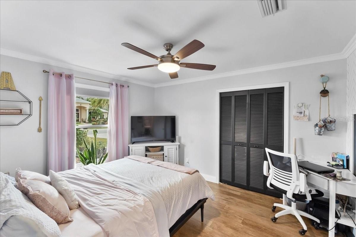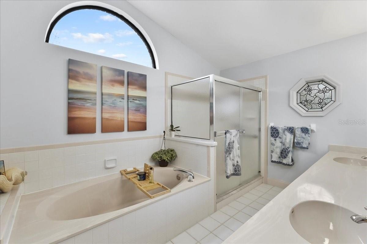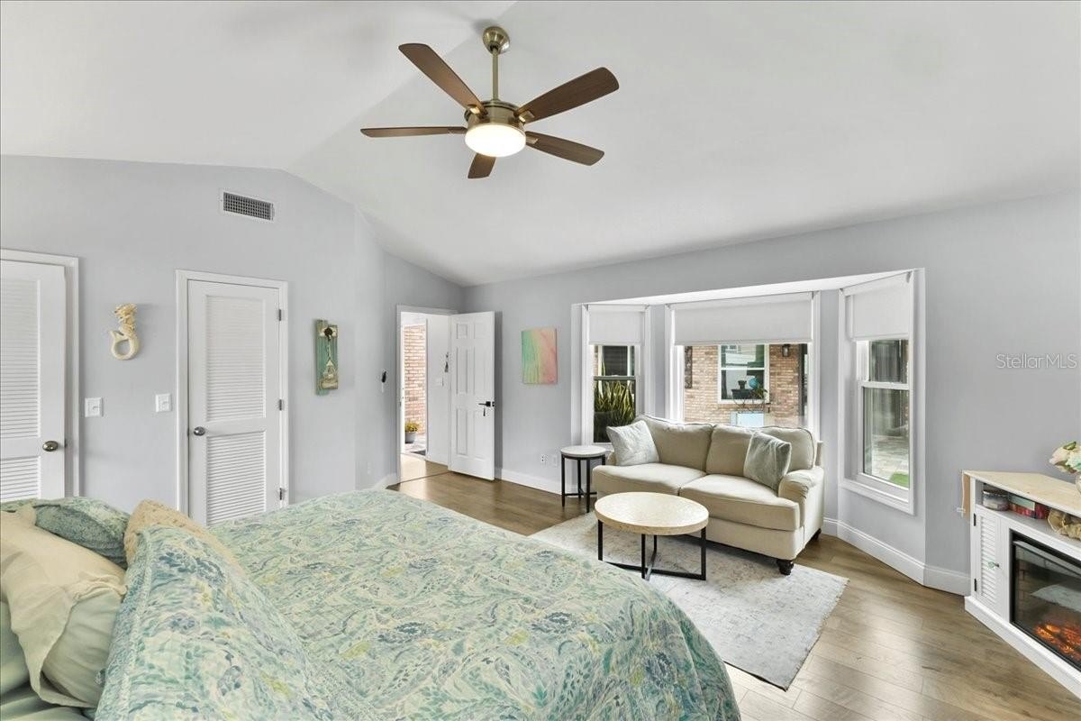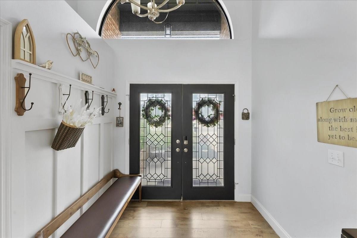 Move-in ready home in a sought-after gated community featuring soaring ceilings, abundant natural light, and a dual-sided wood-burning fireplace. Kitchen offers breakfast nook/bar, newer appliances (including KitchenAid dishwasher), and programmable Levolor blinds. Family room opens to an enclosed, rescreened lanai and covered patio. Extensive upgrades include vinyl replacement windows, two smart thermostats, upgraded electrical panel with generator transfer switch, added exterior/eave outlets, garage cabinetry with overhead storage, and floored attic storage. Outdoor improvements include paver courtyard, stone walkways, two paver patios, fountain, landscape lighting, curbed garden beds throughout, fresh exterior paint, and added gutters. Walking distance to the clubhouse and pool.