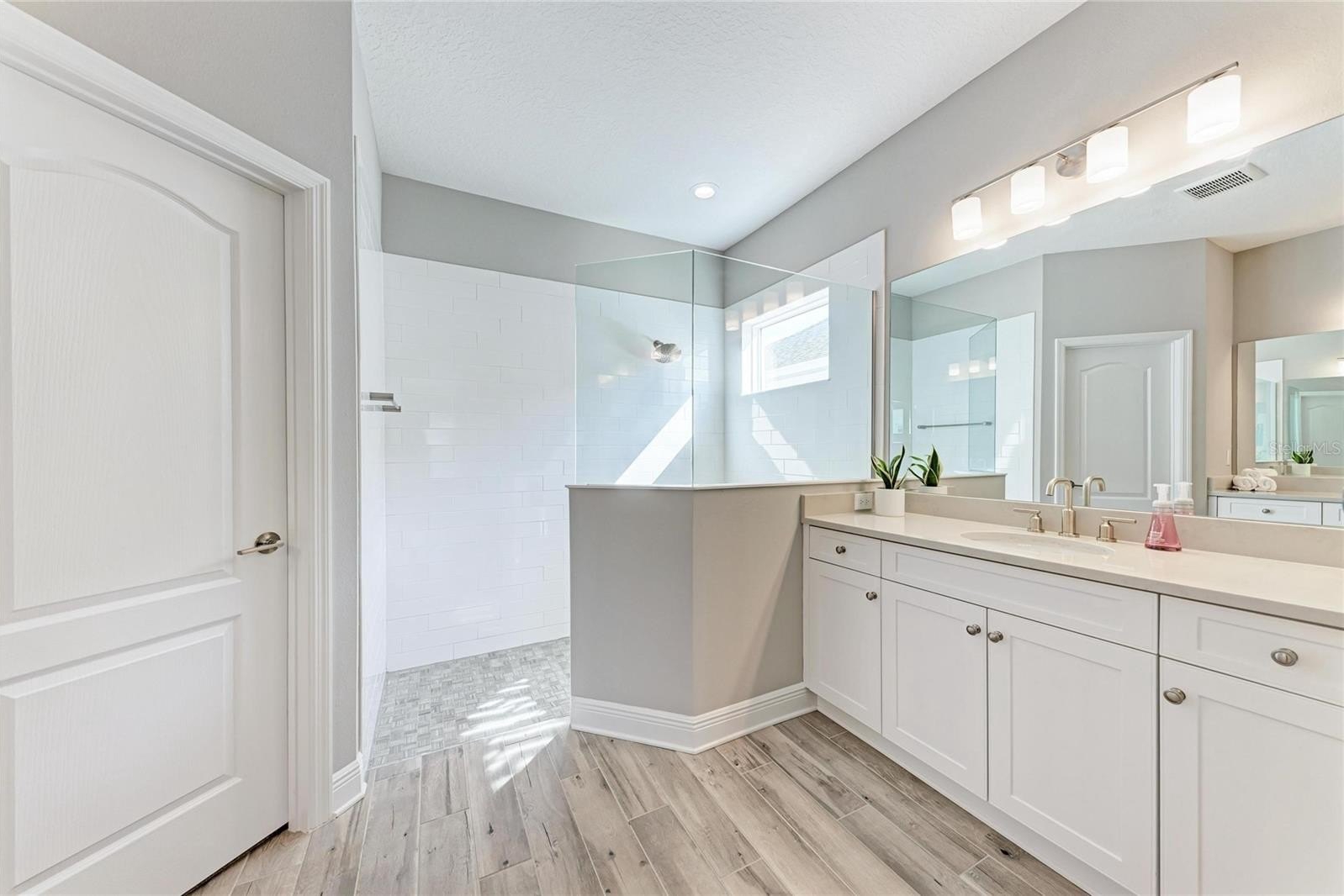 The elegant primary suite offers two large walk-in closets and a spa-like bath with dual sinks, upgraded snow shaker cabinetry, ample storage, a spacious walk in shower with custom tile work, and a private water closet.