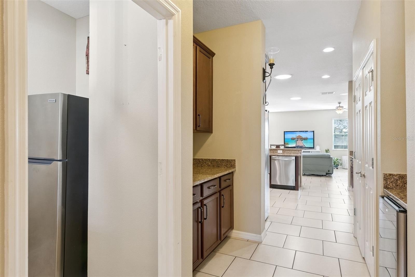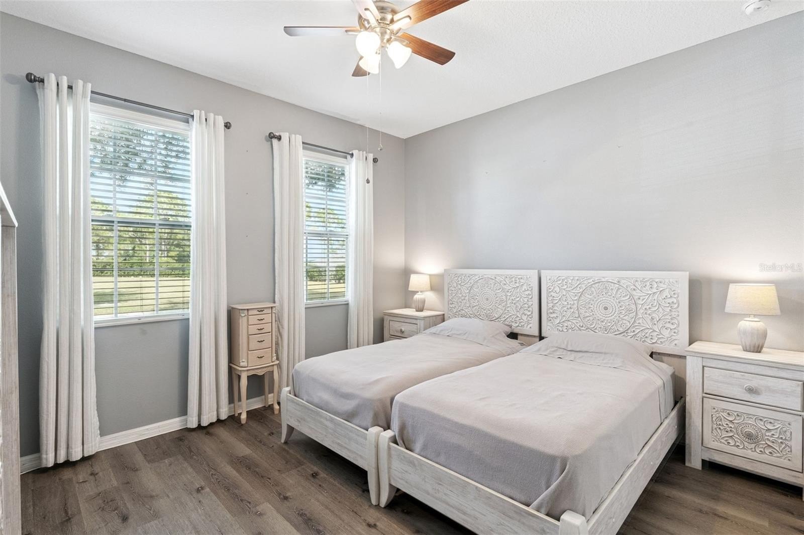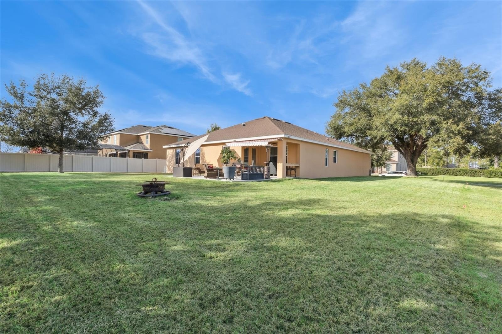 Enjoy beautiful views of the rolling hills of Clermont in this stunning 5-bedroom/3-bathroom home with 2,575 sq. ft.Built in 2014, this home is in the highly desired community of Vista Grande on a large lot. Enjoy extra parking in the extended paved driveway on the side of the house, beautiful landscaping, and shade from a mature oak trees out front and out back. Inside you will find a great open floorplan featuring formal dining, a spacious living room, and a gourmet kitchen at the center of the home.The kitchen features granite countertops, stainless steel appliances, cabinets with crown molding and a large kitchen island overlooking the family room. The living room has plenty of natural light and doors to the lanai and extended pad out back. The bedrooms are split, and the master suite is located near the back of the home. It has tray ceilings with crown molding, and a beautiful master bath with granite countertops, dual vanities, walk-in shower, garden tub, and large walk-in closet. There is a bedroom near the front of the home with a guest bath making it a perfect place for company or an in-law suite with its own space at the front of the house with a full small kitchen. Three more bedrooms are located on the opposite side of the home, giving plenty of privacy for everyone. Relax on the lanai and extended pad and watch the beautiful Florida sunsets, sunrises and/or Disneys fireworks at night! This home has been meticulously well maintained with a 2 year old roof, sealed pavers, exterior paiint redone (2023), replaced flooring in front bedroom to vinyl planks and two other bedrooms with wood flooring. This home won't lasts long so set up your private showing today!