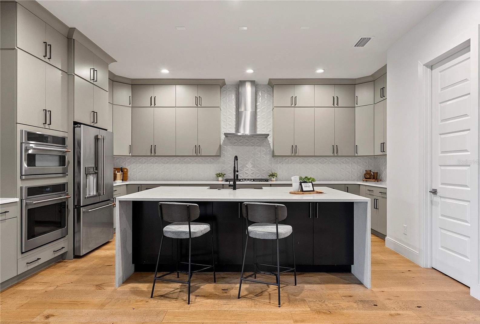 The open, light-filled interior features hardwired Ethernet throughout, tinted windows, a custom primary closet, and a spacious laundry room with washer and dryer included. The chef’s kitchen and living spaces flow seamlessly to the outdoor living area, where you’ll find an outdoor kitchen and a heated, fully automated saltwater pool—perfect for year-round entertaining.