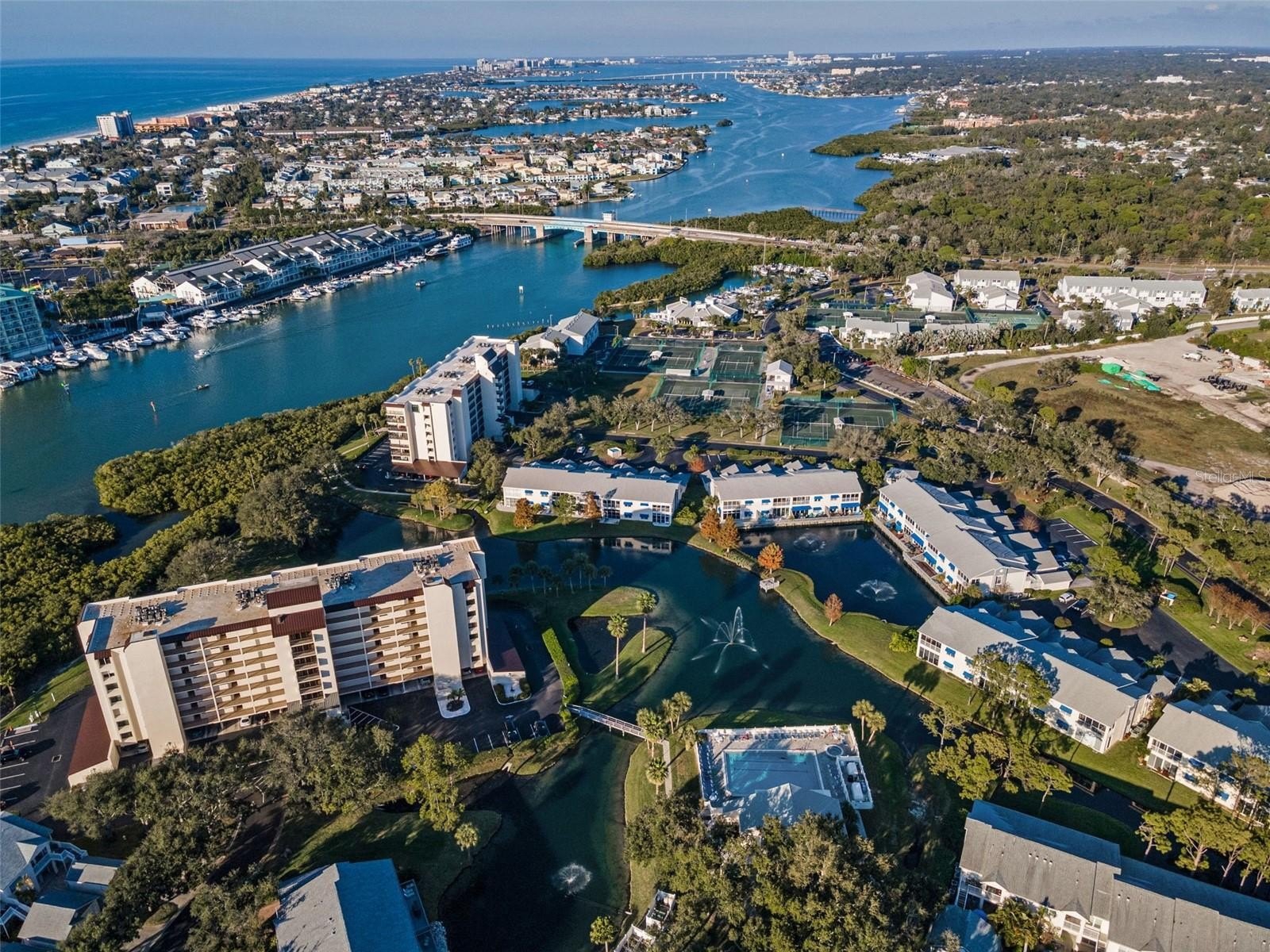 Experience the best of coastal Florida living in the highly sought-after SHIPWATCH community! Shipwatch is a private waterfront enclave with tropical landscaping, an Intracoastal Waterway setting, and RESORT-STYLE amenities. This spacious second-floor, two-bedroom, two-bath condominium includes a one-car GARAGE and a paver driveway with guest parking nearby. The VAULTED CEILINGS create an open and airy feeling as you enter the home. The living room features sliding glass doors that lead to a SCREENED-IN BALCONY overlooking a serene pond, offering a perfect place to relax. This split floor plan provides privacy, with a primary suite set apart from the guest bedroom. The primary bedroom includes sliding glass doors with direct access to the balcony. The oversized primary bathroom features a large walk-in shower and a spacious walk-in closet. The kitchen is thoughtfully designed with Corian countertops, a large kitchen sink, stainless steel appliances, and a lovely pond view. A dedicated closet houses the IN-UNIT WASHER AND DRYER, both of which are included. HVAC was installed in 2023. Situated on 54 beautifully landscaped acres, Shipwatch provides LOW-MAINTENANCE, resort-style living with exterior maintenance and grounds care included. The community completed the building's roof replacement and exterior painting in 2020. Residents enjoy an exceptional array of amenities, including 4 pickleball courts, 11 Har-Tru tennis courts with lessons available, 2 swimming pools (one heated), a hot tub, 2 clubhouses, a fitness room, walking trails, cornhole, a meeting room, a pro shop, an on-site restaurant, a private marina with deeded boat slips, dock access, and security. Shipwatch is a vibrant, active, PET-FRIENDLY, NON-AGE RESTRICTED community with FULLY FUNDED reserves per the HOA. The property is ideally located less than 2 miles from Indian Rocks Beach and just 8 miles from world-famous Clearwater Beach! Convenient travel is easy, with the closest airport approximately 11 miles away and Tampa International Airport just 23 miles away, placing the very best of Gulf Coast living, boating, dining, and coastal recreation right at your doorstep.