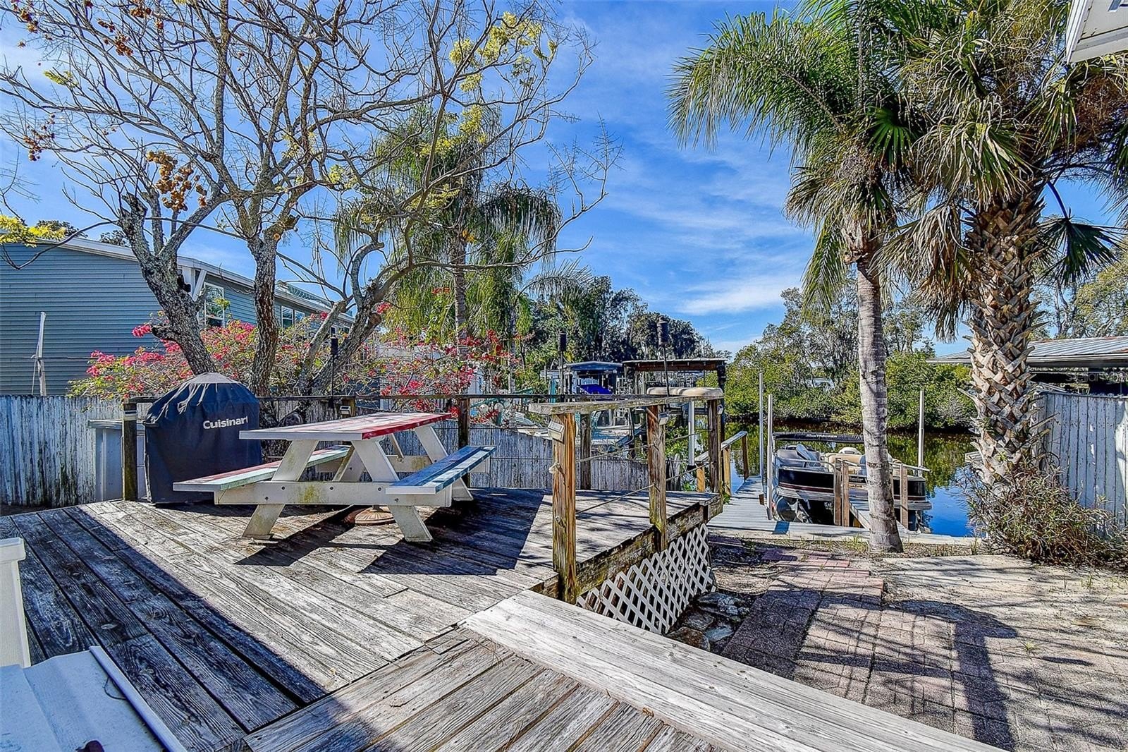 FULLY FURNISHED Turnkey, Perfect for AIRBNB/Vacation rental or Retirement living! ANCLOTE RIVER WATERFRONT PROPERTY with Direct Access to GULF OF MEXICO! With DOCK! NO FLOODING during storms. PRISTINE INTERIOR REMODELED by owner/contractor. Spacious 3BR PLUS Home Office. GARAGE plus 3 DRIVEWAYS, parking for 8-10 vehicles. Bring your boats, trailers, jet skis, golf cart, Harley, Room for ALL YOUR TOYS! After a day of boating drive right up onto your New private floating dock "wave armor" brand, can hold up to 22-28 ft. boat. You can go out during low tide approximately 2 ft. of water. Living on Florida’s nature coast, enjoy the wildlife and waterfowl including dolphins, otters, manatee! Walk 200ft to Pinellas Trail, walk to Pickleball courts. All with NO HOMEOWNER FEES, OWN YOUR OWN LAND NO LOT FEES!!!!! Enjoy this home in this tropical, peaceful, serene, quiet setting. Close to world famous Tarpon Springs Sponge Docks and Downtown Tarpon Springs that offers many restaurants and shops. Drive up to Rusty Bellies waterfront restaurant for lunch. Short ride to the Gulf. Close to everything in Tarpon Springs - Sunset Beach and Howard Park Beach. This home has LOTS OF IMPROVEMENTS – Stunning kitchen with Center Island, quartz countertops and plenty of cabinets and new LED lighting. NEW HVAC system, new water heater, New wood laminate flooring throughout, new lighting and fans, newer stainless steel appliances, newer windows, remodeled bathroom. 3 bedrooms and 2 full baths with a bonus room that can be used for an office, play room, craft room etc. also a Florida room with a window air conditioner that overlooks water. Home is also equipped with water softener and reverse osmosis system. Primary suite with wainscoting adding charm and a beach vibe. Dual sinks in hall bath. Walk out back and enjoy your view from the screened lanai or wood deck where you can watch nature at its finest. Come today and start living the Florida lifestyle! FULLY FURNISHED for a Turnkey VACATION RENTAL!