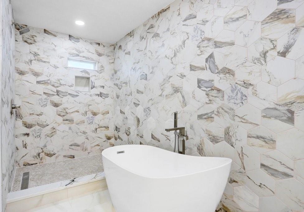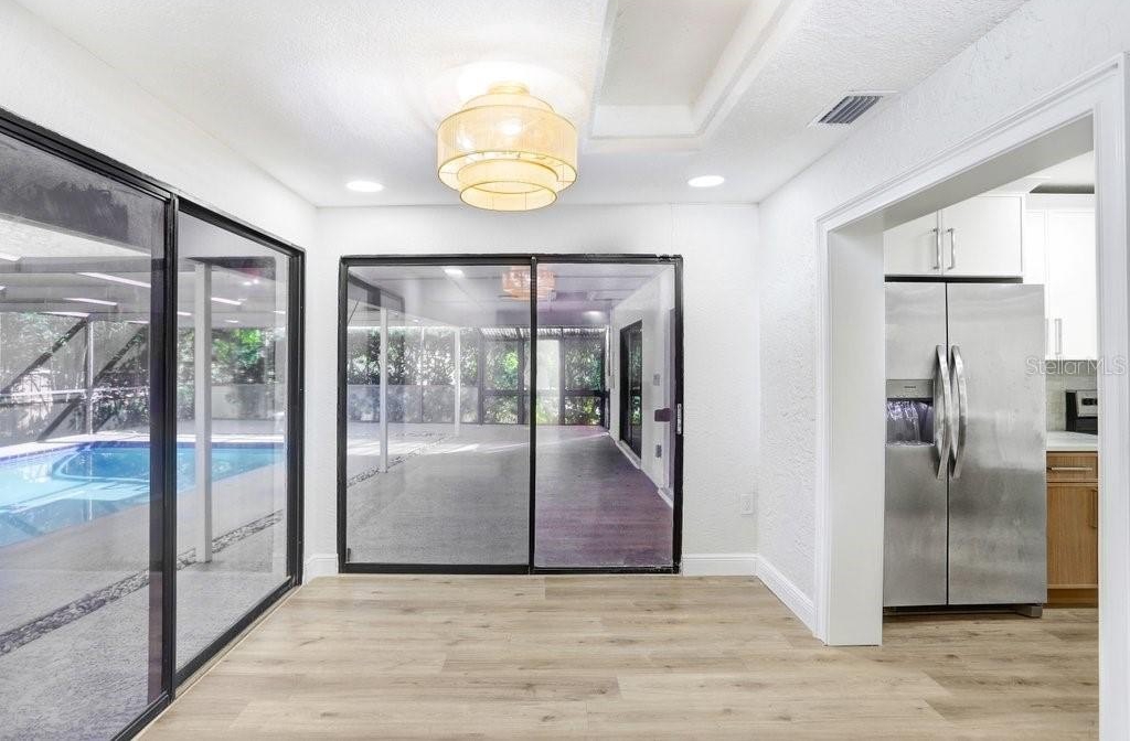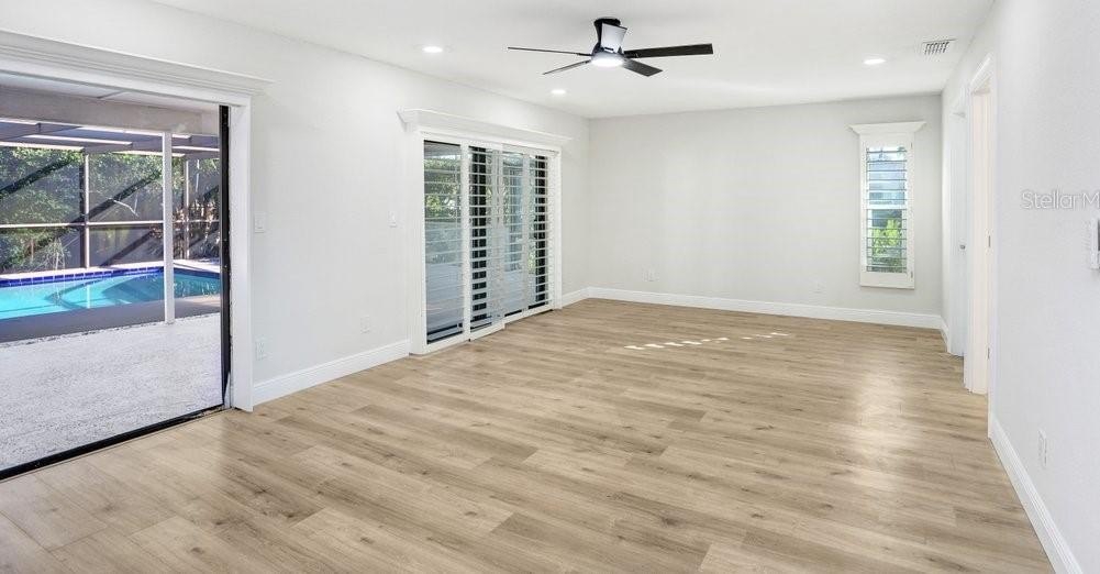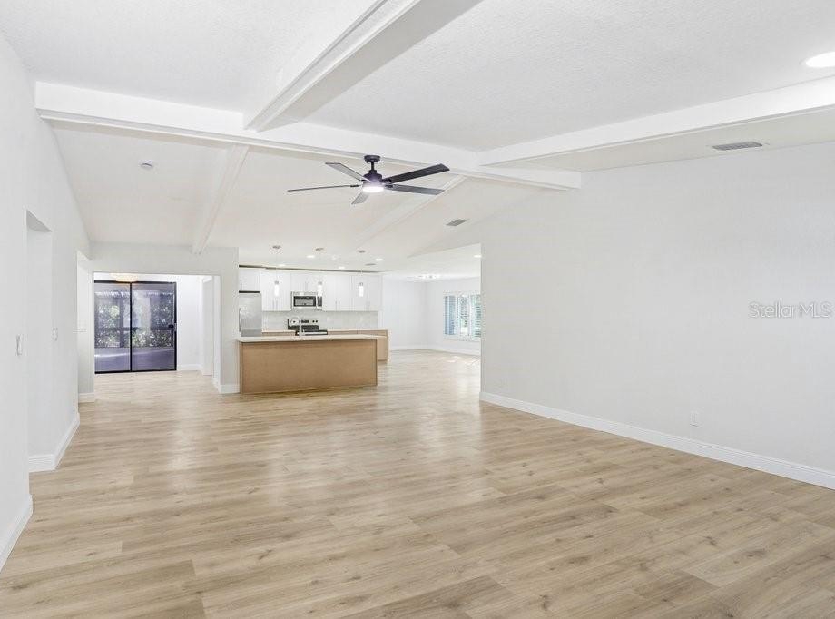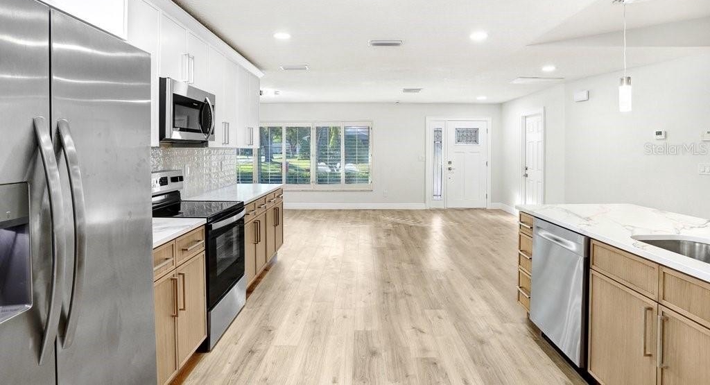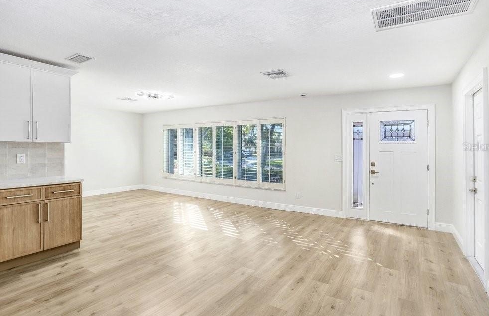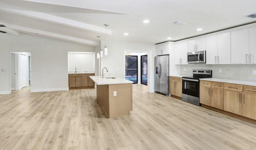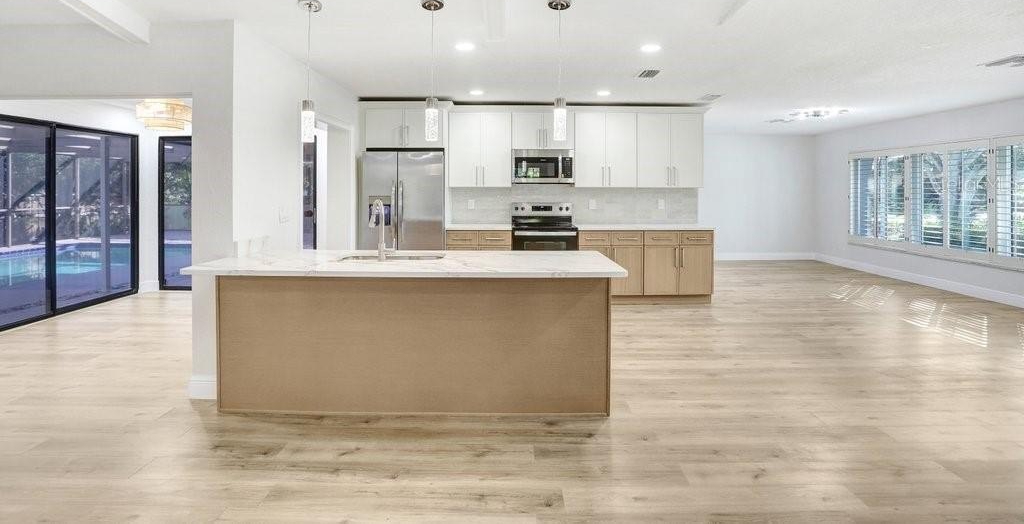 Nestled on a desirable corner lot in Feather Sound, this fully remodeled 4-bedroom, 2-bathroom home blends modern sophistication with everyday comfort. The open-concept living spaces connect seamlessly from the kitchen to the living room, dining room, and breakfast nook, creating an inviting flow for entertaining and daily living. The chef-caliber kitchen showcases quartz countertops, a tile backsplash, stainless steel appliances, two-tone cabinetry with ample storage, and a generous island that anchors the heart of the home. The living room features a striking wet bar and a tile fireplace that serves as a true focal point. The spacious master suite offers a walk-in closet and sliders that open to the pool area, while the ensuite delivers a spa-like retreat with his-and-her sinks crowned by exotic quartz countertops, a soaking tub, and a stand-alone shower highlighted by a hexagon tile feature wall. The remainder of the home includes three additional guest bedrooms (with the 3rd guest bedroom easily doubling as a bonus/media room), a guest/pool bathroom, a convenient laundry room, durable laminate flooring, fresh interior and exterior paint, plantation shutters, and a two-car garage. Step outside to the backyard oasis—a screened-in pool area within a fenced yard, enhanced by mature landscaping for privacy. Feather Sound is HOA-free and centrally located near dining, shopping, and the interstate, with the option to join the nearby country club to enjoy golf and the club’s full amenities.
