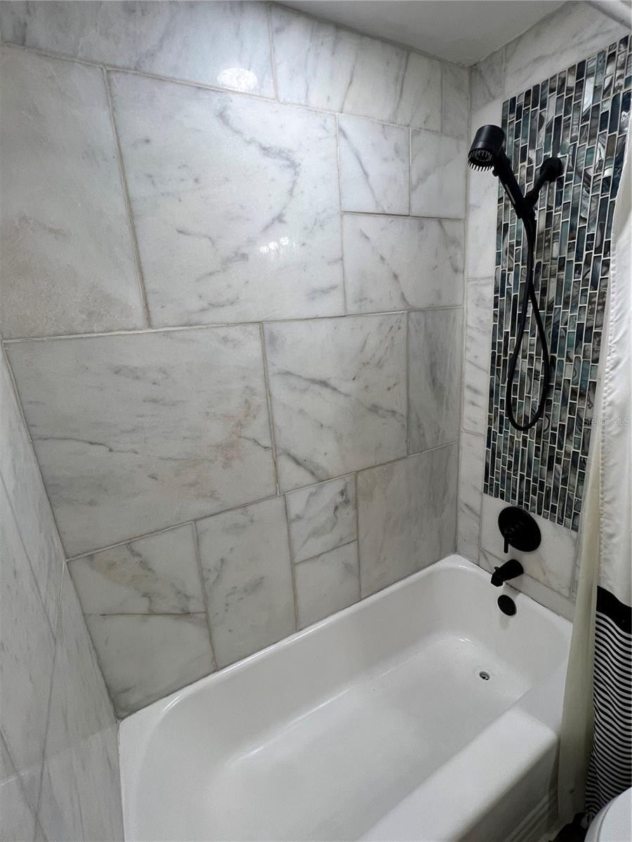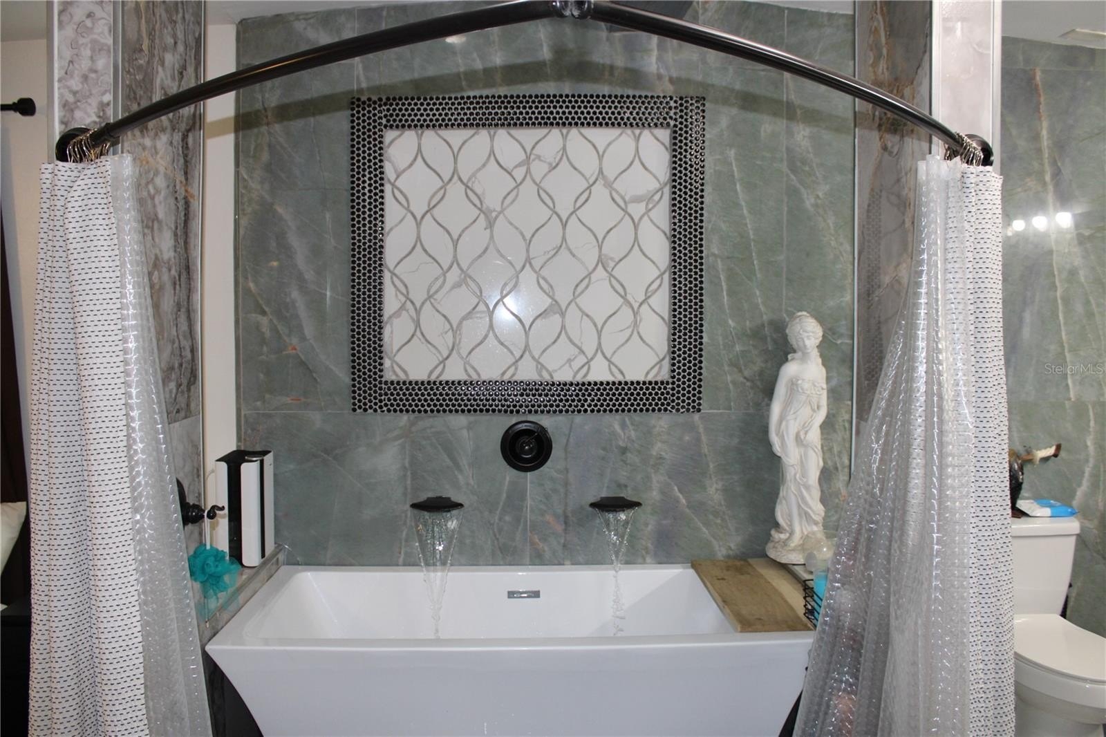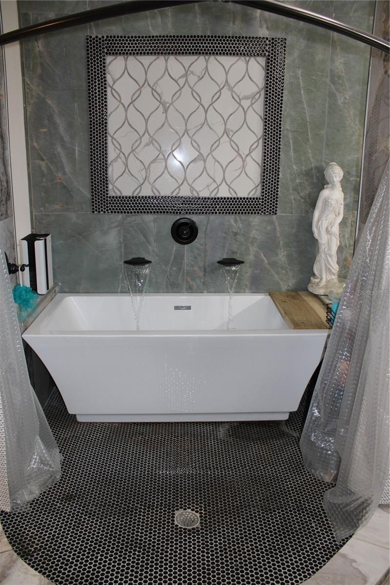 The primary suite features a fully customized en-suite bathroom, complete with a walk-in shower and spa-style soaking tub, creating a private retreat within the home.