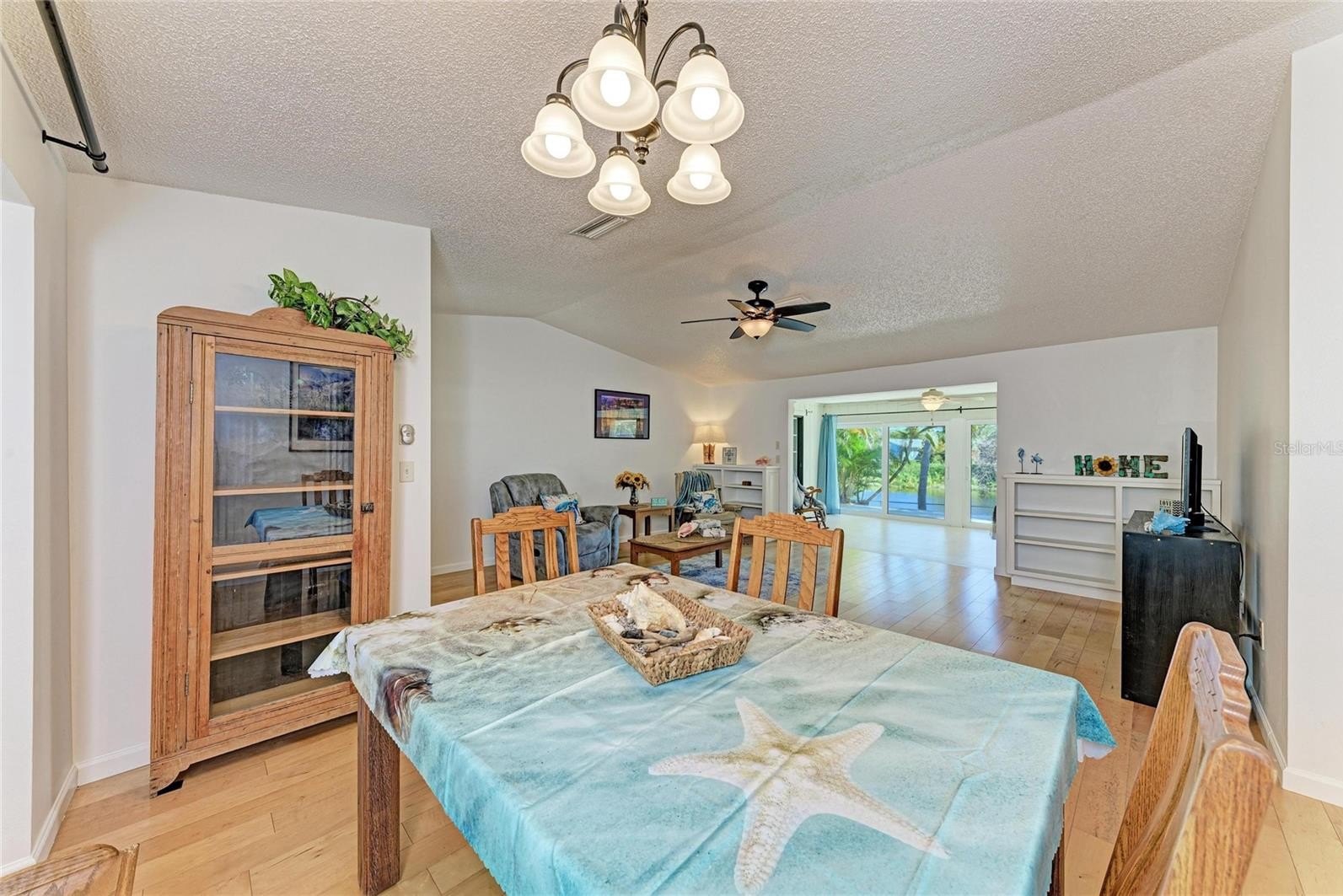 Inside, the double-door entry opens to soaring cathedral ceilings, engineered wood flooring, and bright, open living spaces with calming views through oversized sliding glass doors. The split-bedroom floor plan offers both privacy and functionality, with a dedicated dining room, family room, and interior utility room. The updated galley-style kitchen features granite countertops, newer cabinetry with large drawers, a pantry, stainless steel appliances, recessed lighting, and an eat-in area with bar seating—perfect for everyday living and entertaining.