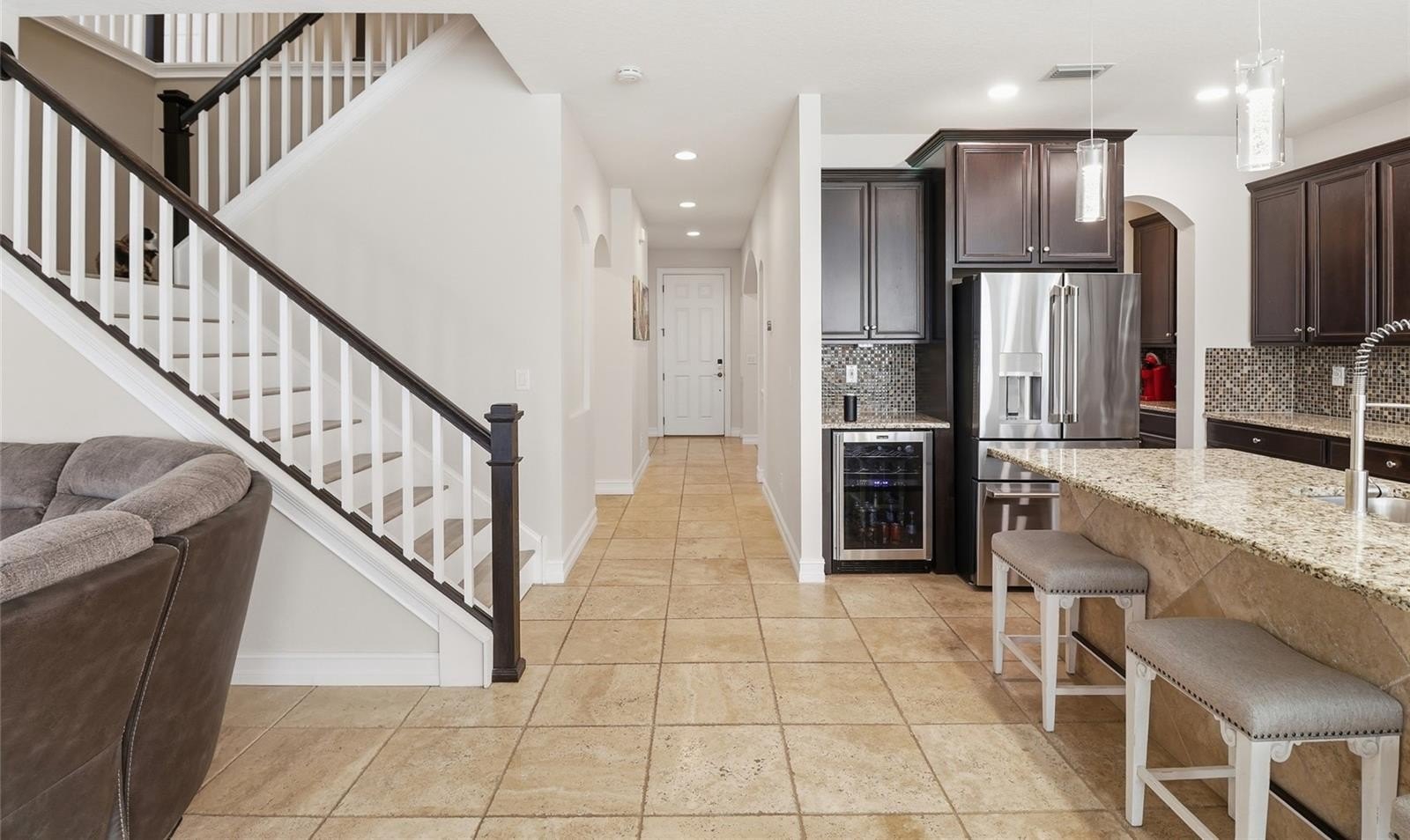Step through the front door and you’re welcomed by a thoughtfully designed layout. A private office sits to the right—perfect for working from home—while a formal dining room or additional living space anchors the left. Tile floors carry you through the main living areas, leading you past a butler’s pantry and spacious walk-in pantry and into the heart of the home.