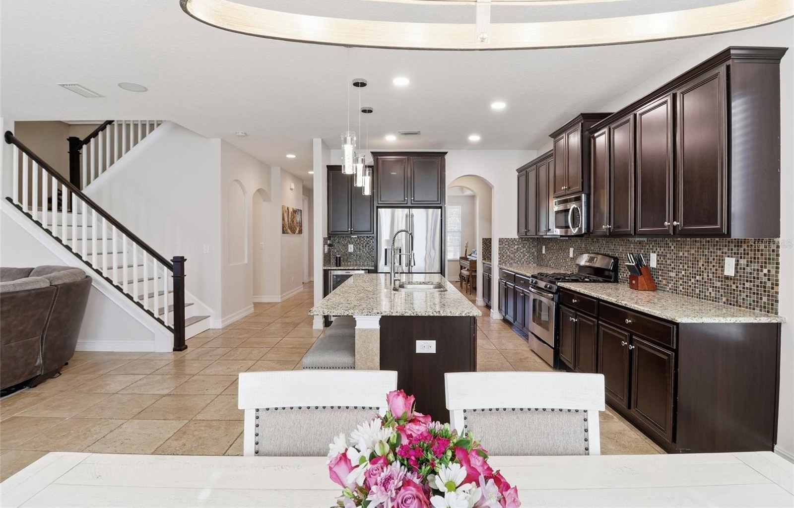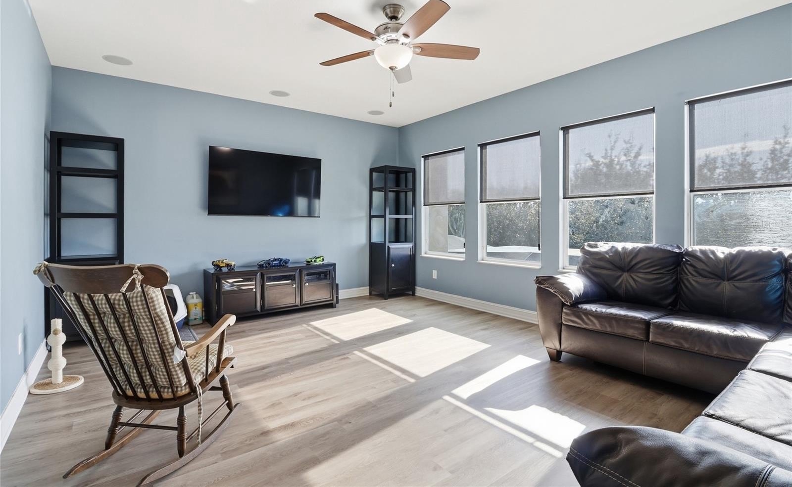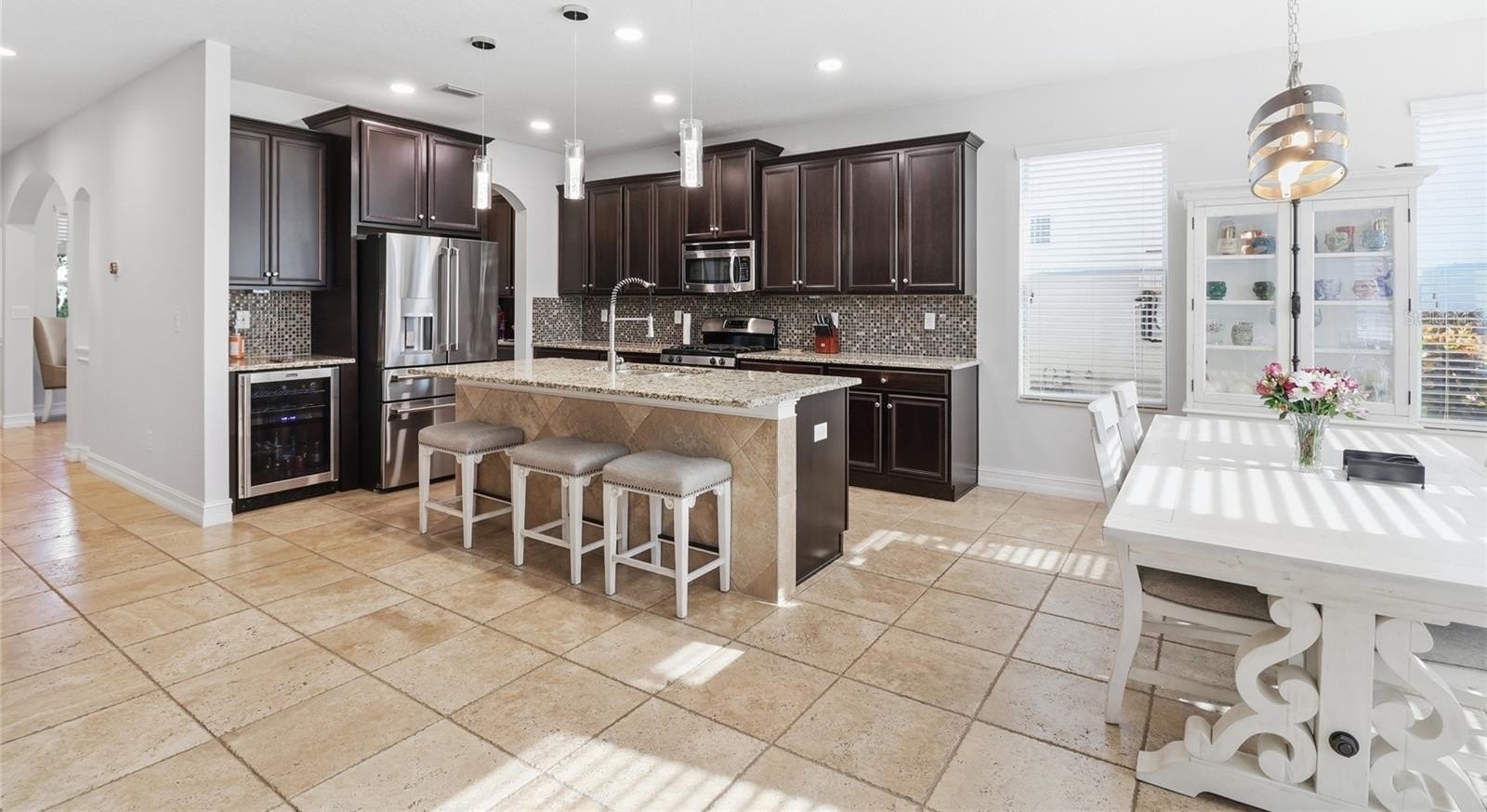 The open-concept kitchen features café appliances, a wine fridge, ample storage, and seamless sightlines to both the family room and casual dining area—ideal for everyday living and entertaining alike. Surround sound, ceiling fans, and abundant natural light enhance the space, while French doors invite you outside to the backyard oasis.