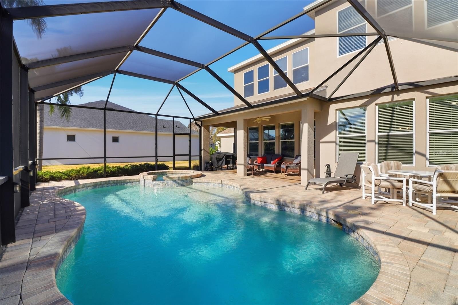 Out back, enjoy a wide lake view from your covered patio, complete with a gas grill hookup. The heated saltwater pool offers a sun shelf and spa, all enclosed with brand-new screens—creating a private retreat designed for year-round enjoyment.