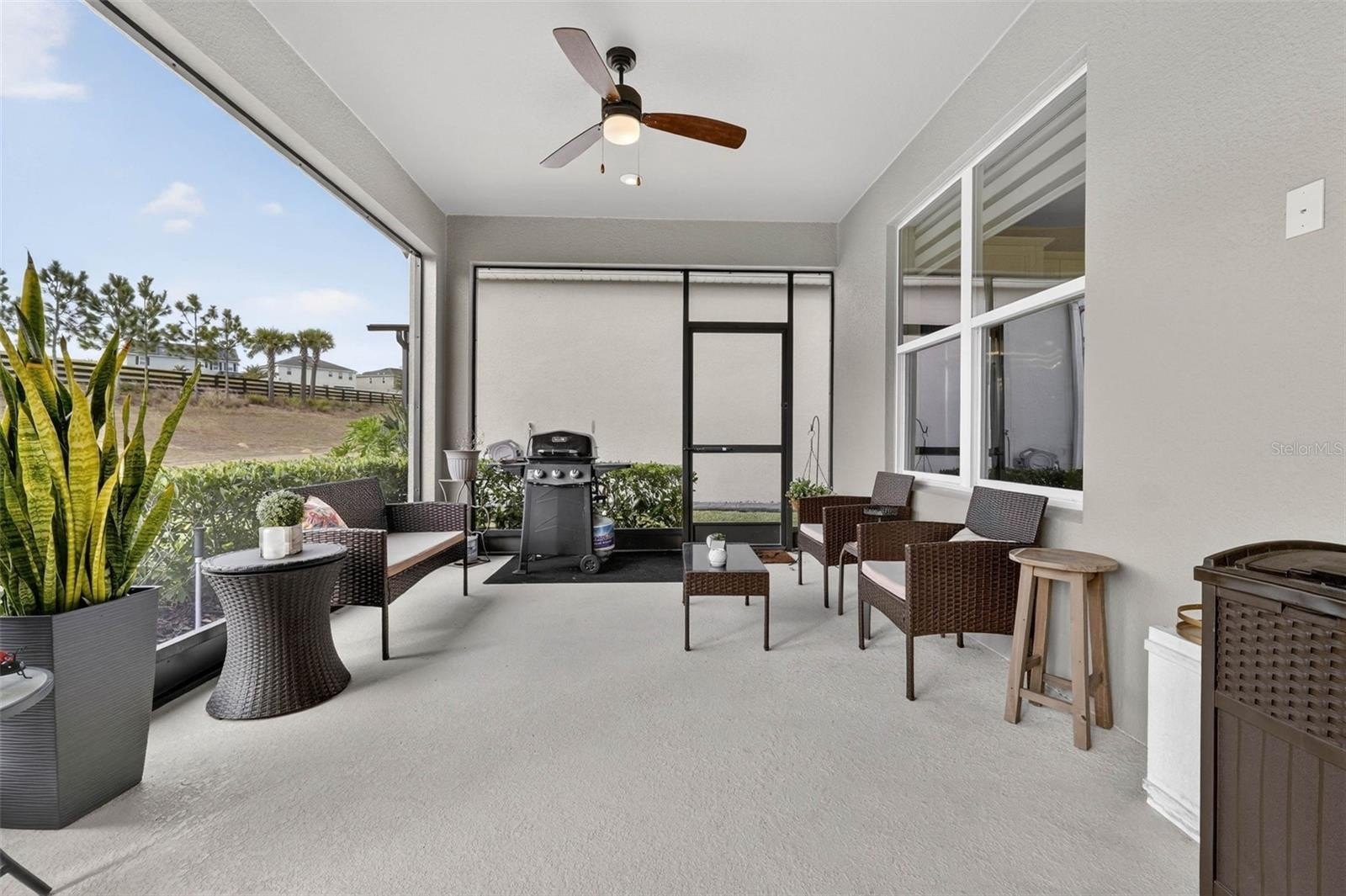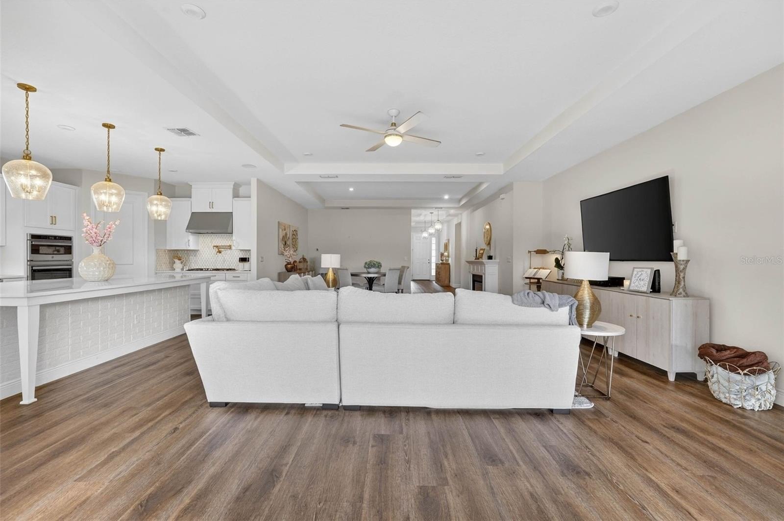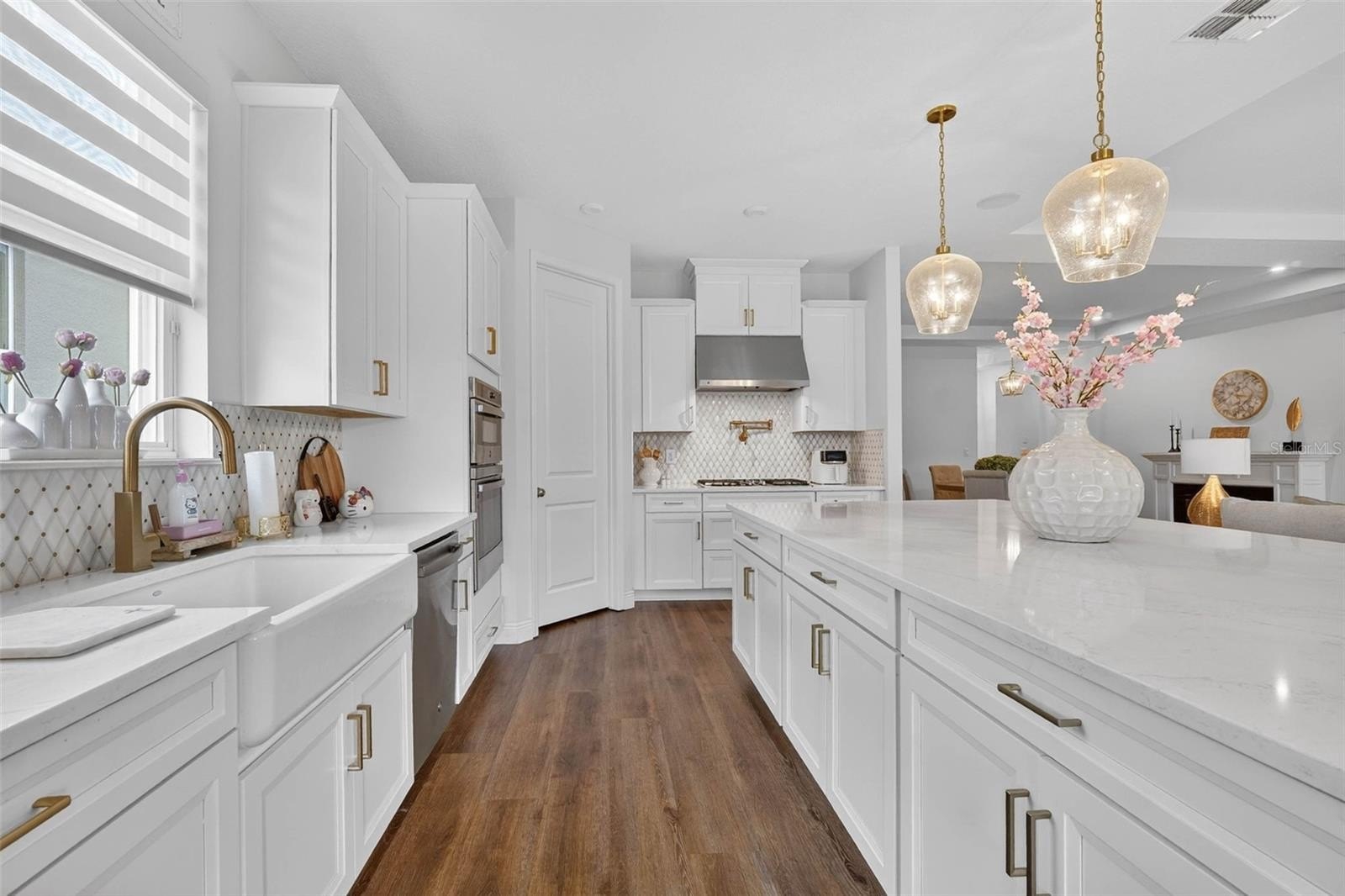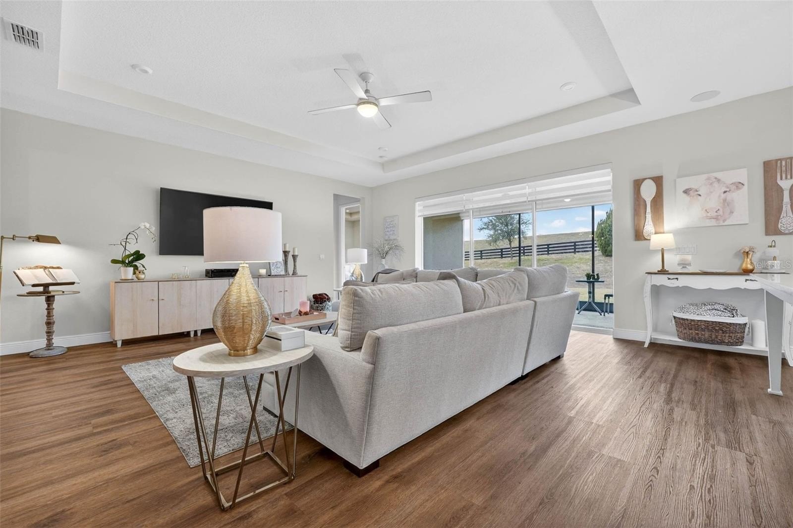 Exquisitely maintained, Taylor Morrison-built home in the highly coveted Canyons at Highland Ranch, offering 4 bedrooms, 3.5 baths, 2,713 sq. ft. of living space and a 3-car tandem garage! Designed for both elegance and comfort, this home features luxury vinyl flooring throughout the main living areas and bedrooms, an expansive open-concept layout, and a stunning living room accented by a tray ceiling, electric fireplace, and surround sound system. The gourmet kitchen is a chef’s dream, showcasing stainless steel appliances including a cooktop and built-in wall oven, quartz countertops, farmhouse sink, oversized island, and designer pendant lighting—perfect for entertaining. The private primary suite is a true retreat with a tray ceiling and a spa-inspired en suite bath featuring a walkthrough shower, soaking tub, double vanity, water closet, and a spacious walk-in closet. One secondary bedroom with French doors could easily double as an office or flex space, while the remaining two bedrooms each feature their own en suite baths, providing exceptional privacy for family and guests. Step outside to the screened lanai and take in tranquil conservation views with no rear neighbors. Residents of Highland Ranch enjoy resort-style amenities including a pool, splash pad, cabana, and basketball and volleyball courts, along with convenient access to the South Lake Trail, Turnpike, schools, shopping, and dining. This exceptional home is a must-see—schedule your private showing today before this rare opportunity is gone. (Be sure to enjoy the reality of this being your home by viewing the 3D Virtual Tour.)