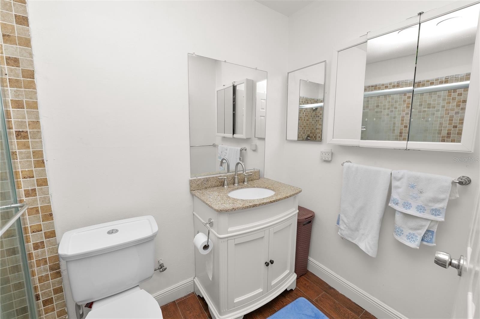 Upstairs, the guest bedrooms are comfortably sized, each with double-wide closets, and one with a walk-in closet. The guest bathroom features a tiled walk-in shower with glass sliding doors, a single vanity, and a medicine cabinet.