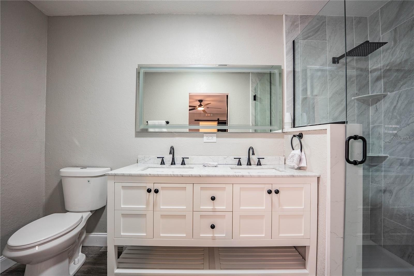 The open living area flows seamlessly into a stunning kitchen featuring white shaker cabinetry, stainless steel appliances, stone countertops, and stylish tile backsplash, perfect for everyday living and entertaining. Both bathrooms have been completely remodeled with contemporary vanities, designer tile, and sleek black hardware.
