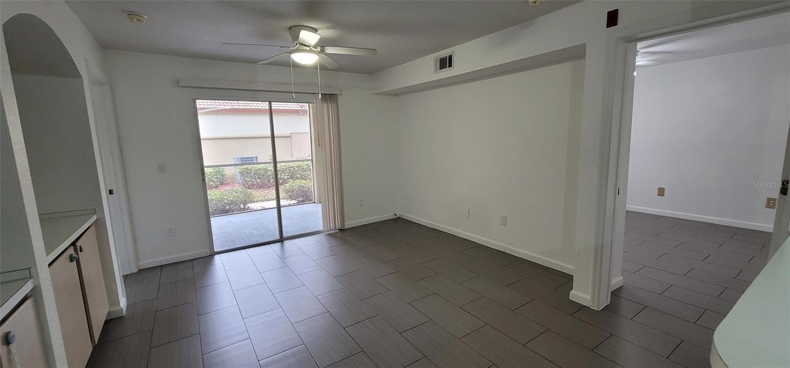 The unit features wood-look ceramic flooring throughout, combining durability with a modern aesthetic. A private one-car garage with direct access to the unit provides added convenience and security. The screened porch includes a large storage closet, ideal for additional organization.