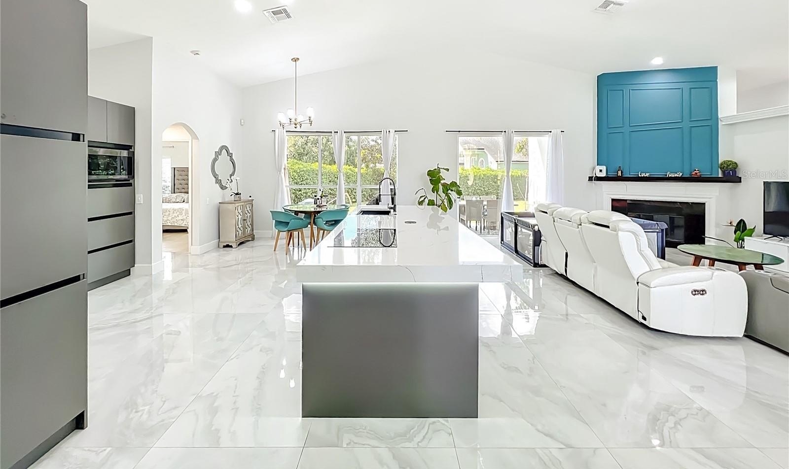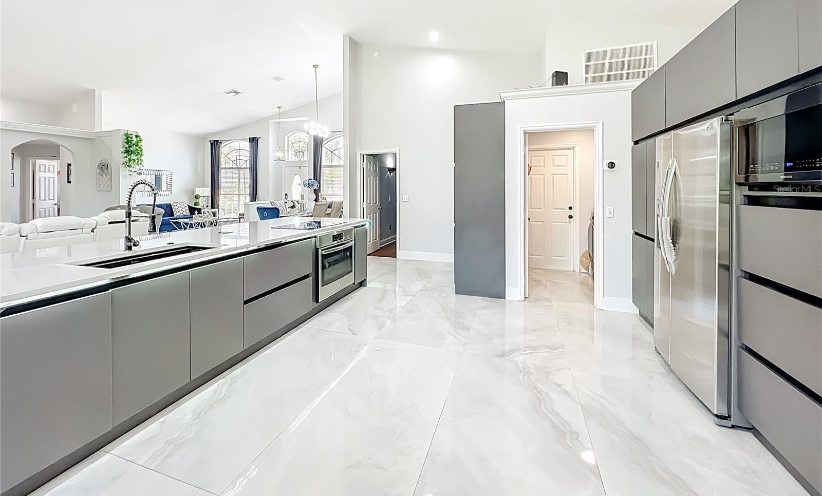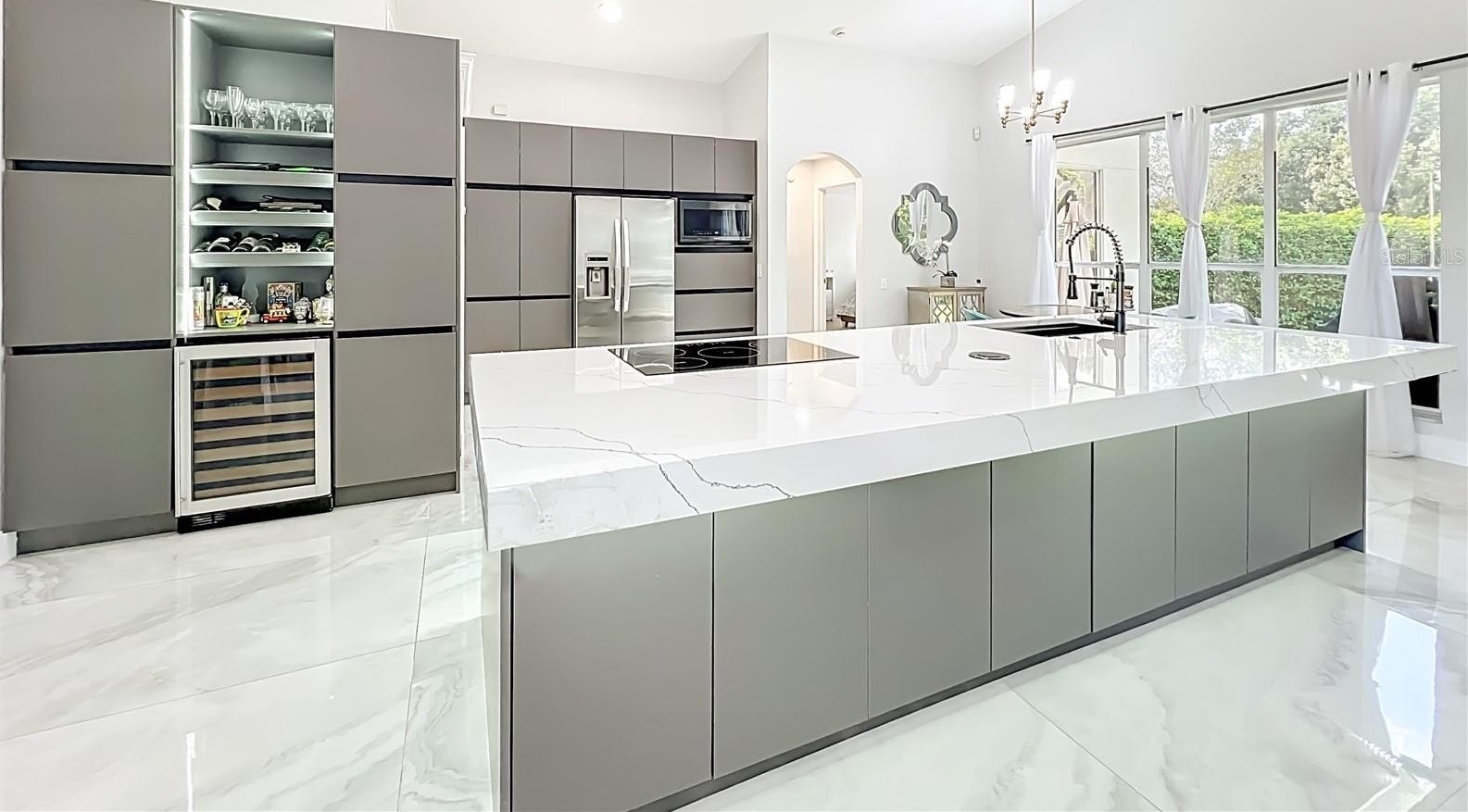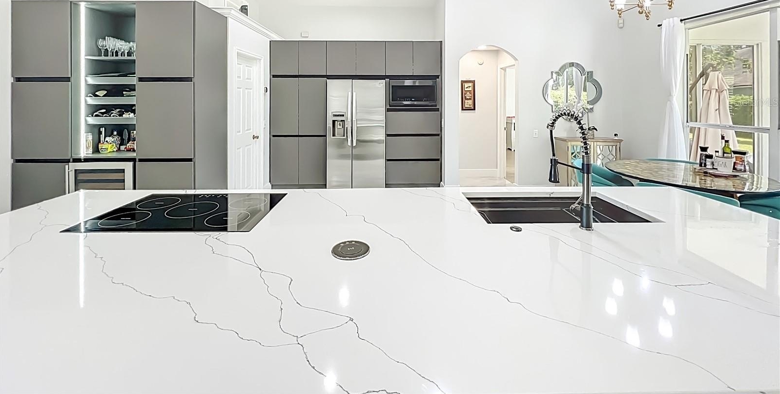 One or more photo(s) has been virtually staged. Beautifully updated corner-lot home on a quiet cul-de-sac in an intimate community of just 99 homes. Features an impressive 11.5-ft quartz kitchen island, built-in stainless steel appliances, a wine fridge, and a bright open floor plan. Main living areas showcase oversized 64x38 porcelain tile, while bedrooms feature new luxury vinyl plank flooring.