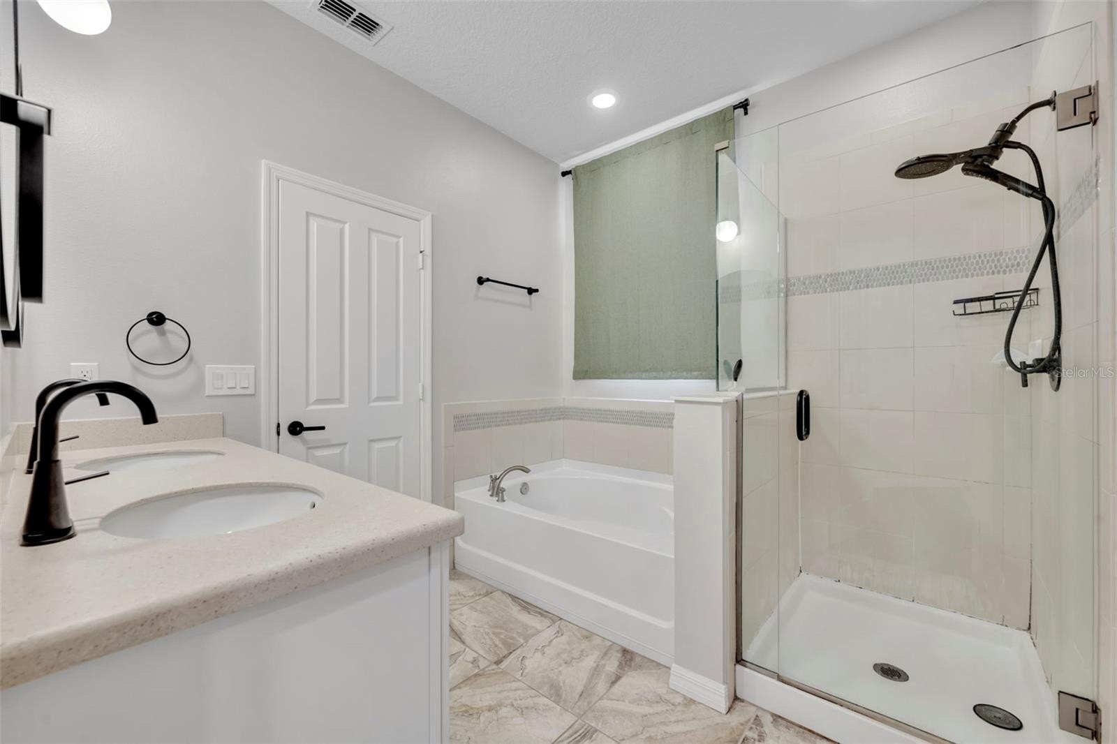 The primary suite offers serene pool and conservation views, direct patio access, and a spa-like bath with dual vanities, soaking tub, walk-in shower, and walk-in closet. Two secondary bedrooms share a hall bath with a large vanity and shower, while the third bedroom features a walk-in closet. A dedicated office or 4th bedroom provides flexibility, along with additional hallway storage.