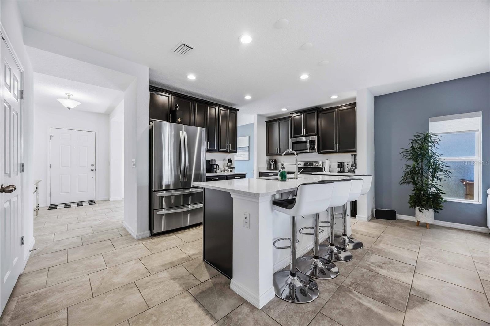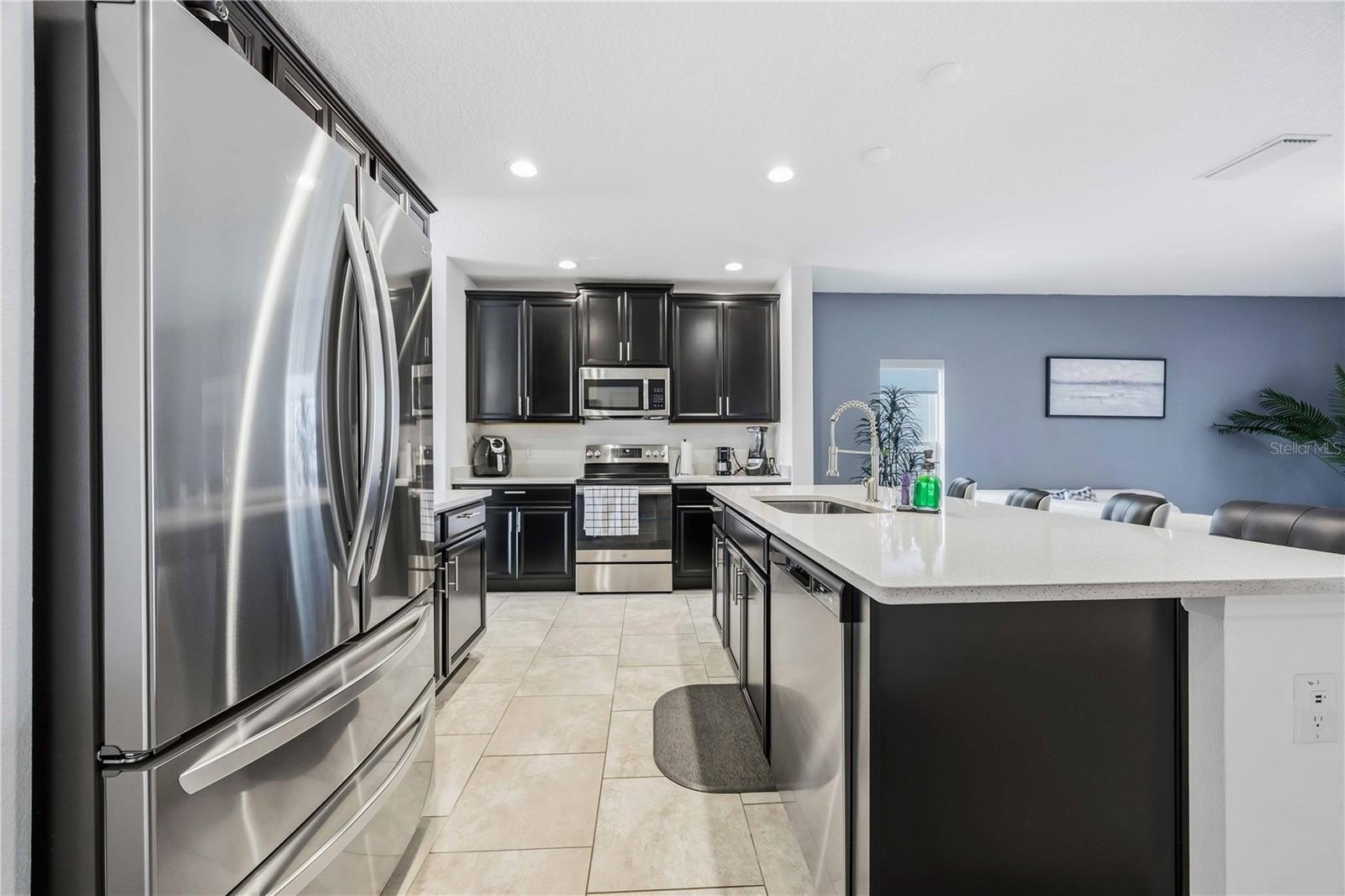 carpet reserved exclusively for the bedrooms. The gourmet kitchen features 42-inch Tahoe Maple Espresso cabinets, STAINLESS STEEL appliances, QUARTZ counter tops, a spacious center island, and sleek modern finishes, ideal for both everyday living and