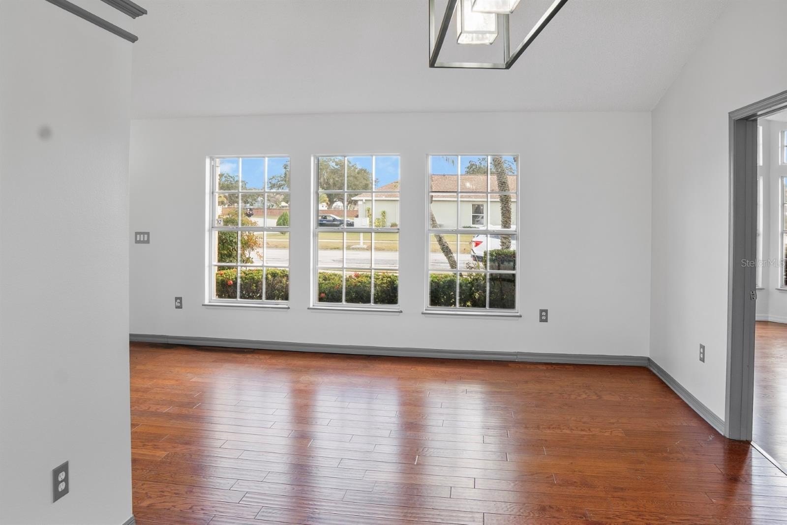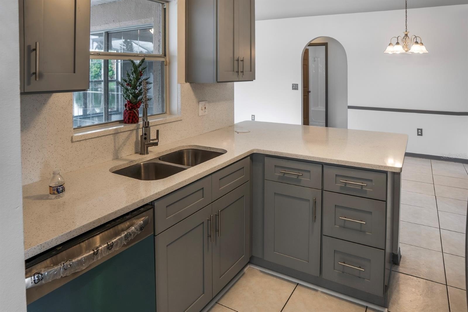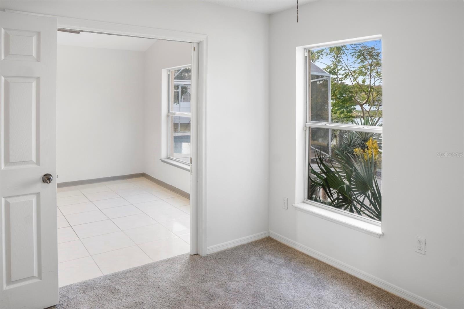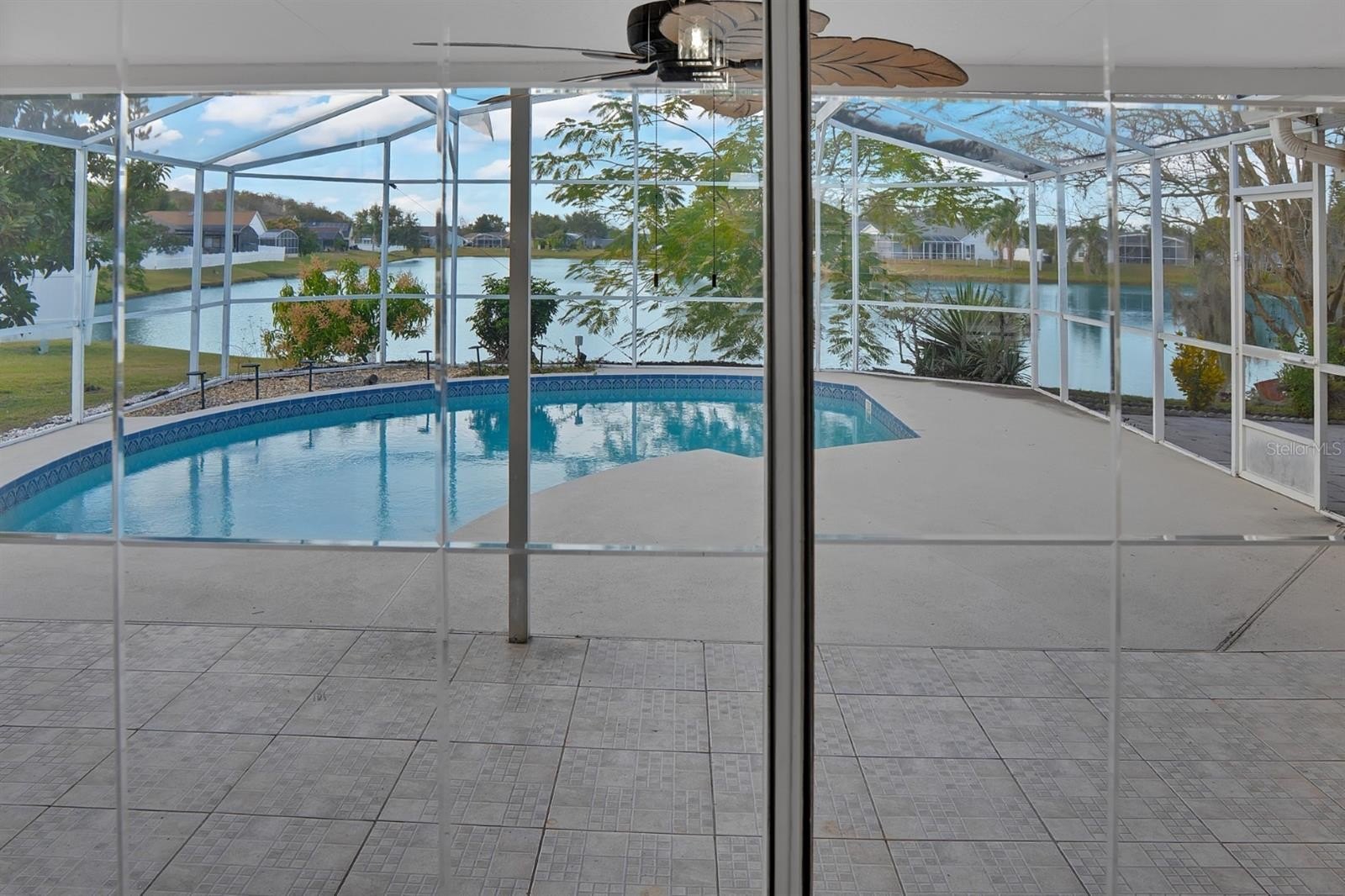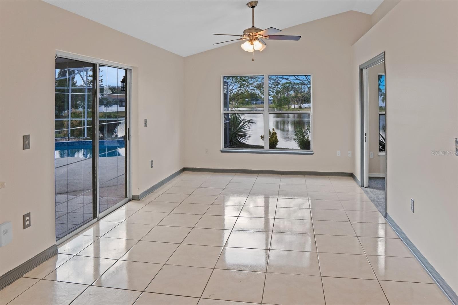 The home features a cozy kitchen with quartz countertops, perfect for everyday living and entertaining. Enjoy a formal living room and dining area, along with a relaxing family room with sliding glass doors that open to the enclosed pool and covered patio—ideal for outdoor gatherings and peaceful waterfront living.