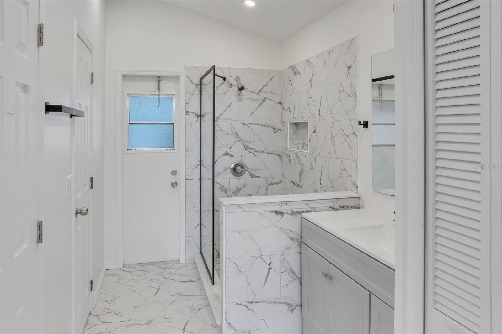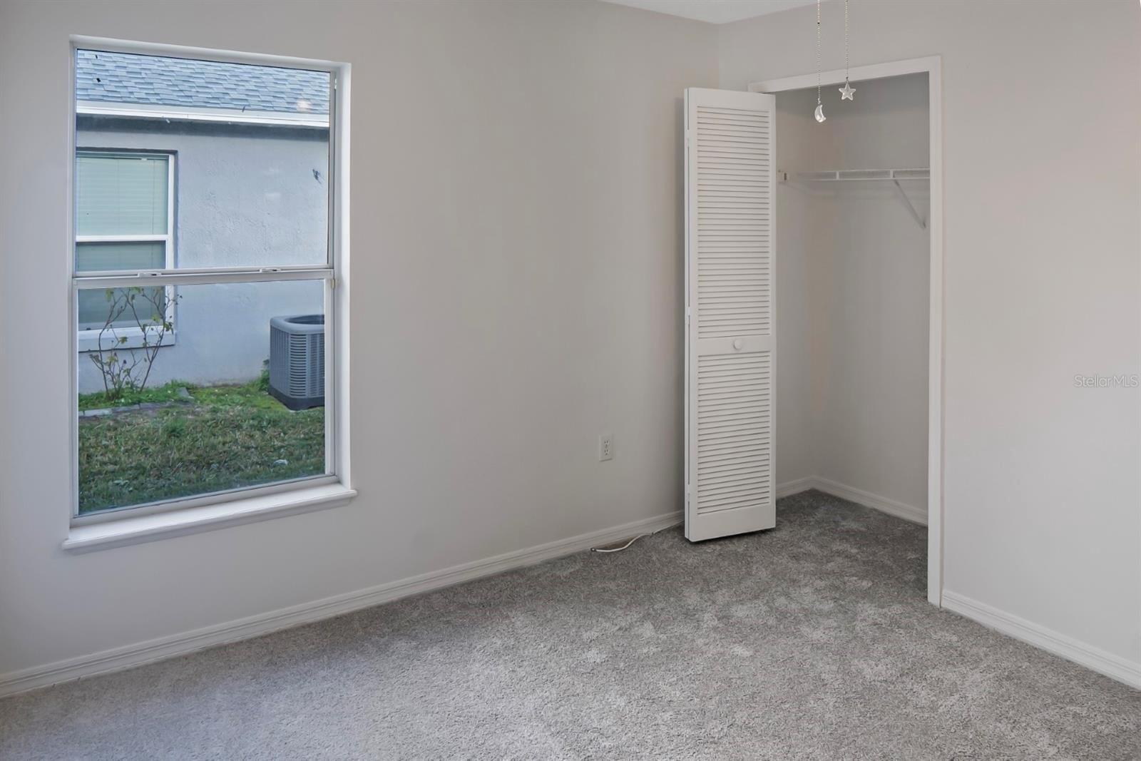 The primary suite offers a spacious walk-in bathroom, walk-in closet, and direct access to the pool area. The split-bedroom floor plan provides added privacy, with the second and third bedrooms featuring brand new carpet.