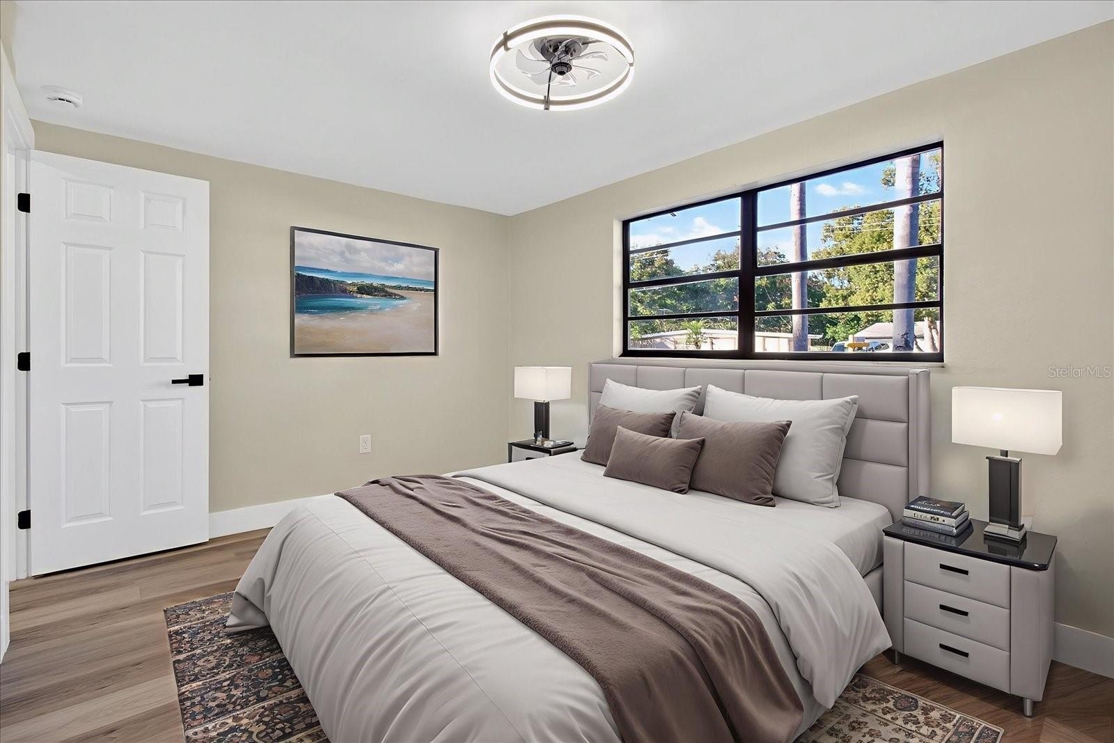 The kitchen has been completely rebuilt with brand-new cabinetry, waterfall granite countertops, a stylish backsplash, and updated finishes—creating a clean, functional space ideal for entertaining. The primary suite features a beautifully remodeled bathroom with a double vanity, while the shared bathroom has also been fully updated with modern tile, a new vanity, and sleek contemporary fixtures.