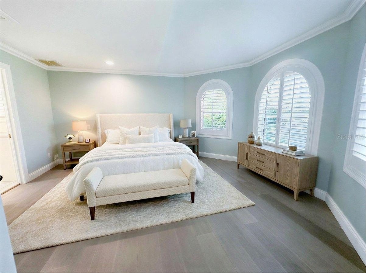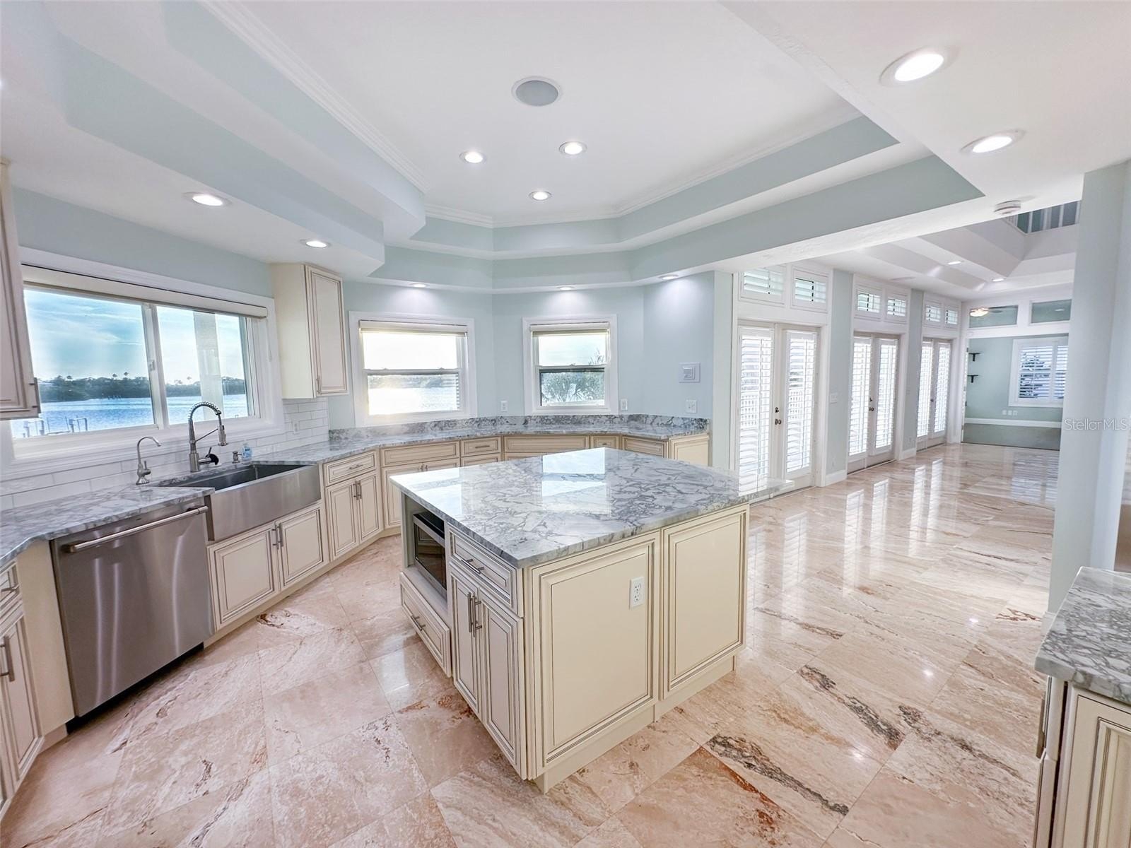 The main residence features a spacious split-floor plan with 6 bedrooms and 5 bathrooms, thoughtfully designed for both comfort and grand entertaining. This luxury home is designed to impress, featuring a four stop elevator offering convenient access to all levels. Travertine flooring flows seamlessly from the living room into the chef’s kitchen, showcasing brand-new custom cabinetry, quartz countertops, a Sub-Zero refrigerator, new appliances, a walk-in pantry, and stunning panoramic water views while you're cooking.