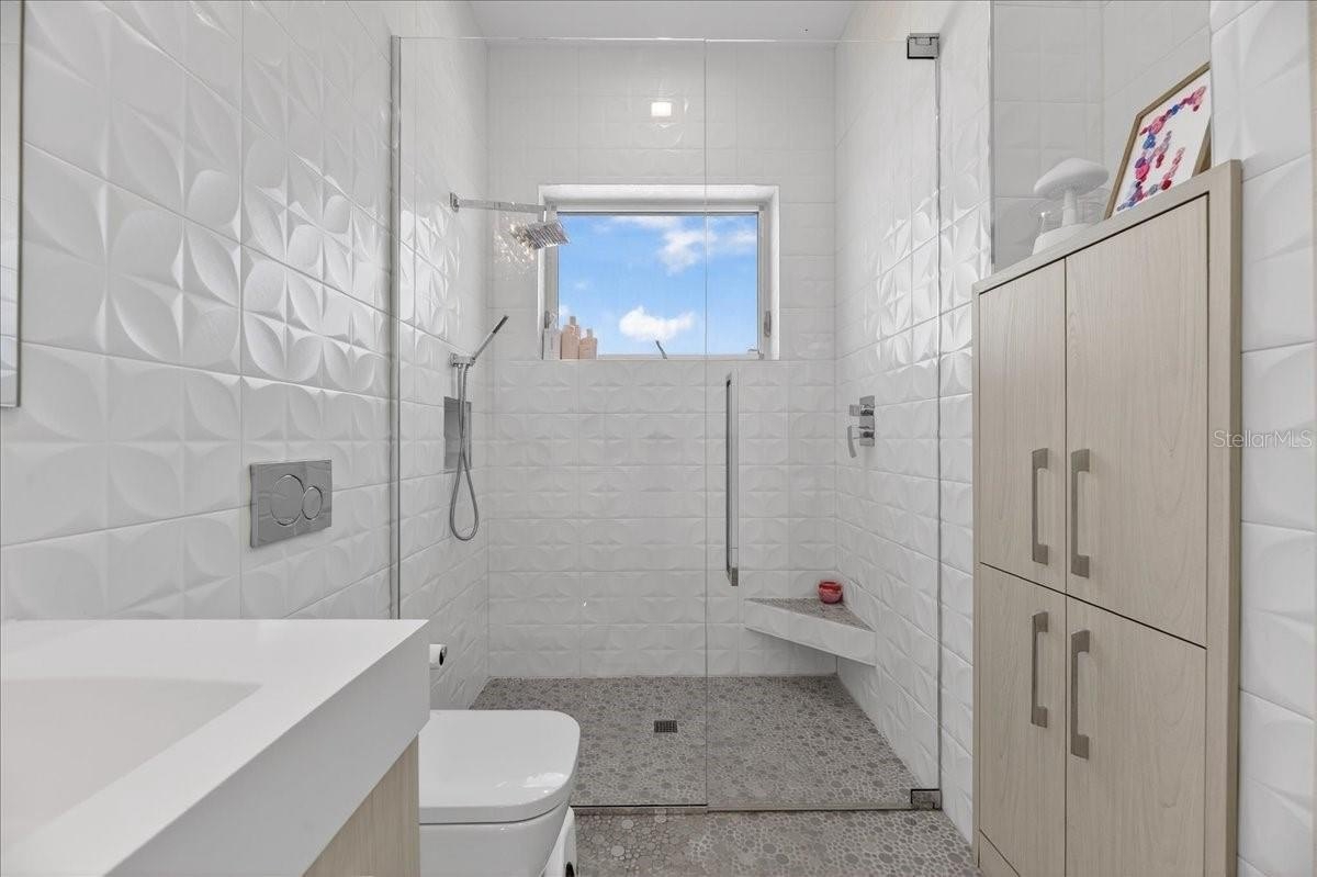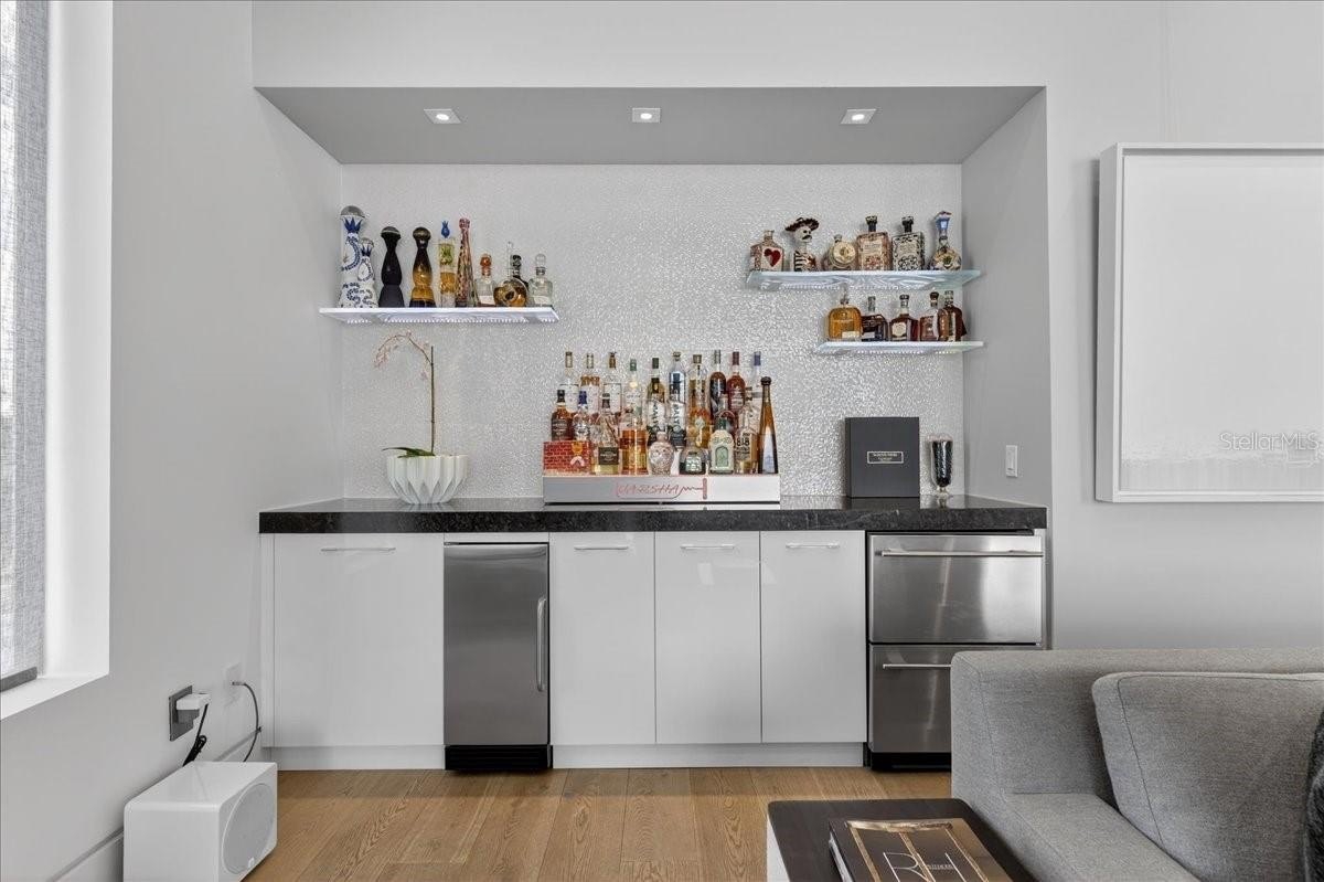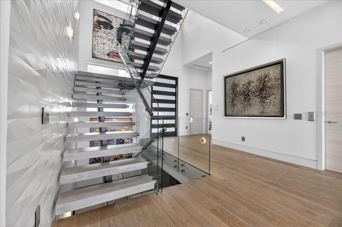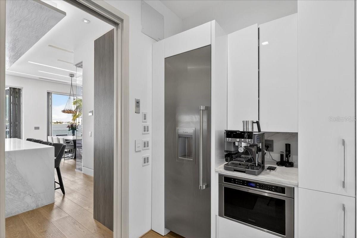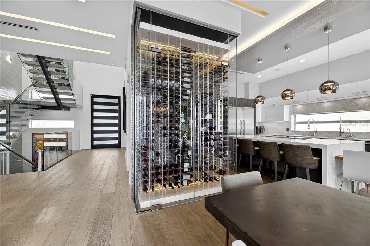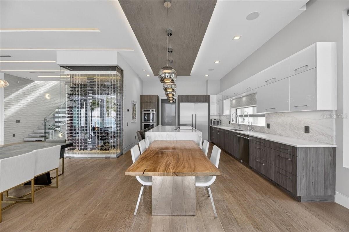 Welcome to 1320 Boca Ciega Isle Dr—a custom, design-forward waterfront estate where every line, finish, and function was curated with intention. A dramatic 10’ entry door opens to immediate water views and an expansive, open-concept main level combining kitchen, dining, and living—all framed by the Intracoastal/Boca Ciega Bay backdrop. The statement kitchen is built for serious entertaining: Thermador appliance suite, induction cooktop, marble counters and oversized island, built-in side-by-side refrigeration, and a rare walk-in pantry with an integrated freezer. Anchoring the living level is a glass-enclosed, climate-controlled wine display—a true centerpiece that reads more like art than storage.