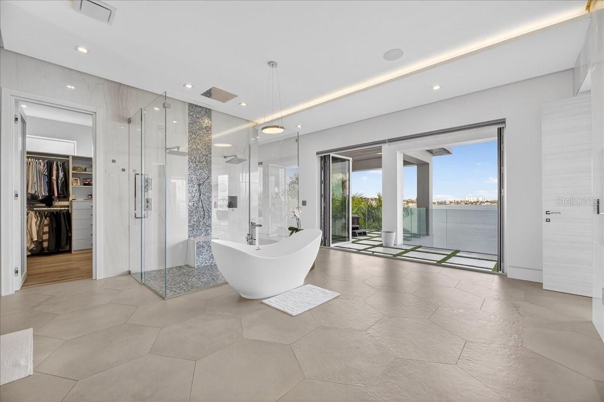 Primary suite w/ dual fireplace, patio + spa over the bay