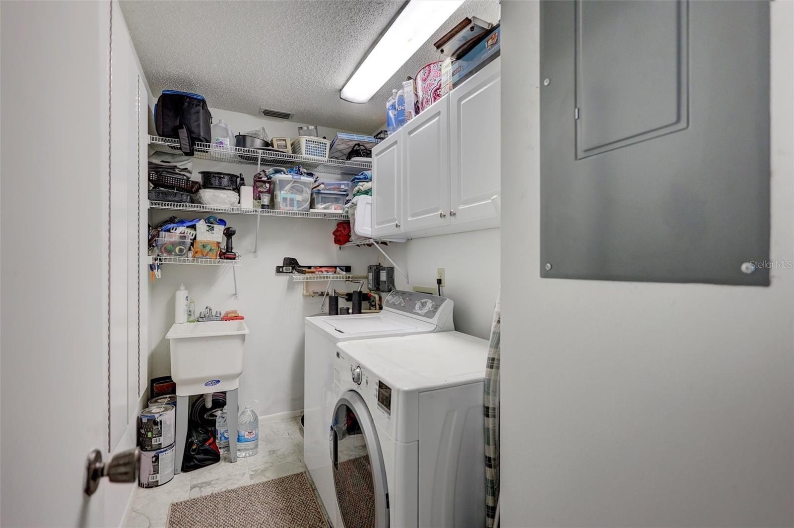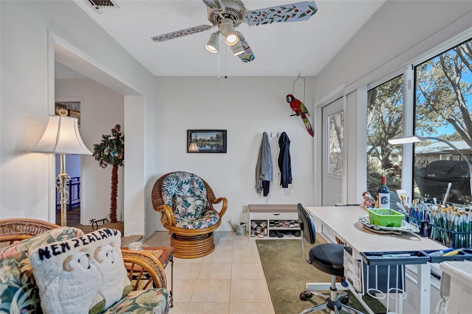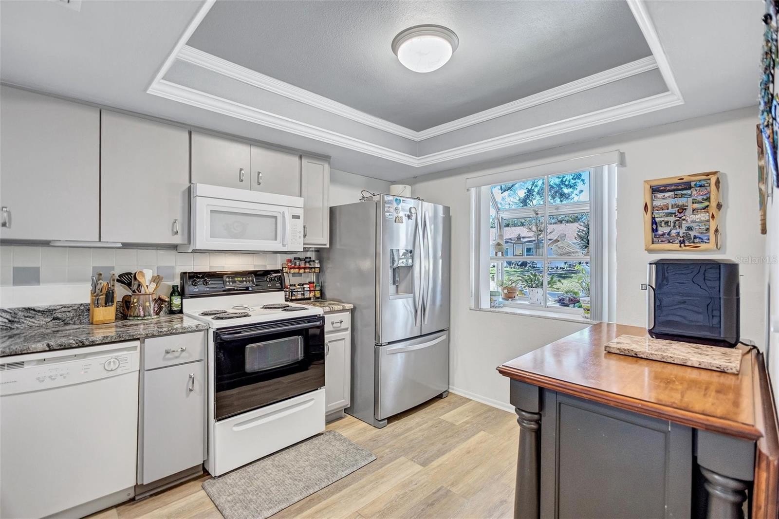 This end unit villa is right next to the covered carport and storage shed. A/C and hot water heater new in 2025, roof new 2024. It's move in ready with luxury vinyl wood plank flooring, fresh interior paint throughout, and all the appliances. Washer and dryer, are included. You will love the floorplan! Sunny kitchen with granite countertops and deep kitchen sink, pull out racks in the cabinets , pantry closet, & serving counter through to the oversize combined living & dining room space. 2nd bedroom in the front adjacent to the guest bathroom. The spacious master suite is at the back on the home. The master features a walk-in plus a double closet, as well as a suite big enough for two with dual vanity and step-in shower. Great natural light throughout including a skylight in the great room. The sunroom is