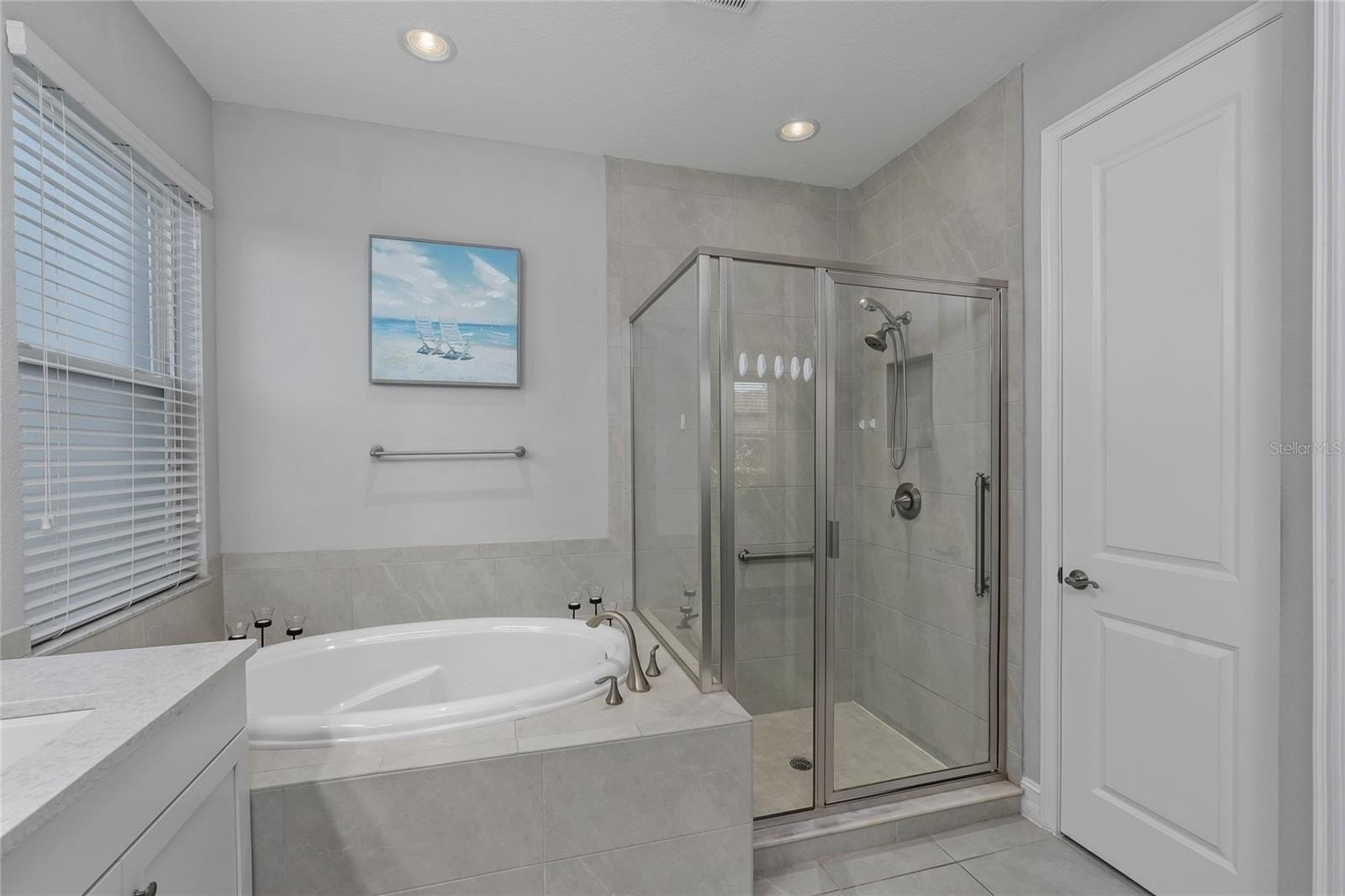 The primary suite is your retreat. Tray ceiling. Custom walk-in closet with real organization (not just a rod and a shelf). Spa-like bathroom with quartz countertops, double sinks, a soaking tub for when you have time, and a floor-to-ceiling tiled shower for when you don't. The second full bathroom also has quartz counters and a tub/shower combo.