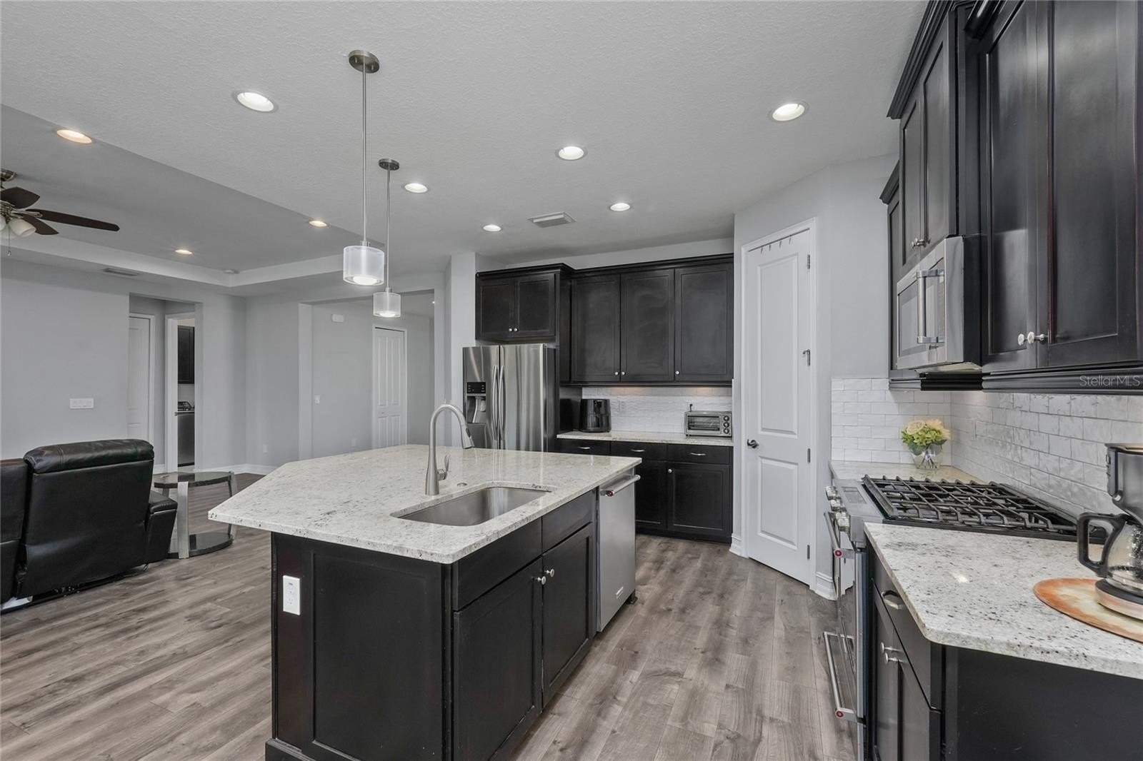 The kitchen is the heart of the home—42" espresso cabinets, granite countertops, stainless appliances, and an oversized island with seating where everyone naturally gravitates. Gas cooktop for serious cooking. Under-cabinet lighting that makes prep work easier. Tile backsplash that ties it all together. There's a separate breakfast nook for everyday meals and a spacious formal dining room for when the whole family comes over.