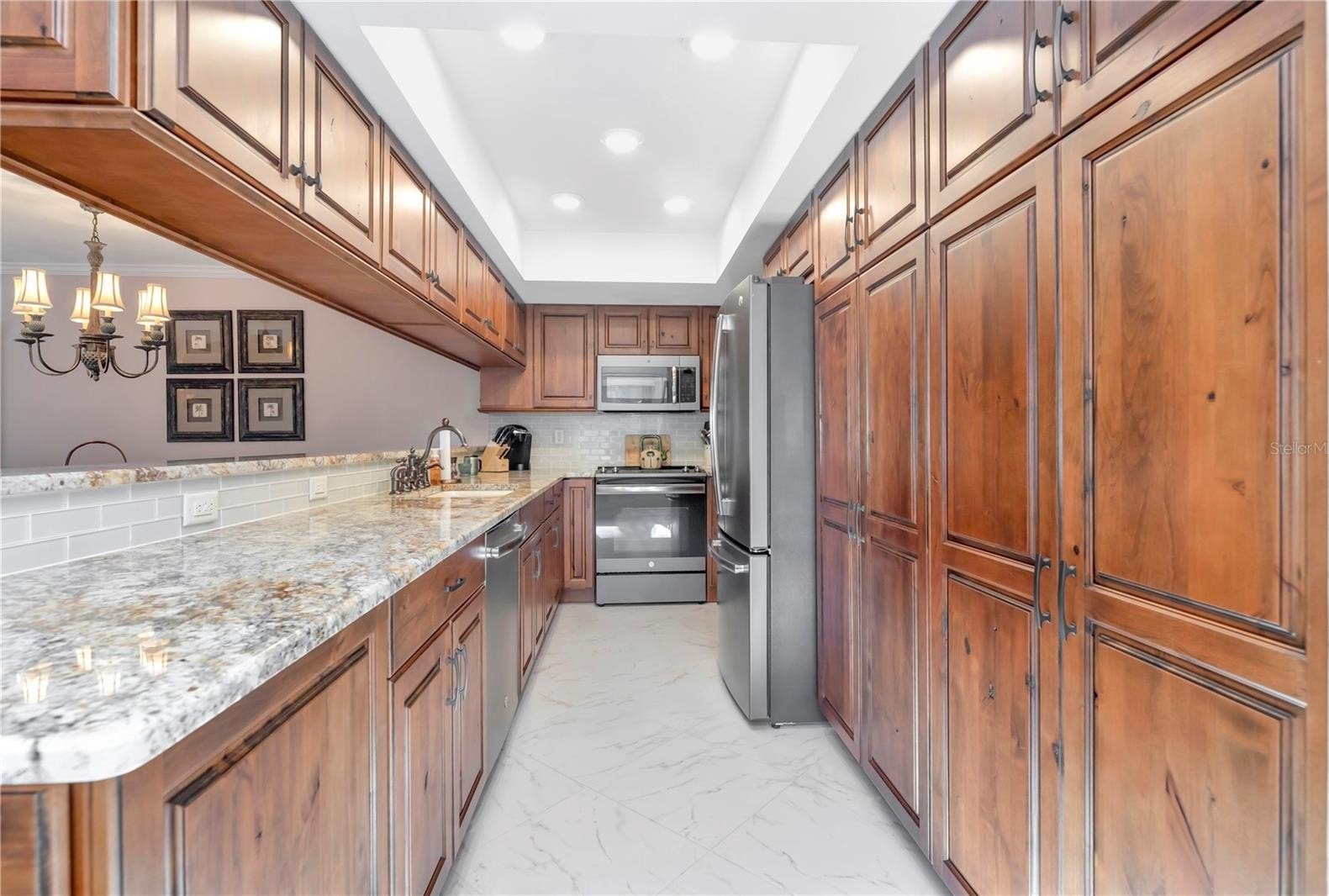 Inside, the kitchen is finished with granite countertops, custom soft-close cabinetry, and tile flooring. The open floor plan offers living and dining areas leading to the lanai, creating an ideal space to enjoy Gulf breezes and views. Both bathrooms feature tile and rainfall showers, and the primary suite includes a walk-in closet.