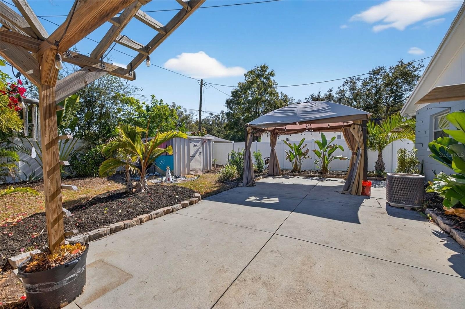 Step outside to a fully fenced backyard designed for enjoying Florida living year-round. The expansive 30’ x 16’ concrete entertainment patio, complete with a pergola and lush landscaping, is ideal for weekend gatherings, evening dinners, or simply unwinding after a beach day.