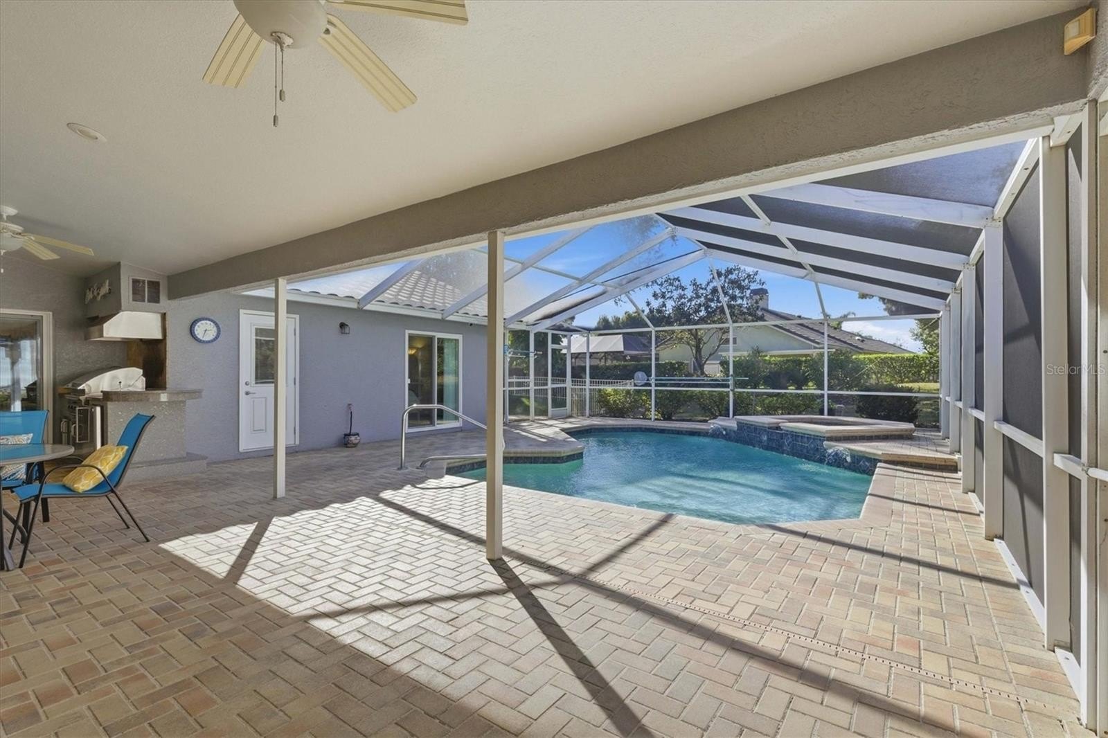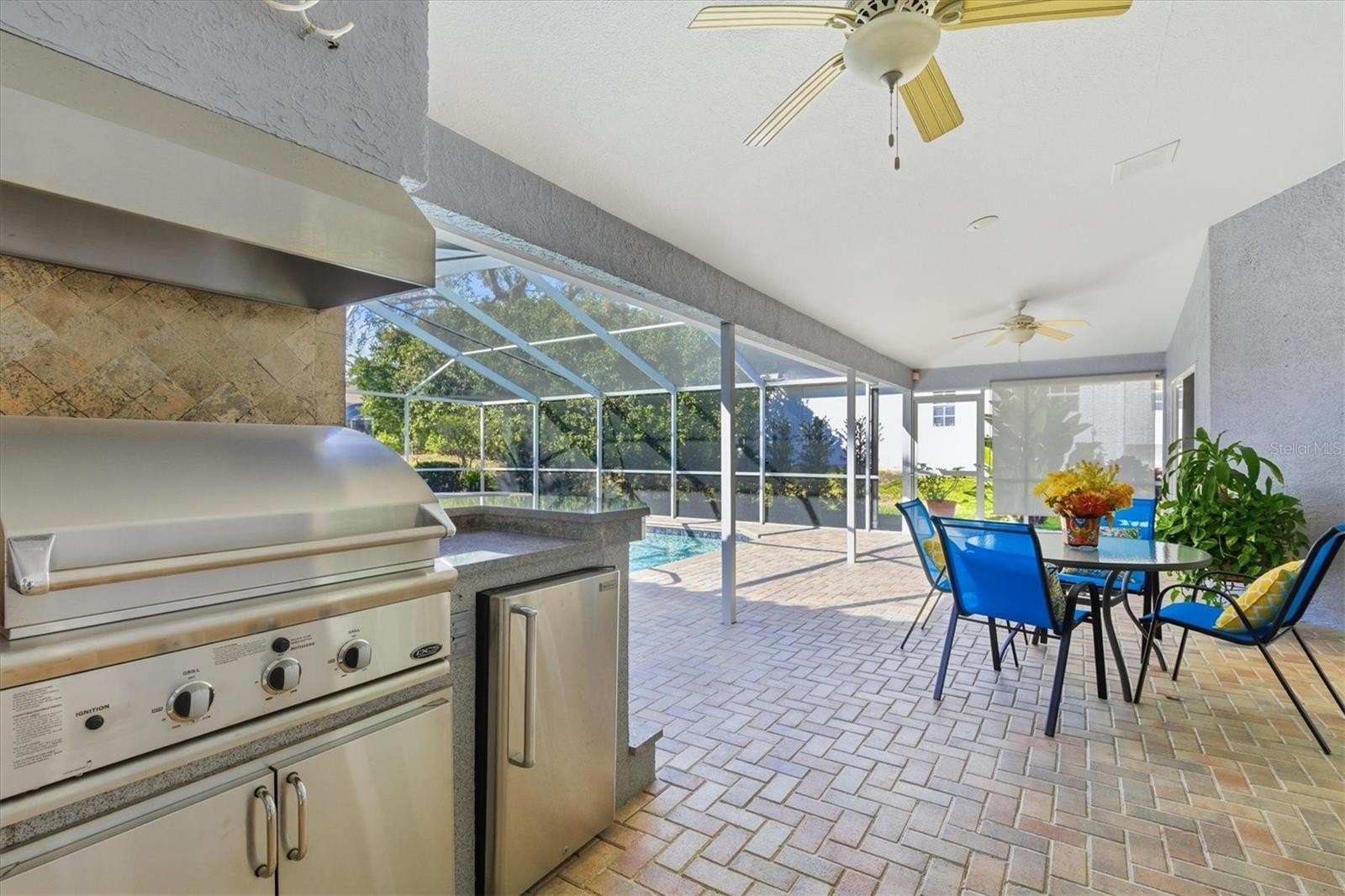 Outdoor living truly shines with a large covered lanai and poolside kitchen, complete with a DCS grill (lifetime burners), bar refrigerator, tumbled marble backsplash, and more. Enjoy the resort-style pool with spillover gas-heated spa, brick pavers, fountains, Bluetooth fan with speakers, fenced dog run, and shallow well for irrigation.