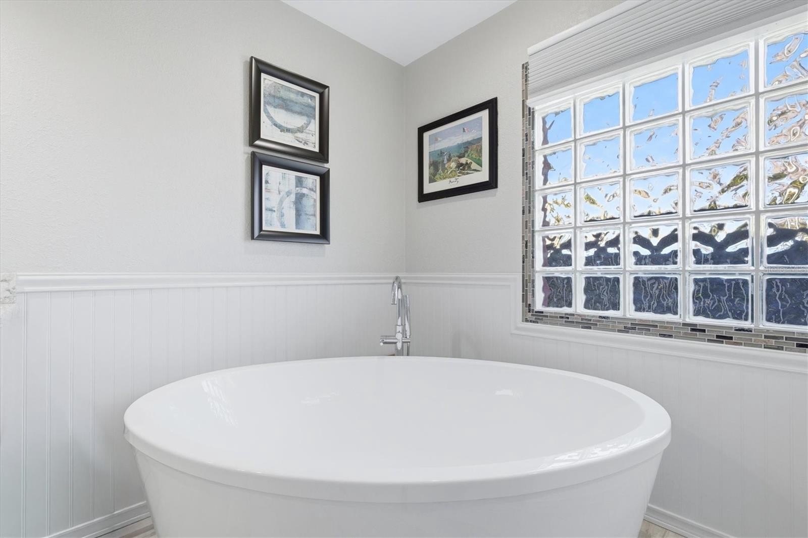 The luxurious primary suite has been completely reimagined, featuring new carpeting, a walk-in closet, and a spa-inspired ensuite bath with dual quartz vanities, plank tile flooring, a freestanding soaking tub, and a separate walk-in shower with gorgeous tilework, block-glass window, beadboard, and chair rail accents for a coastal feel.