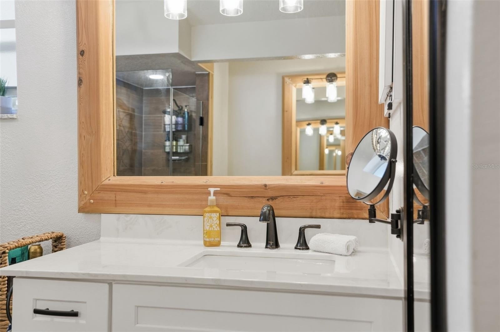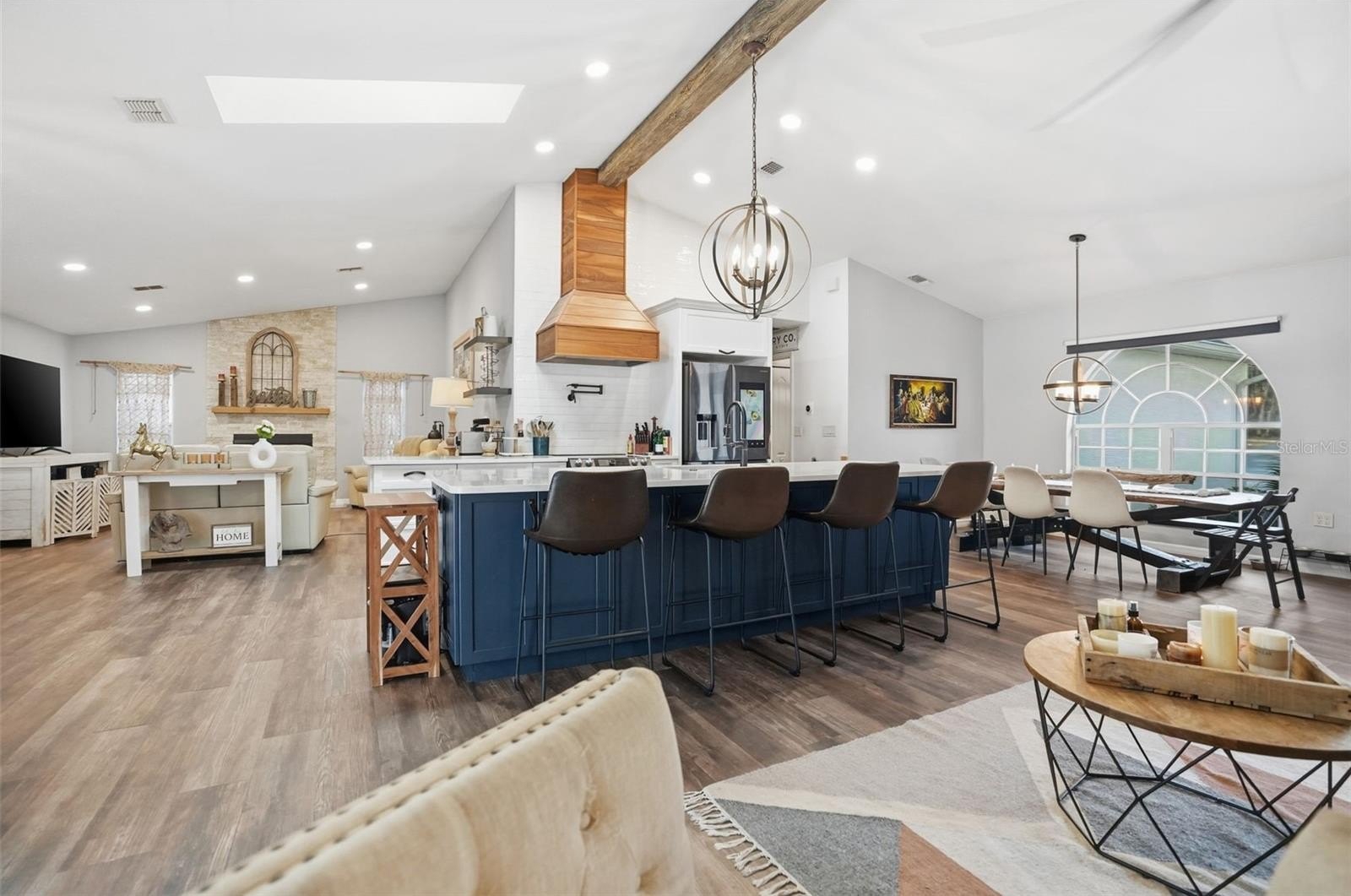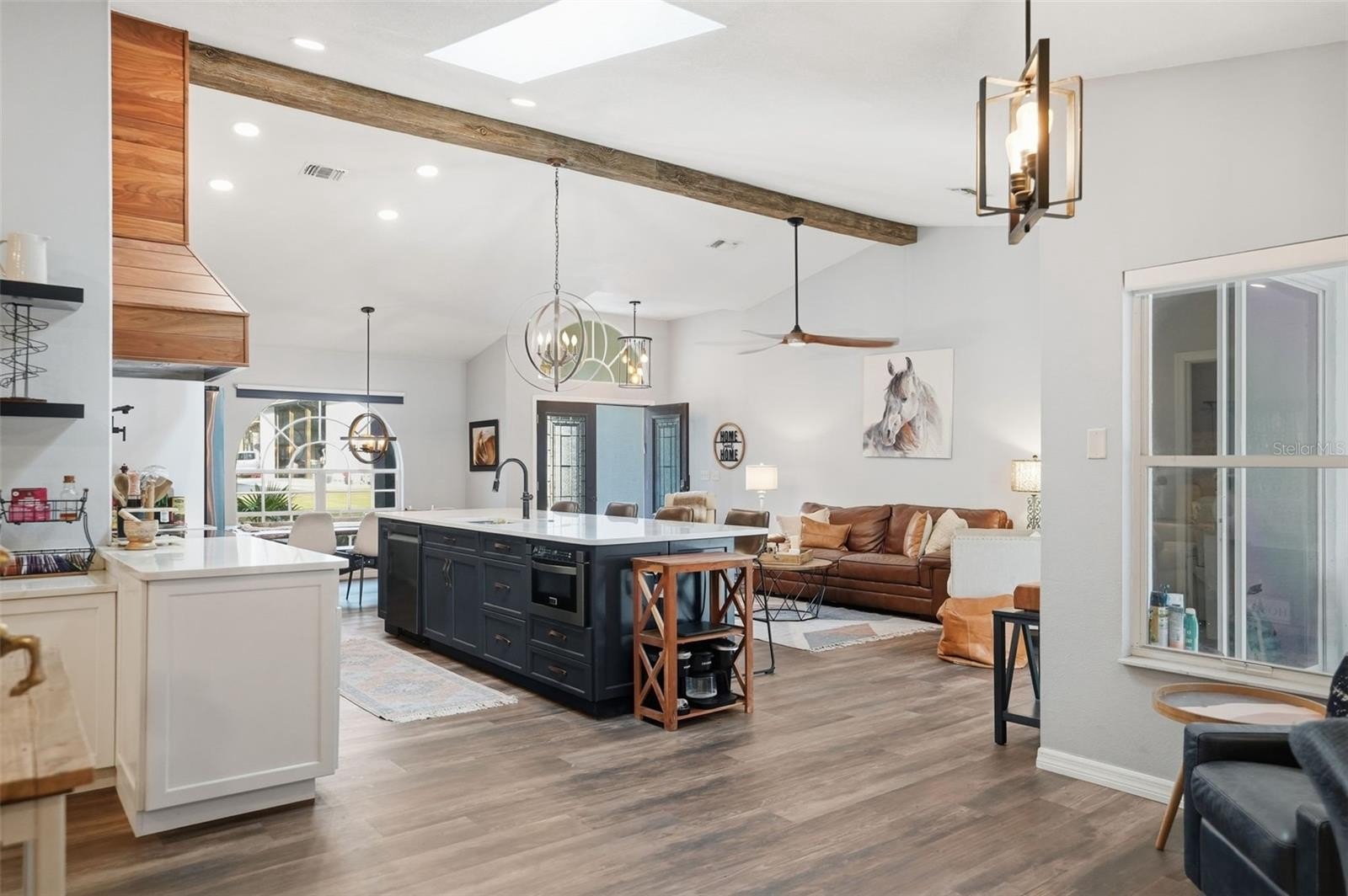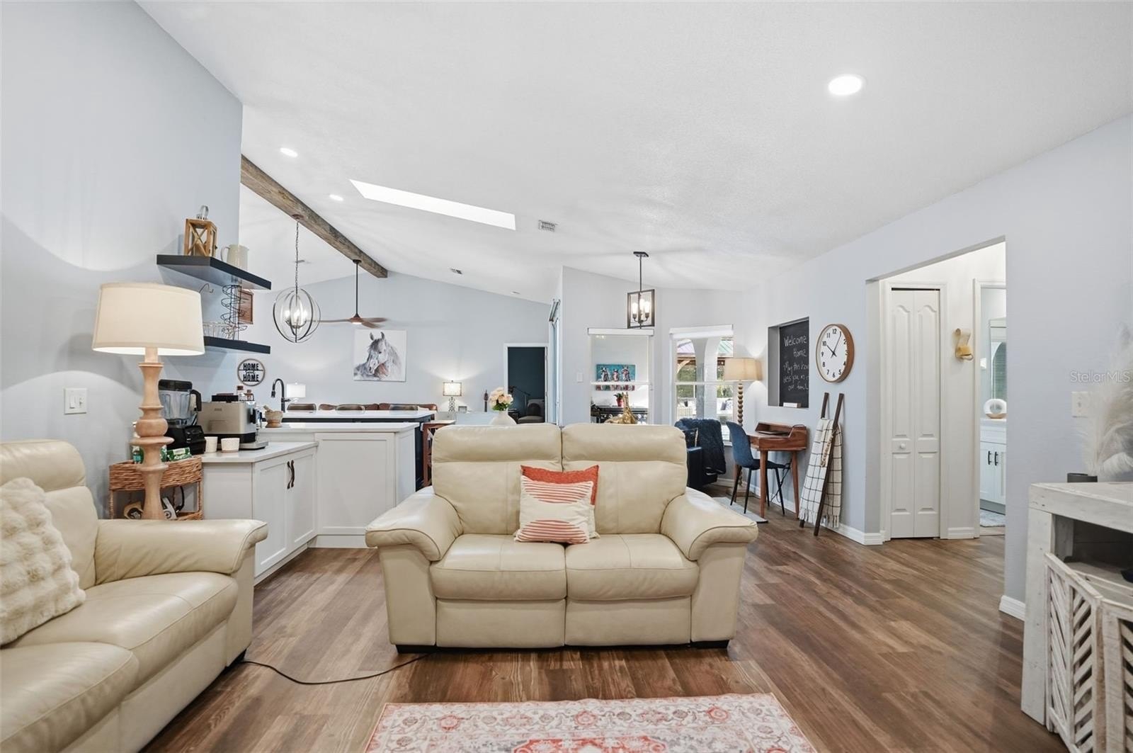 Walk inside the home and it will take your breath away with the stunning new kitchen with large island bar for extra seating, gorgeous Quartz counter tops, range hood and pot filler, matching coffee bar area, upgraded stainless steel appliances...all was done by an interior designer! The home has high ceilings and an open floor plan to the living rooms and family room with gorgeous wood beam and fireplace focal points, large windows and glass slider with pool views...so the home feels VERY spacious, light, bright and cheery!! The spa-like master bathroom is your own retreat as it's been remodeled to include gorgeous countertops, white shaker cabinets, ceramic-tiled walk-in shower with frameless and a modern soaking tub!! The second bathroom has been remodeled with gorgeous matching finishes, too!! Walk-in closets!