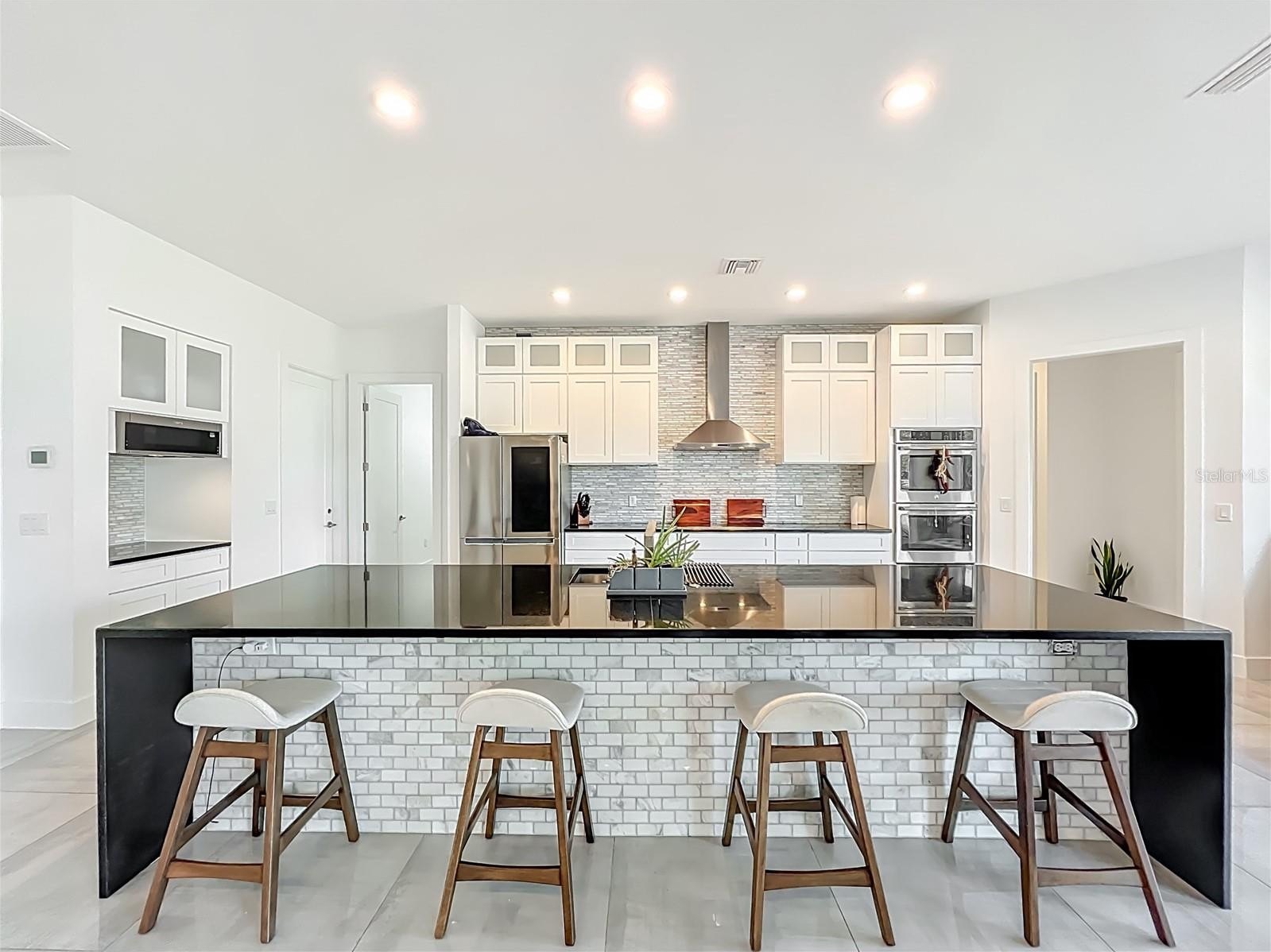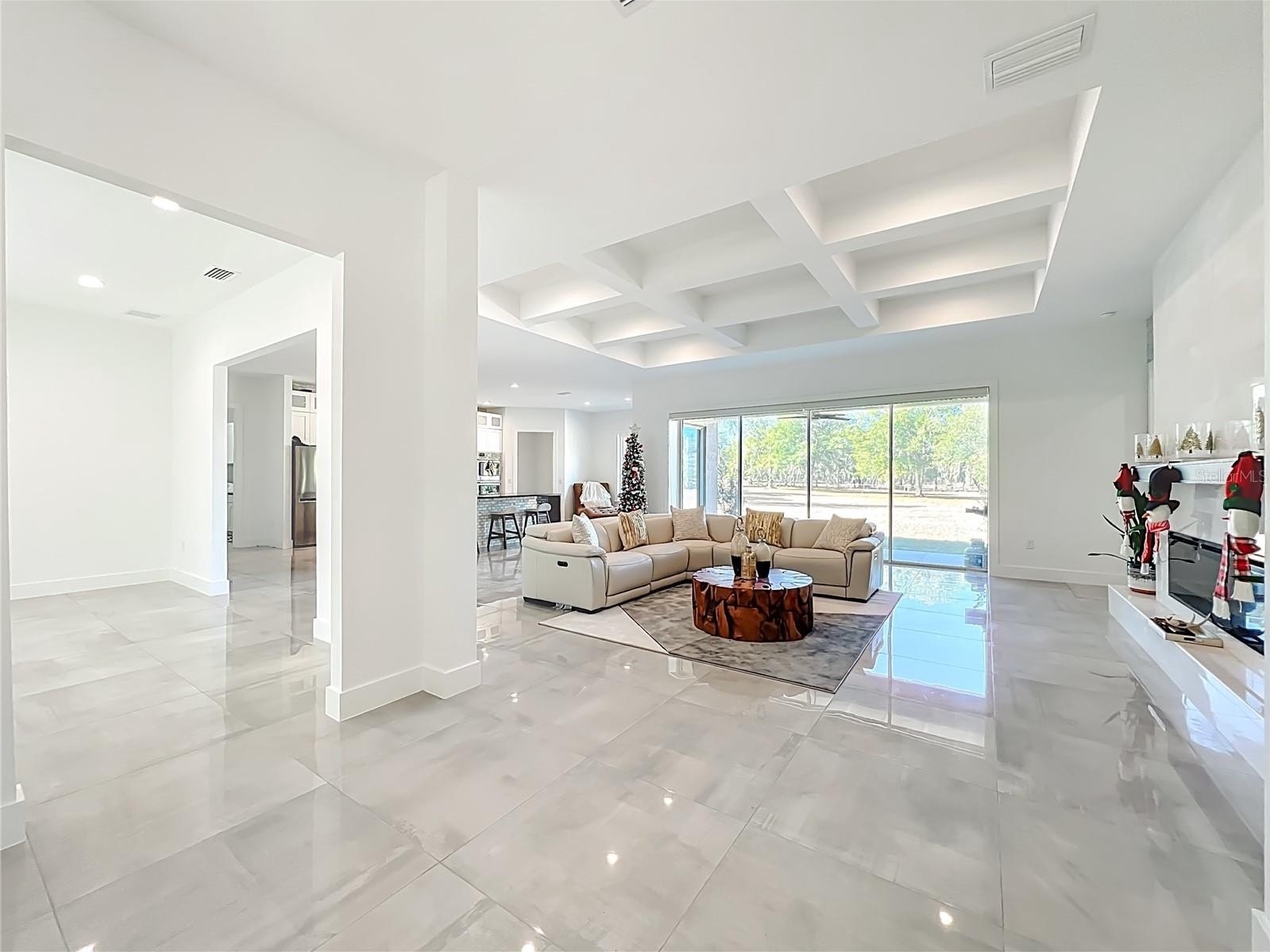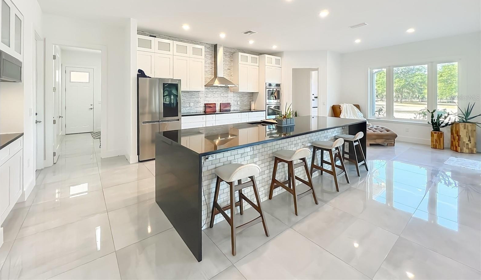 Professionally designed for efficiency, this unique property offers several income-generating possibilities. Live in one home and rent out the other (Airbnb/VRBO) for excellent returns or consider adding an RV hookup to welcome guests. The main residence features 3 bedrooms +office. This home impresses with a grand entrance featuring stone accent columns with a cozy front porch. Step inside to a stunning living room with coffered 10’ ceilings, expansive built-in electric fireplace surrounded by tile with tile backsplash wall and sliding doors leading to the back lanai. 30x30 porcelain flooring and 8’ doors add a touch of luxury, while the chef’s kitchen boasts a Wolf induction cooktop, double oven, Bosch dishwasher, a separate coffee bar area, lots of soft-closed cabinets, and expansive granite counters with a gorgeous waterfall edge island.