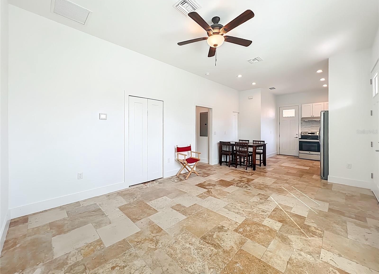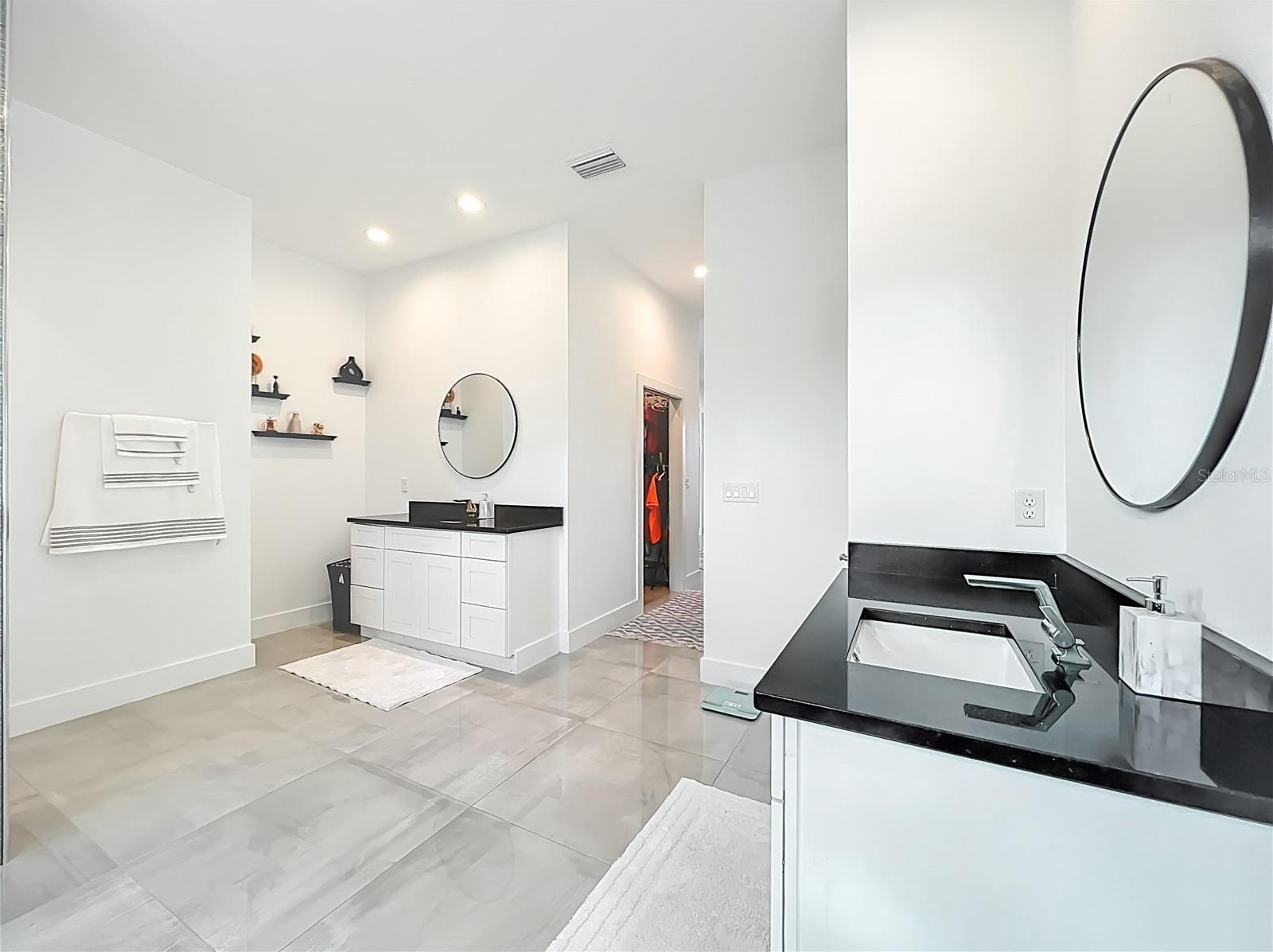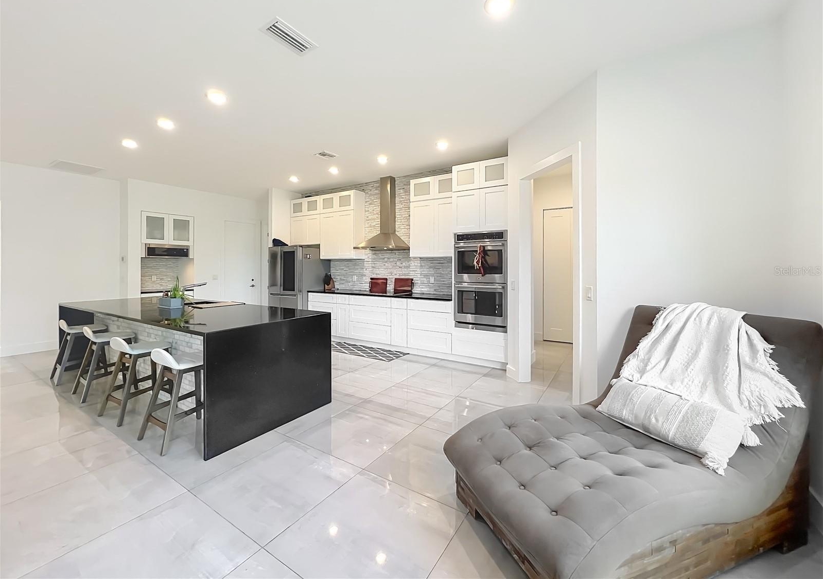 Professionally designed for efficiency, this unique property offers several income-generating possibilities. Live in one home and rent out the other (Airbnb/VRBO) for excellent returns or consider adding an RV hookup to welcome guests. The main residence features 3 bedrooms +office. This home impresses with a grand entrance featuring stone accent columns with a cozy front porch. Step inside to a stunning living room with coffered 10’ ceilings, expansive built-in electric fireplace surrounded by tile with tile backsplash wall and sliding doors leading to the back lanai. 30x30 porcelain flooring and 8’ doors add a touch of luxury, while the chef’s kitchen boasts a Wolf induction cooktop, double oven, Bosch dishwasher, a separate coffee bar area, lots of soft-closed cabinets, and expansive granite counters with a gorgeous waterfall edge island.