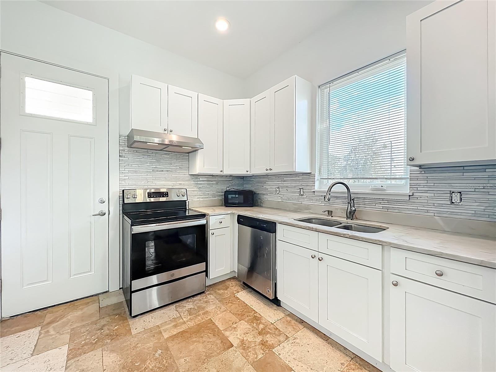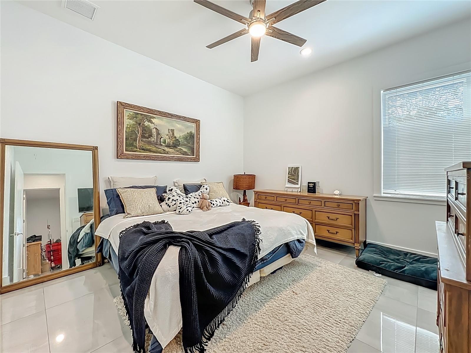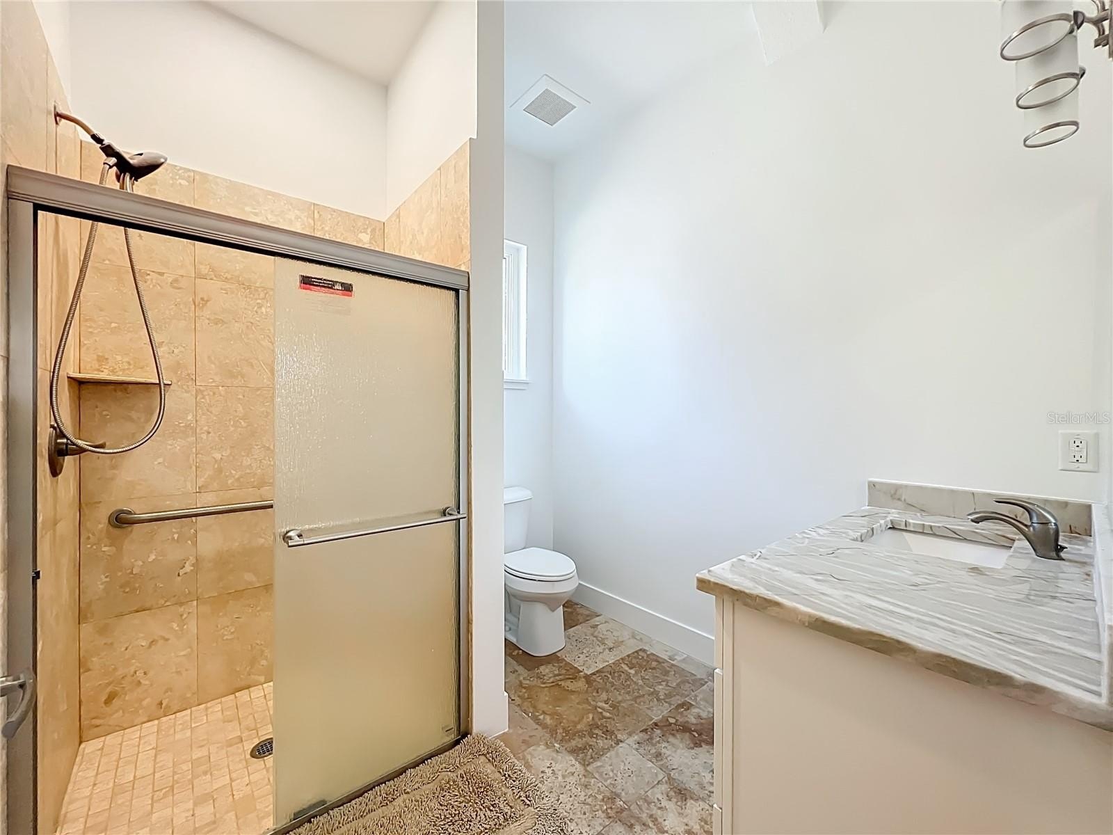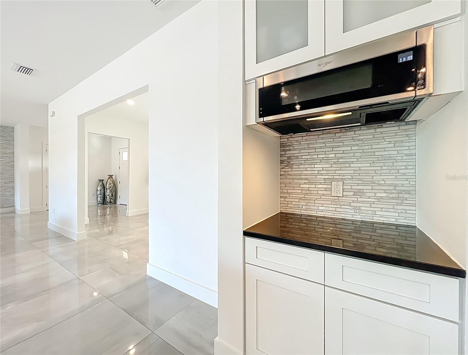 The private master retreat includes dual walk-in closets and a luxurious bathroom with an all-glass walk-in tile shower. Spacious second and third bedrooms share a well-appointed bathroom. A breezeway connects the main home with travertine tile to the in-law quarters, where you will find travertine tile throughout the home. This home offers two bedrooms, two full bathrooms, a comfortable living room, and a complete kitchen with soft-closed cabinets, granite counters, and is designed for ADA accessibility—perfect for multi-generational living or rental income.
