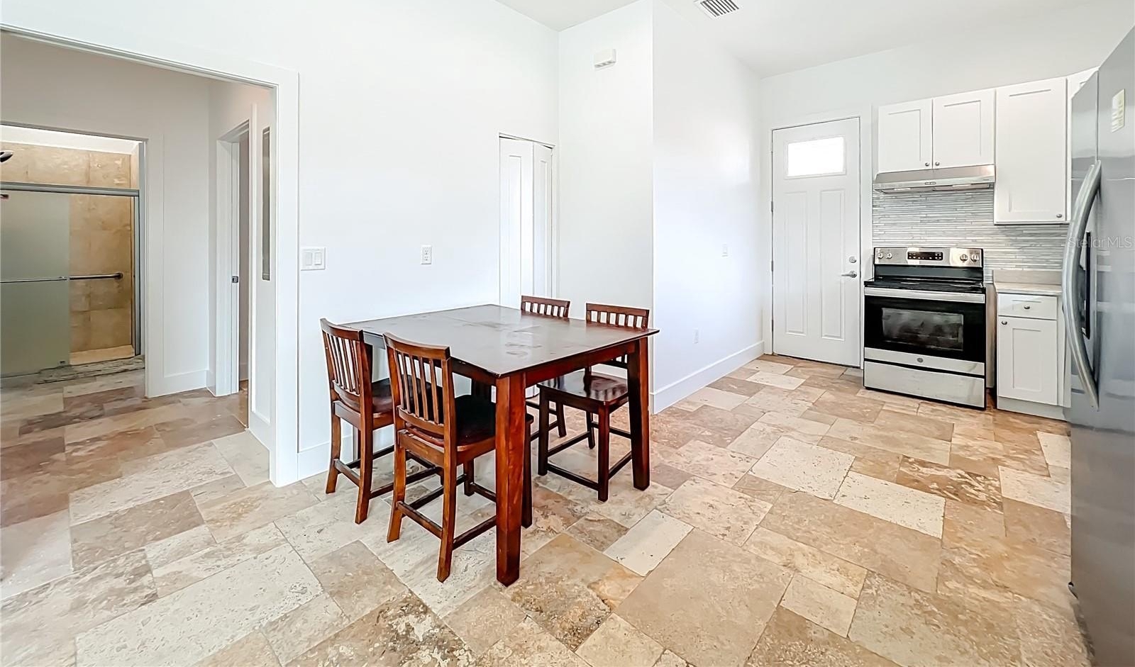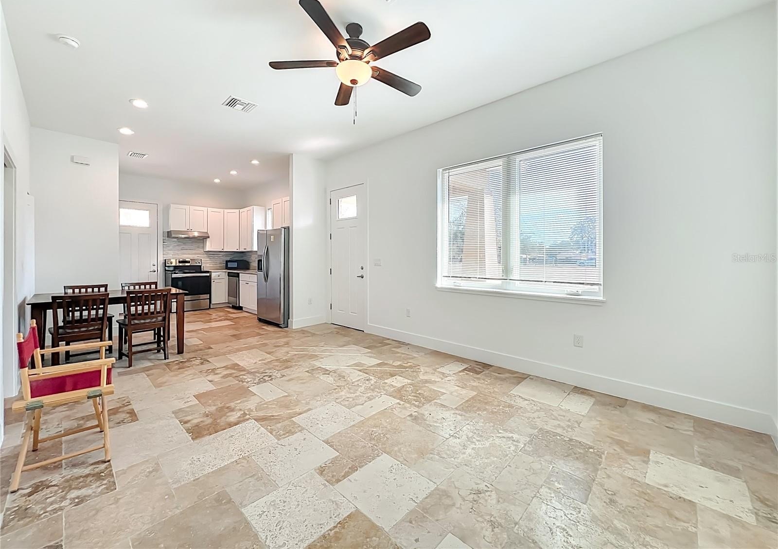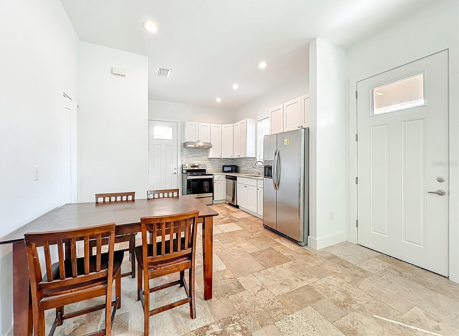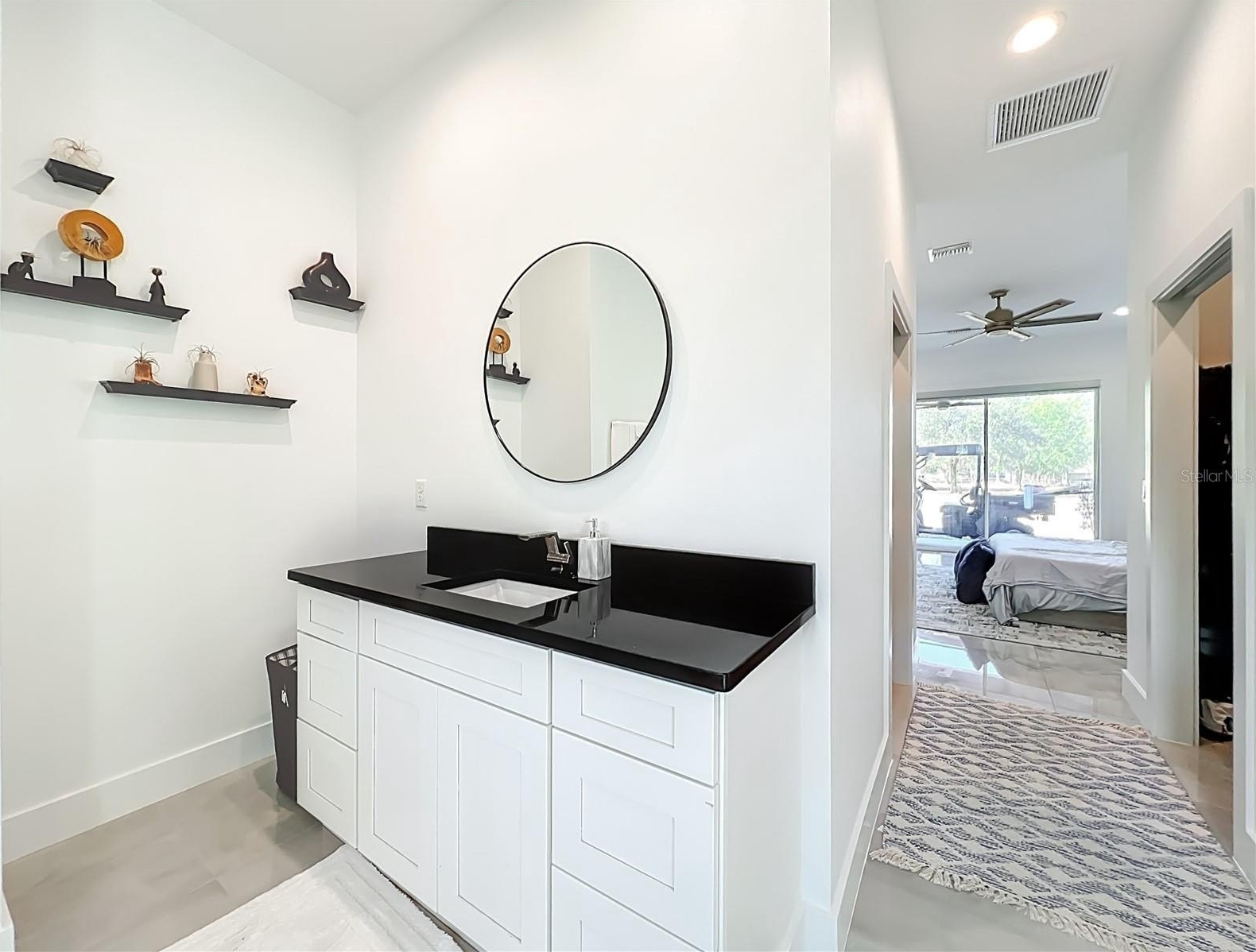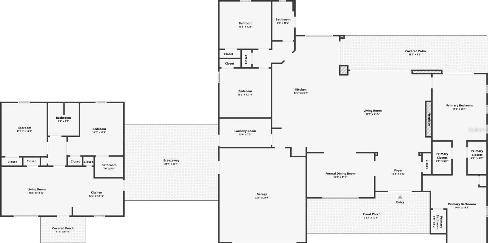The private master retreat includes dual walk-in closets and a luxurious bathroom with an all-glass walk-in tile shower. Spacious second and third bedrooms share a well-appointed bathroom. A breezeway connects the main home with travertine tile to the in-law quarters, where you will find travertine tile throughout the home. This home offers two bedrooms, two full bathrooms, a comfortable living room, and a complete kitchen with soft-closed cabinets, granite counters, and is designed for ADA accessibility—perfect for multi-generational living or rental income.