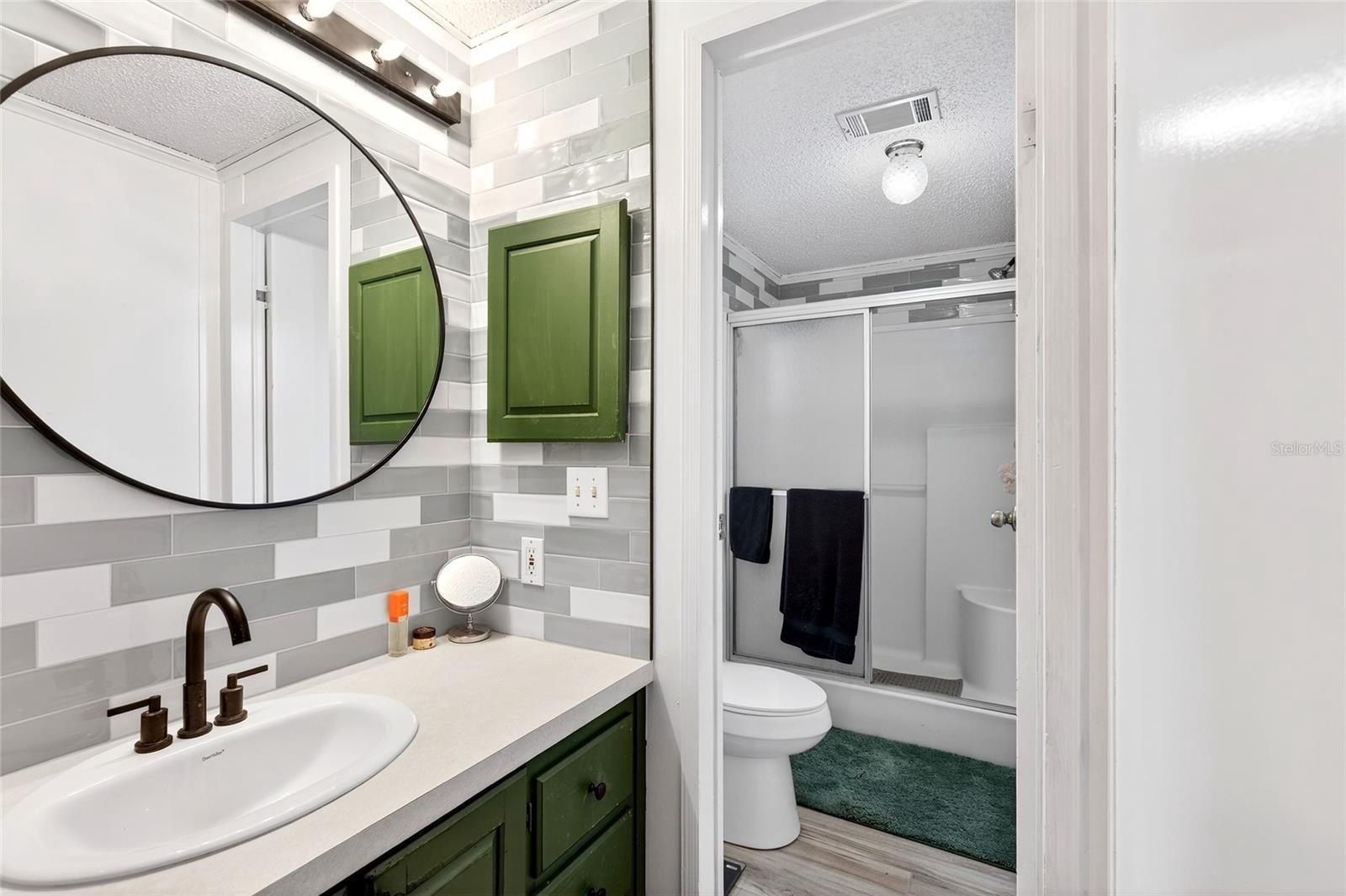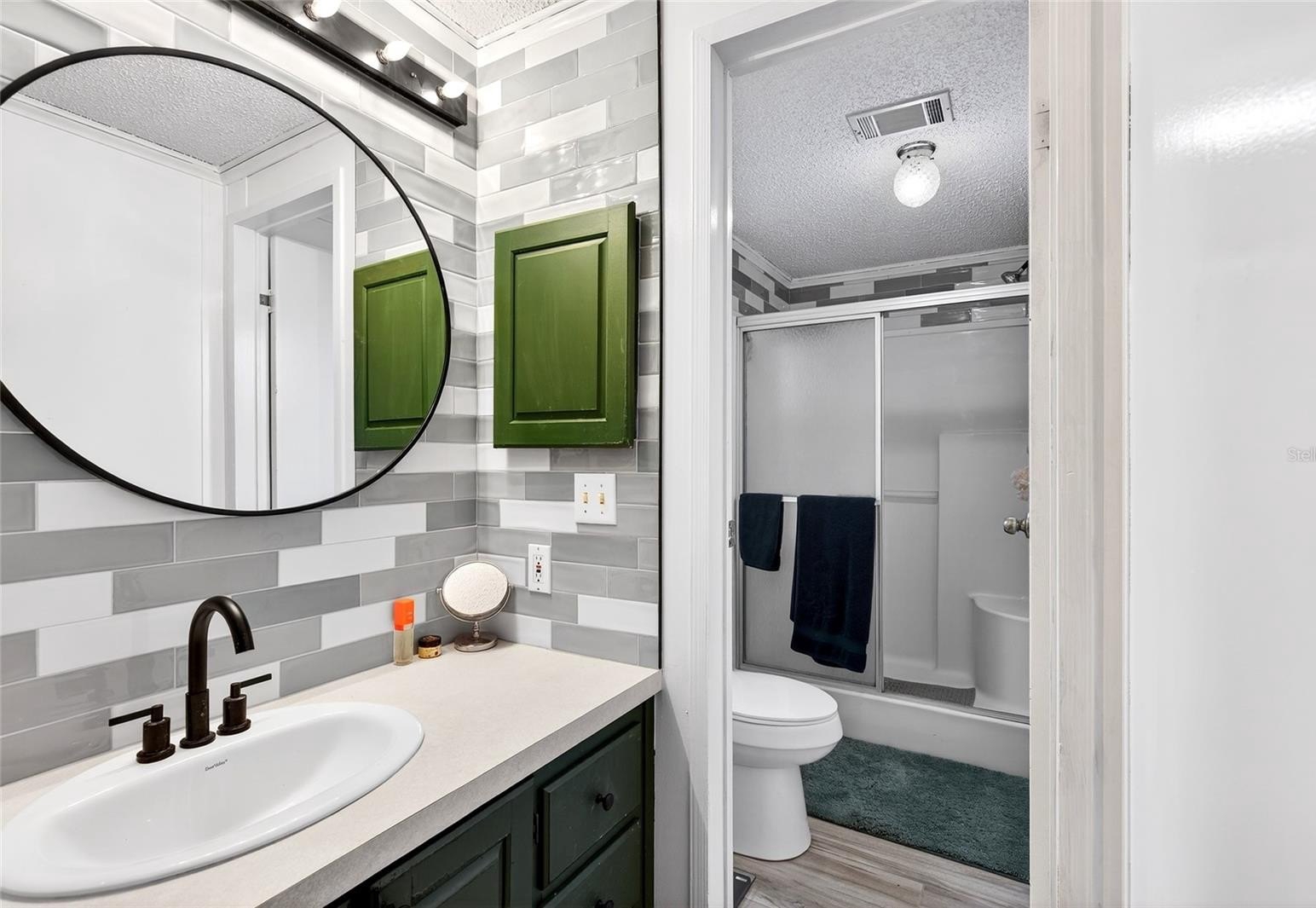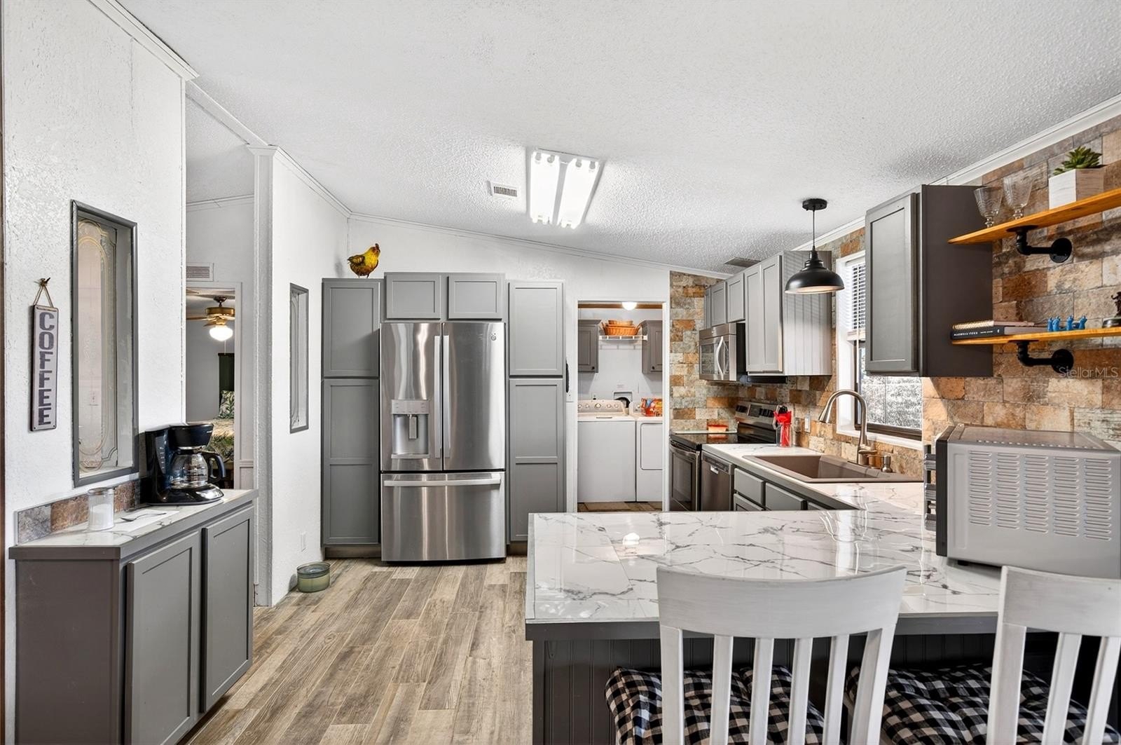 Kitchen has an adorable coffee bar & pantry for food storage. There's a covered barbecue area walk-in shower in one bathroom tub. In the other