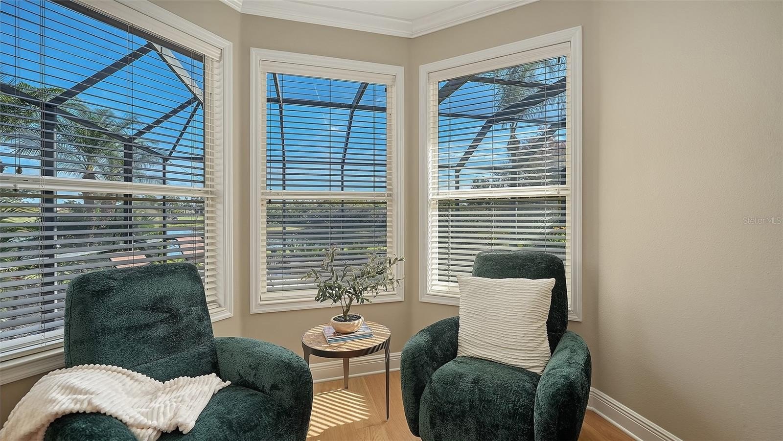 The elegant owner’s retreat is a true sanctuary, featuring a tray ceiling, hardwood flooring, a charming bay-window sitting area, private lanai access, and two custom-fitted walk-in closets. The spa-inspired bath offers dual vanities, a soaking garden tub, decorative tile accents, and a walk-in shower.