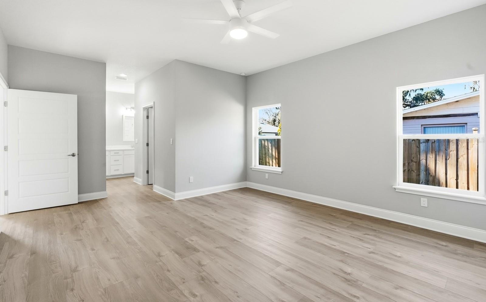 The home features brand new luxury vinyl flooring throughout, giving it a clean, cohesive look from room to room. The private primary suite is tucked away on its own side of the home and includes a spacious ensuite bath with double sinks and a large walk-in shower. On the opposite side, three additional bedrooms and a full guest bath provide flexible space for guests, kids, a home office, or gym setup.