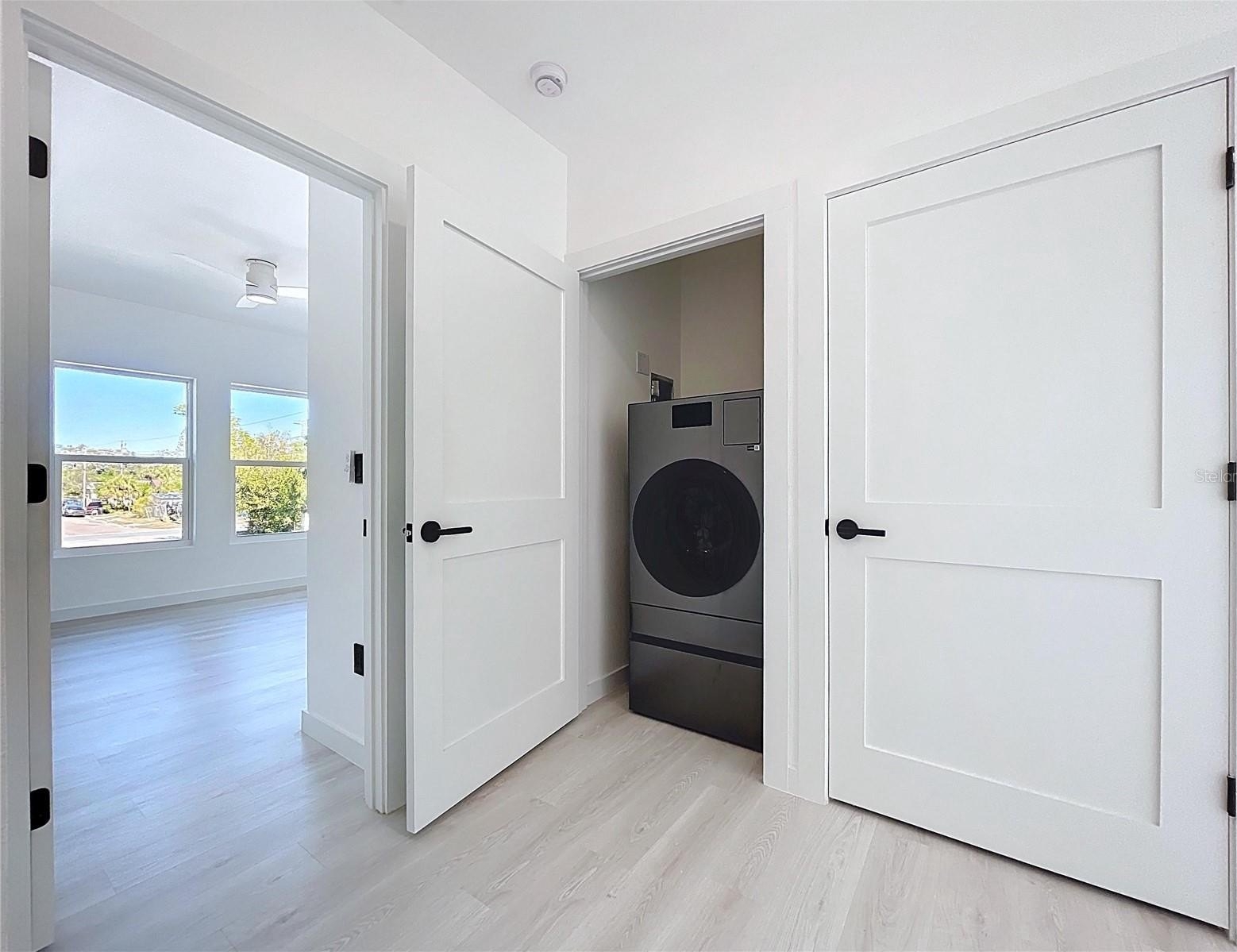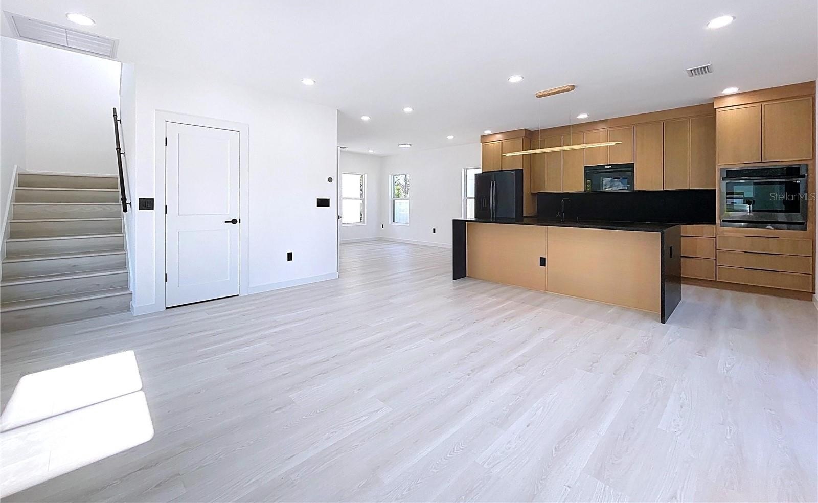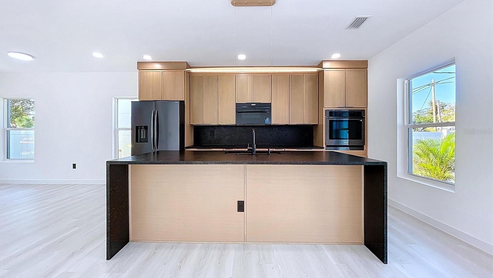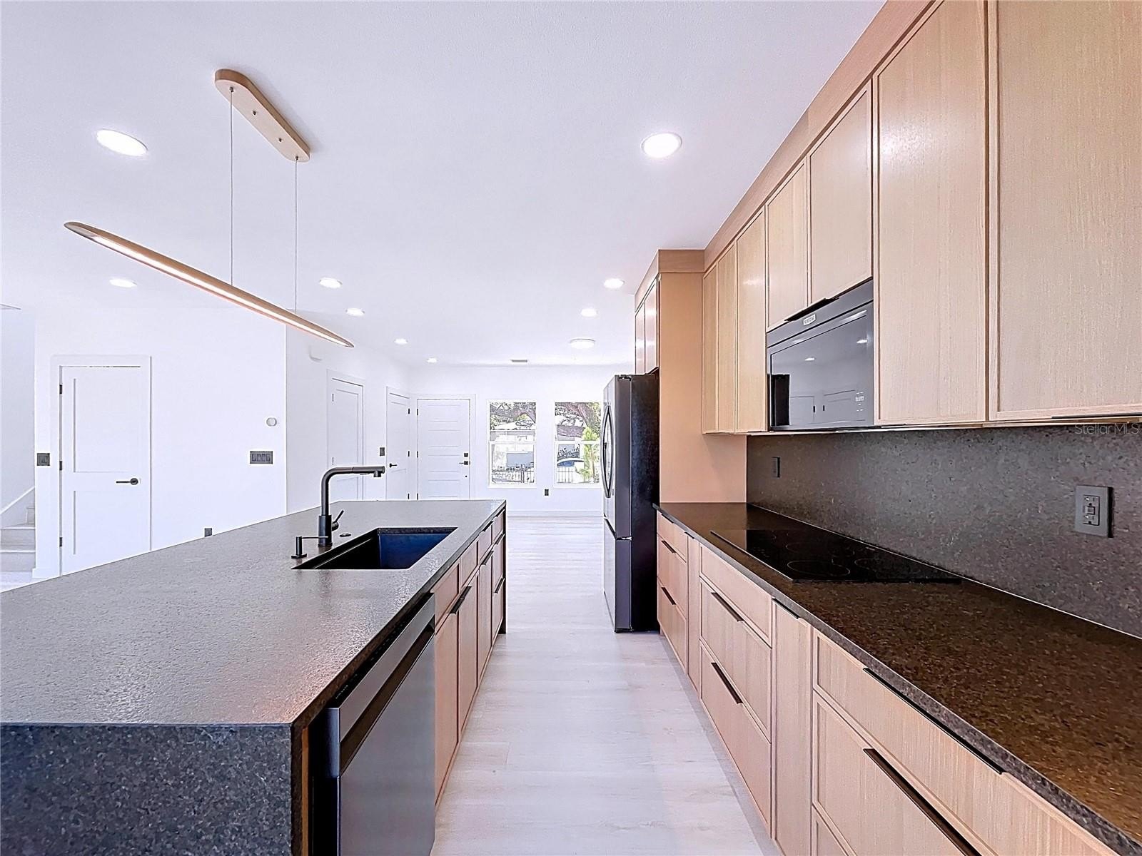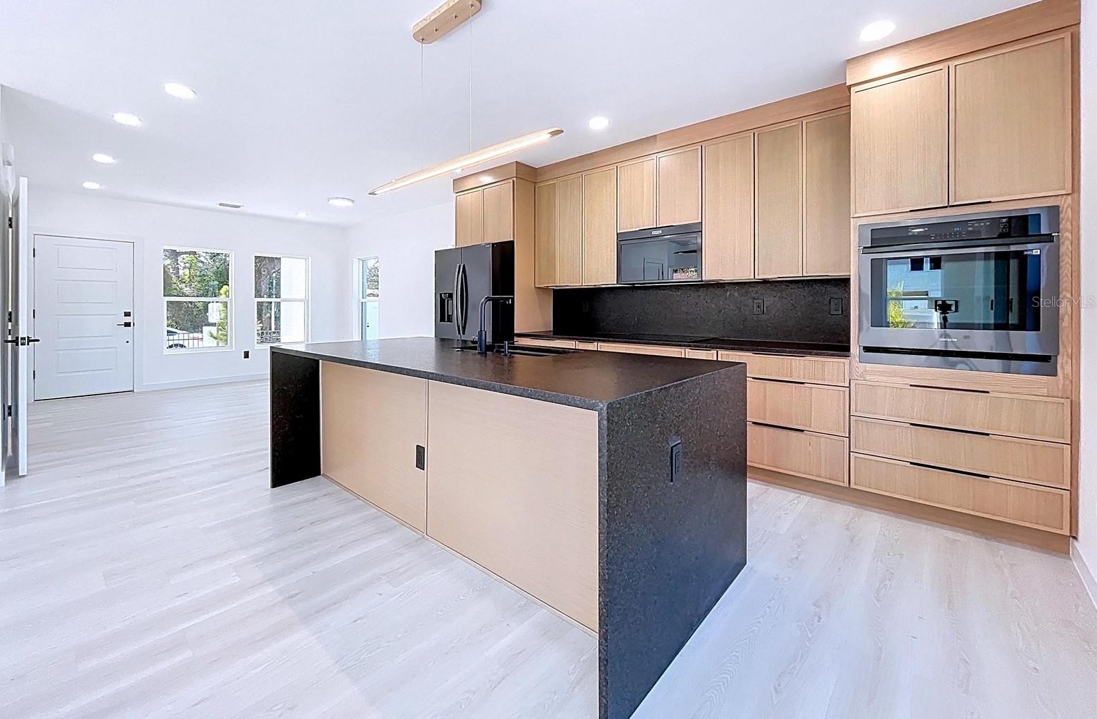 The kitchen has a modern and clean feel. There are solid wood cabinets up to the ceiling, soft-close drawers, and plenty of storage and motion activated under cabinets lights. The microwave is built in flush with cabinets, built-in wall oven with an induction cooktop, which keeps the kitchen looking neat. Everything is set up for convenience, not just for show. All appliances and ventless washer/dryer combo come with 5 years warranty.