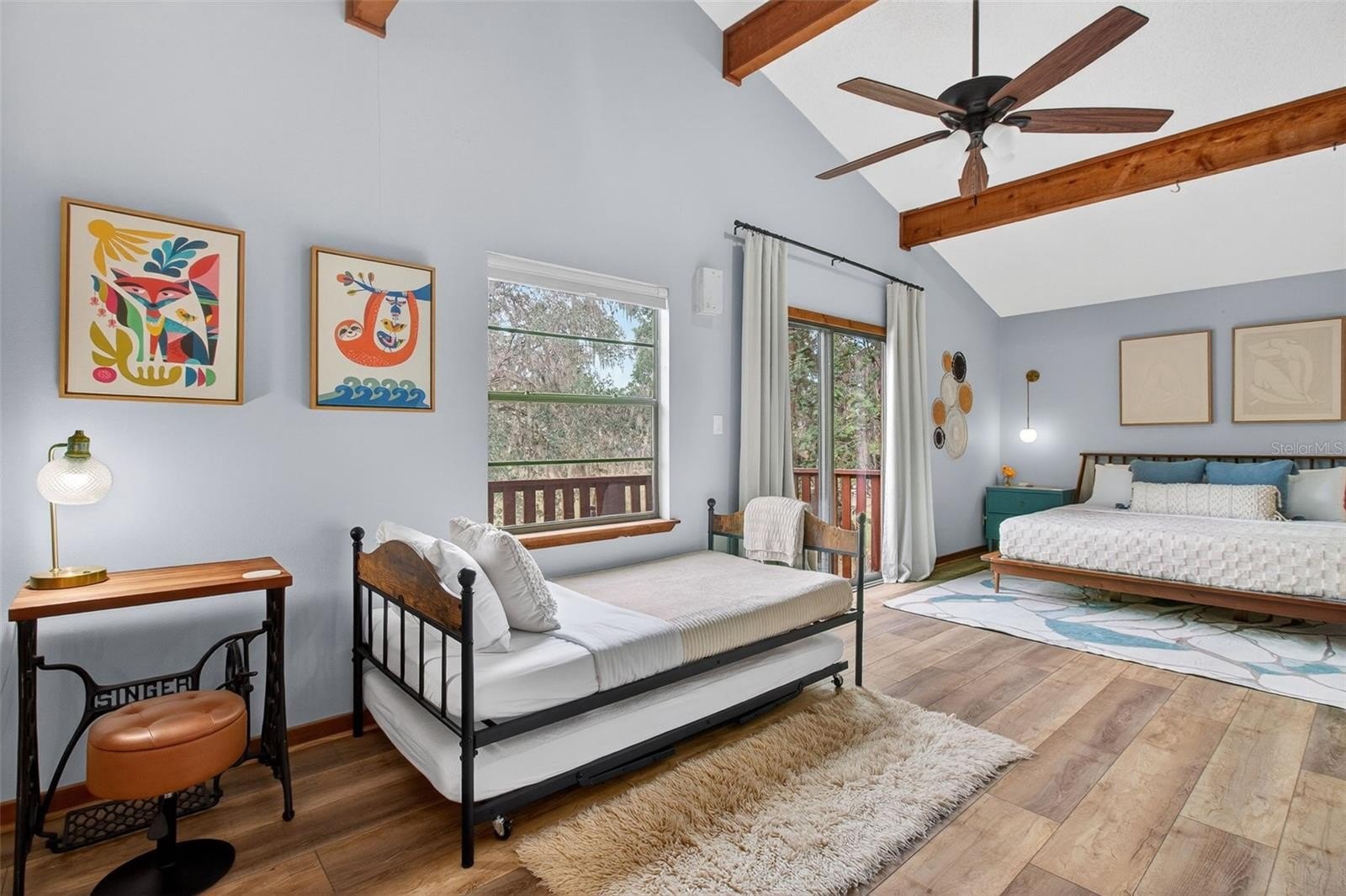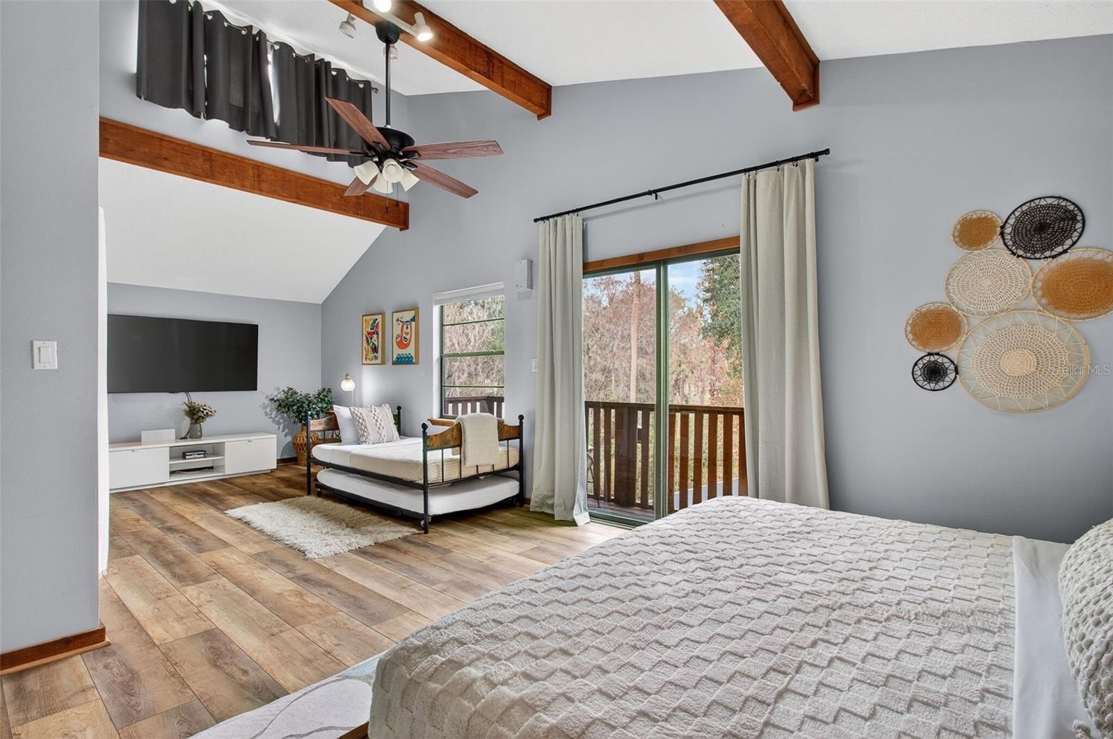 with one shared bathroom. Throughout the second and third floors, vaulted ceilings, exposed wood beams, and new
