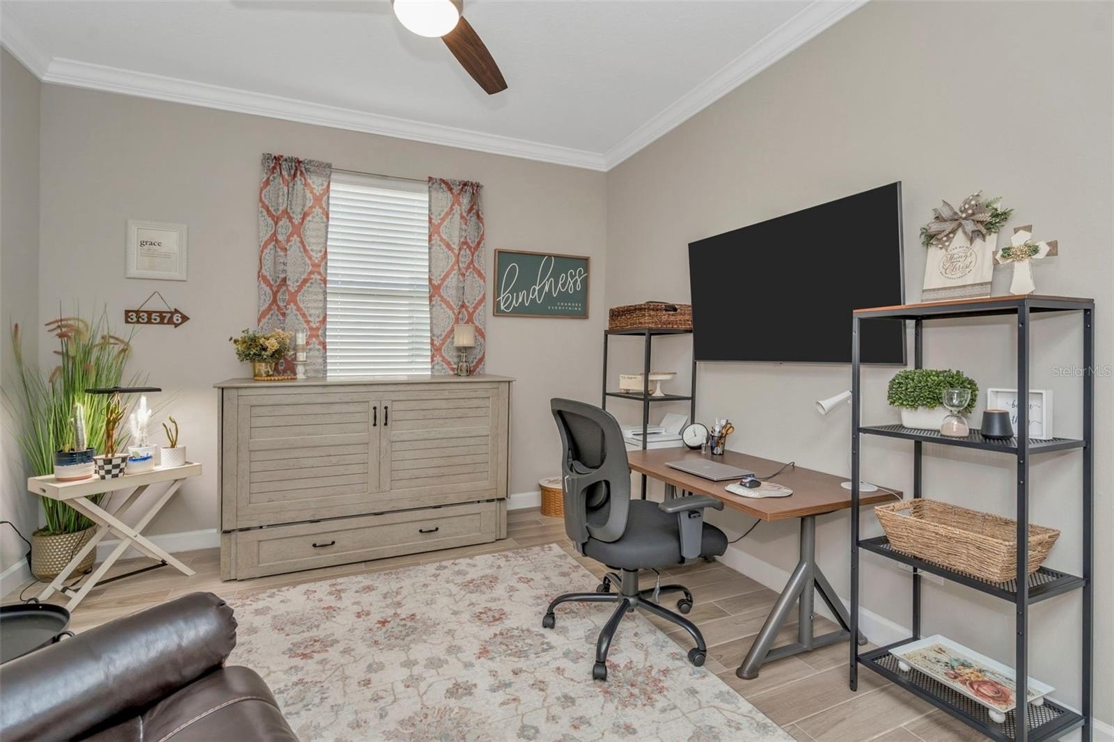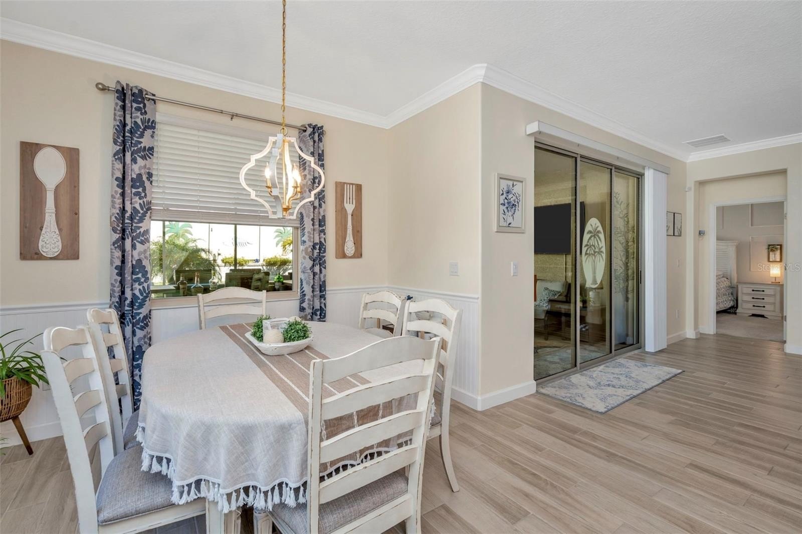 One of the home’s standout features is the enclosed, screened extended lanai, elegantly finished with custom pavers and designed as a true outdoor living destination. Complete with a mounted television and ample space for dining and lounging, this private retreat is ideal for alfresco meals, game-day gatherings, or relaxed evenings under the Florida sky—all overlooking a fully fenced, private backyard, offering both serenity and seclusion.