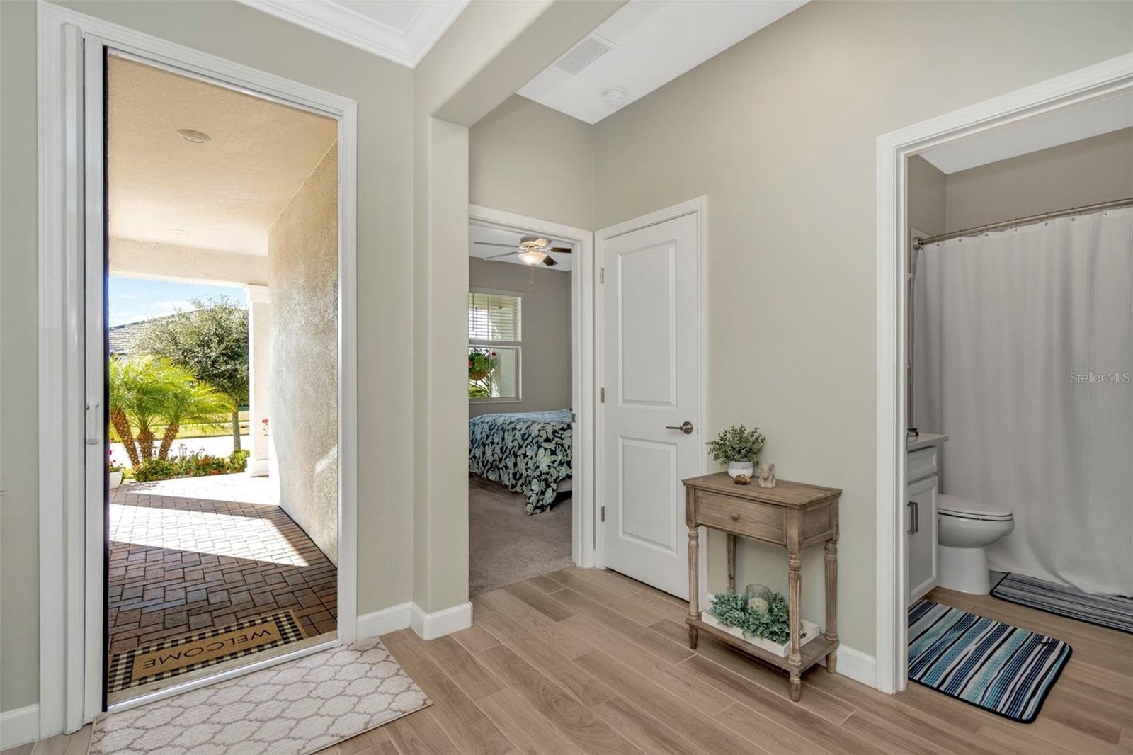 The plush and spacious primary suite serves as a private sanctuary, thoughtfully designed with both luxury and convenience in mind. The spa-inspired primary bath features a split dual vanity with generous counter space and a dedicated sit-down makeup area, a private water closet, and an extra-large custom tile and glass walk-in shower that delivers a true resort-style experience. The primary closet offers a seamless pass-through connection to the laundry room, adding everyday ease and thoughtful flow to the home’s design.