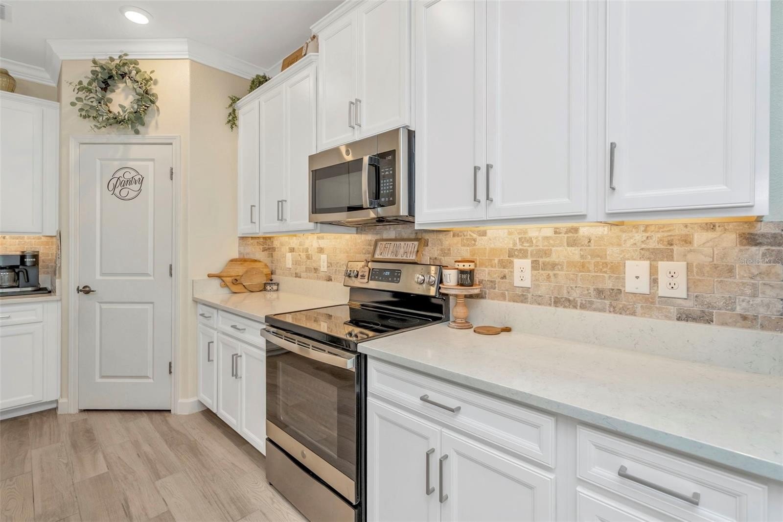 The home’s open-concept floor plan is elevated by carefully selected finishes, including stone countertops, designer wainscoting accents, a marble tile backsplash, and tile flooring throughout the main living areas, creating a clean, cohesive, and timeless aesthetic ideal for both daily living and entertaining.
