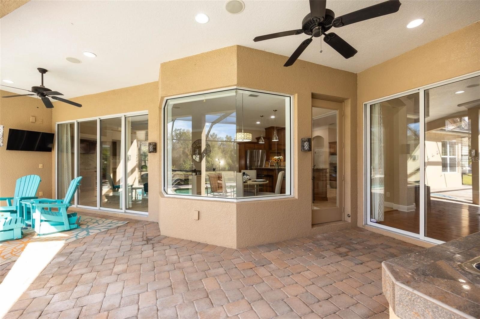 Outdoor living takes center stage with a large screened lanai overlooking the tranquil pond, complete with a heated pool and spa, pavered deck, and a covered seating area perfect for dining or relaxing. A fully equipped outdoor kitchen enhances the space, while the additional rear yard offers room to play or unwind amid mature landscaping and peaceful water views.